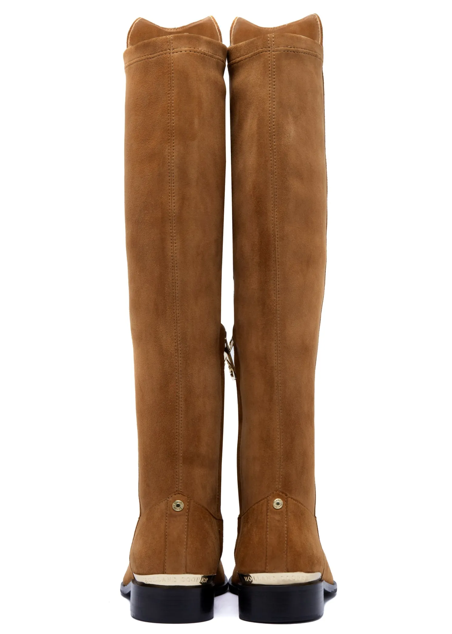 Created from premium suede, these slim boots contour to the leg for a streamlined style and fit. With a stretch back for comfort and a small block heel, these handmade boots are both comfortable and versatile. Designed with an internal zip for easy foot entry and detailed with gold branding to the side panel.