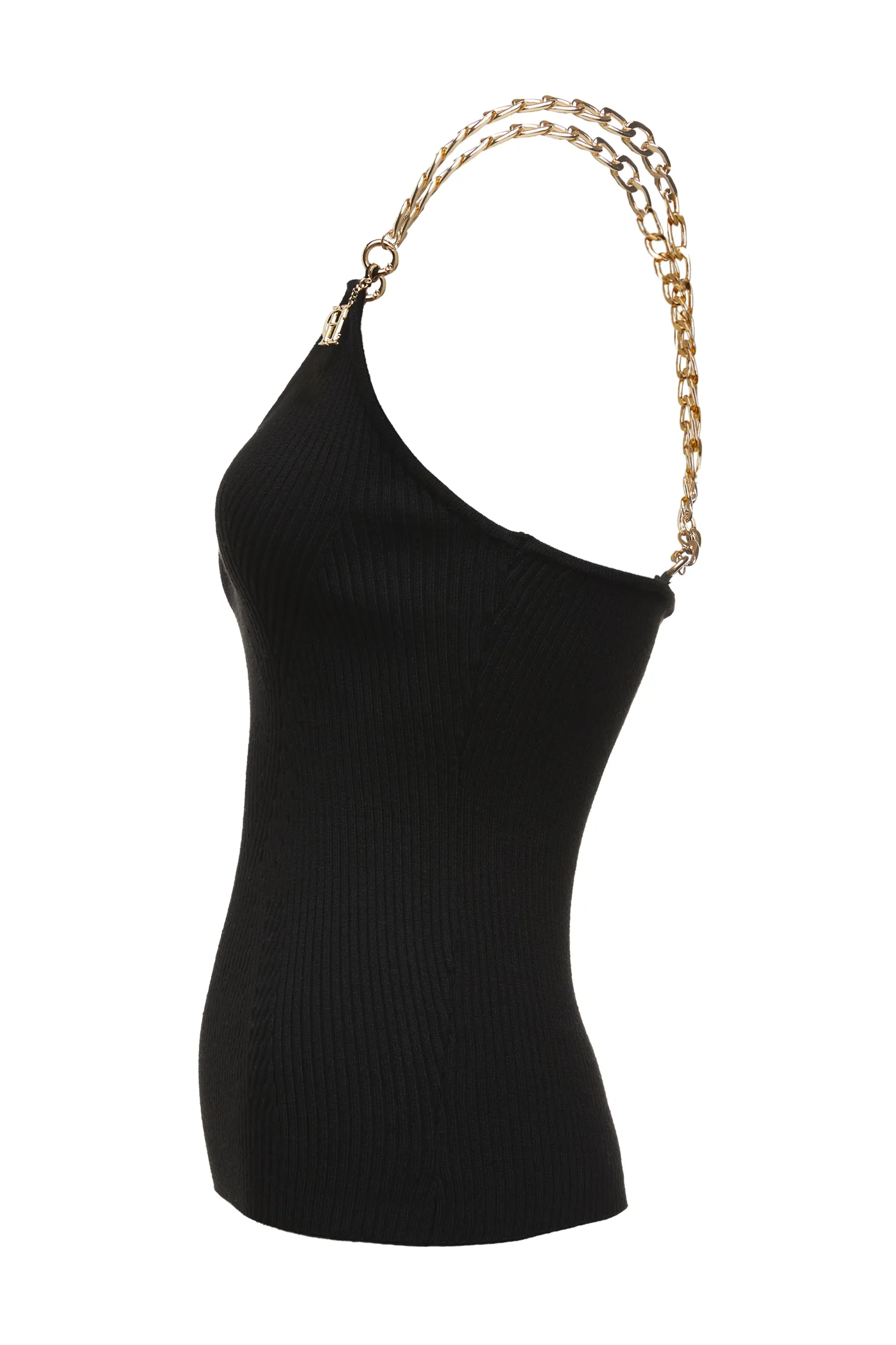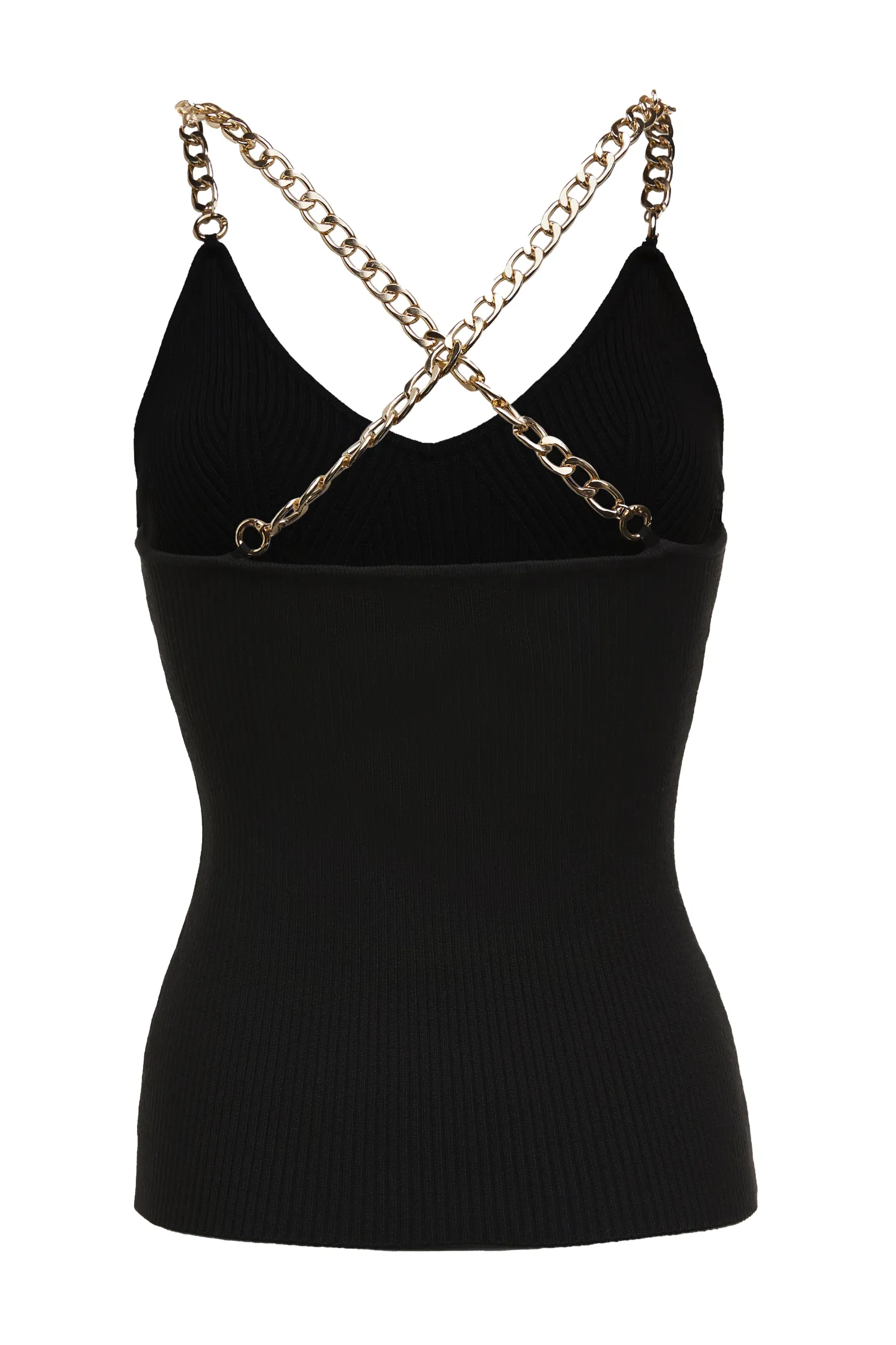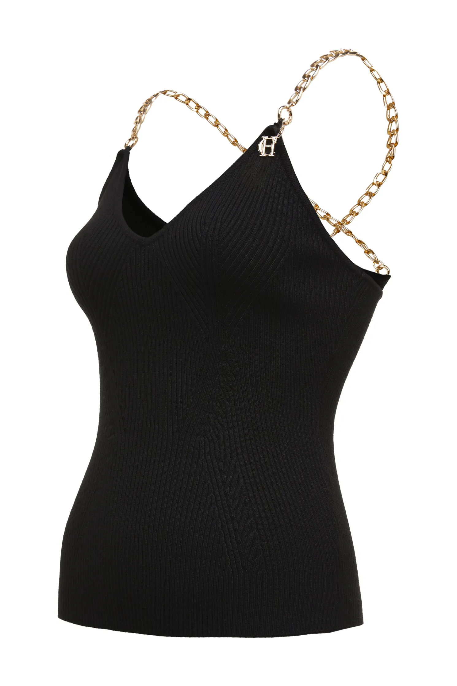 This beautiful V-neck cami is made from a soft ribbed-knit that hugs your frame for a streamlined fit. Embellished with gold-tone chain straps that drape across the open back with a HC charm.