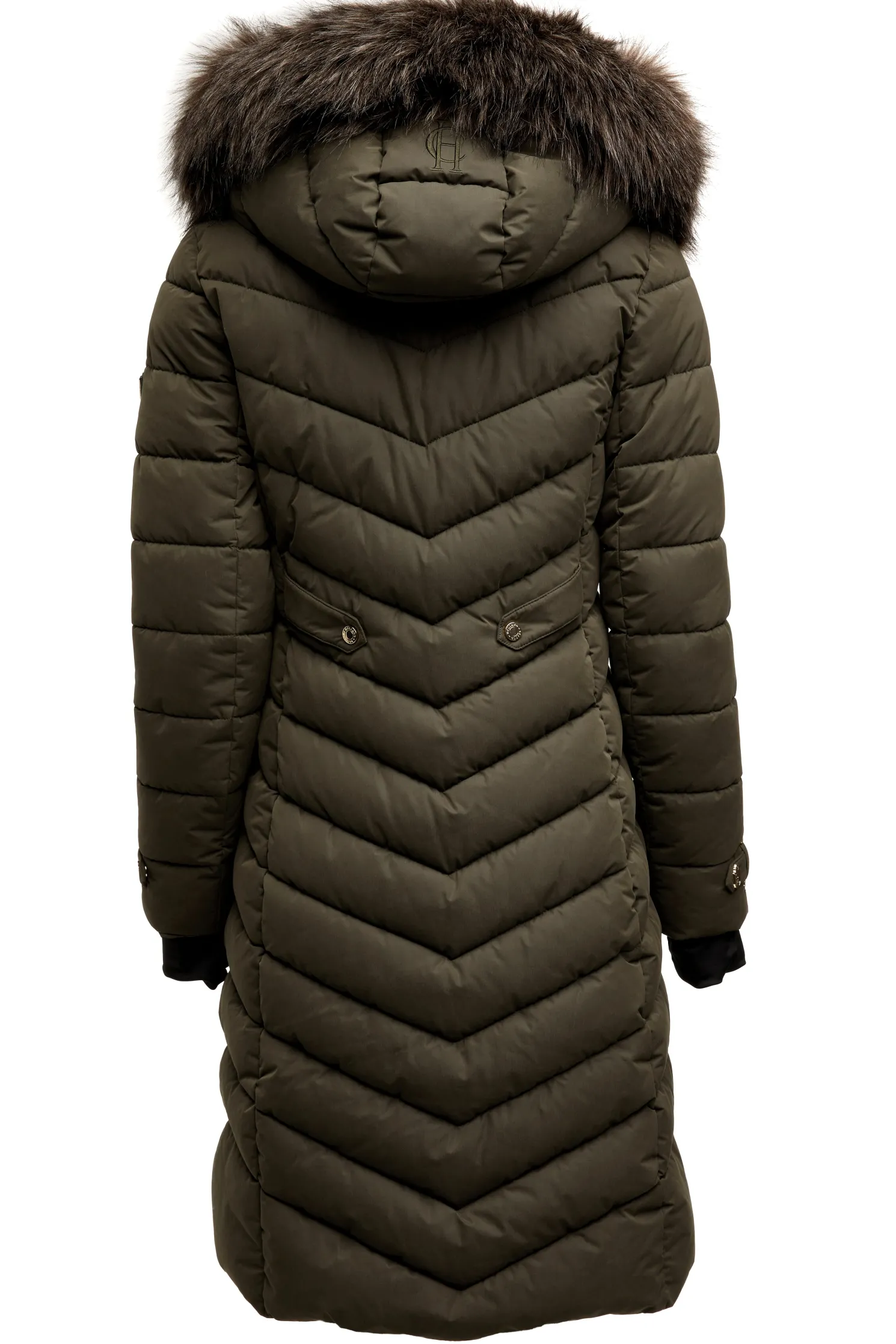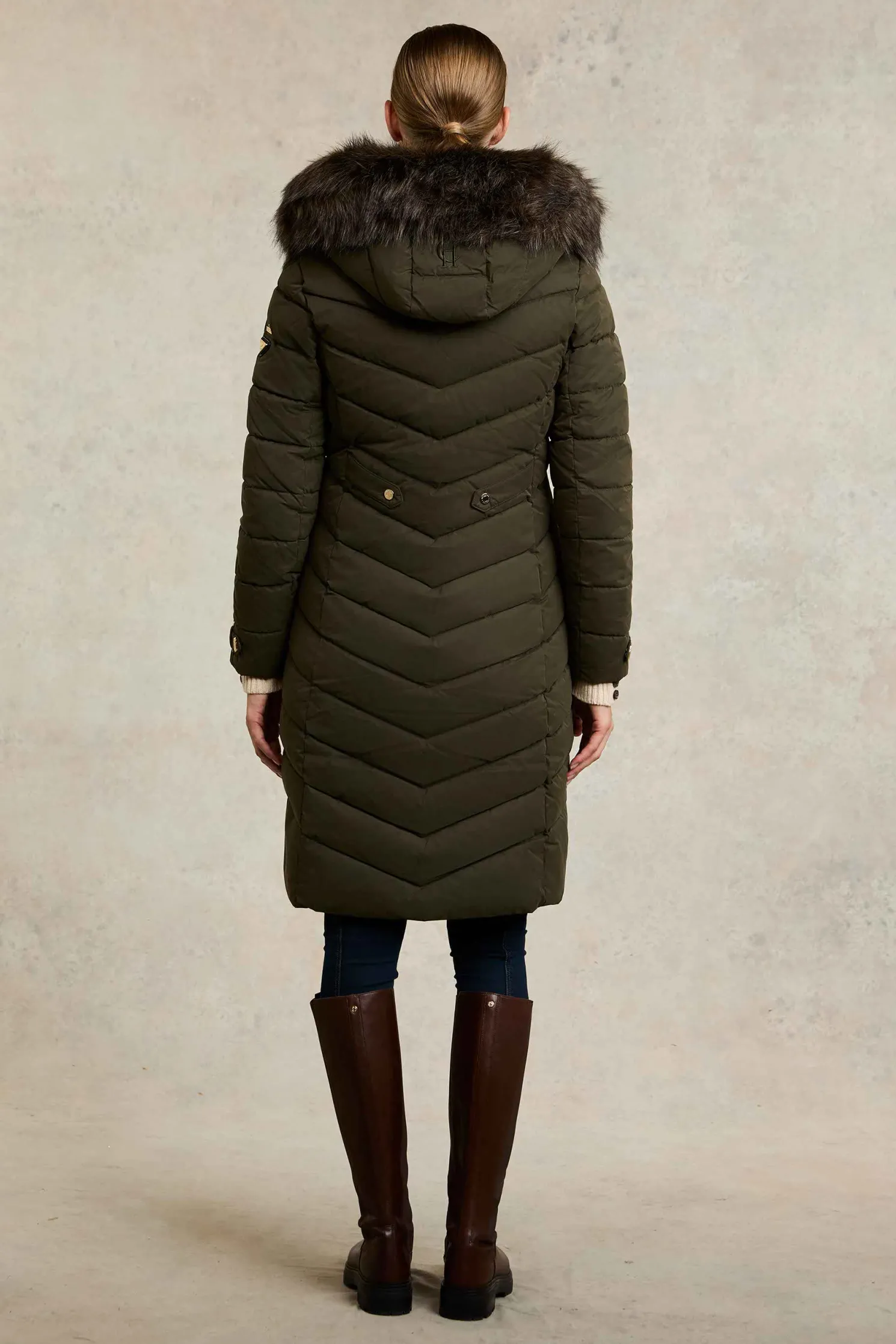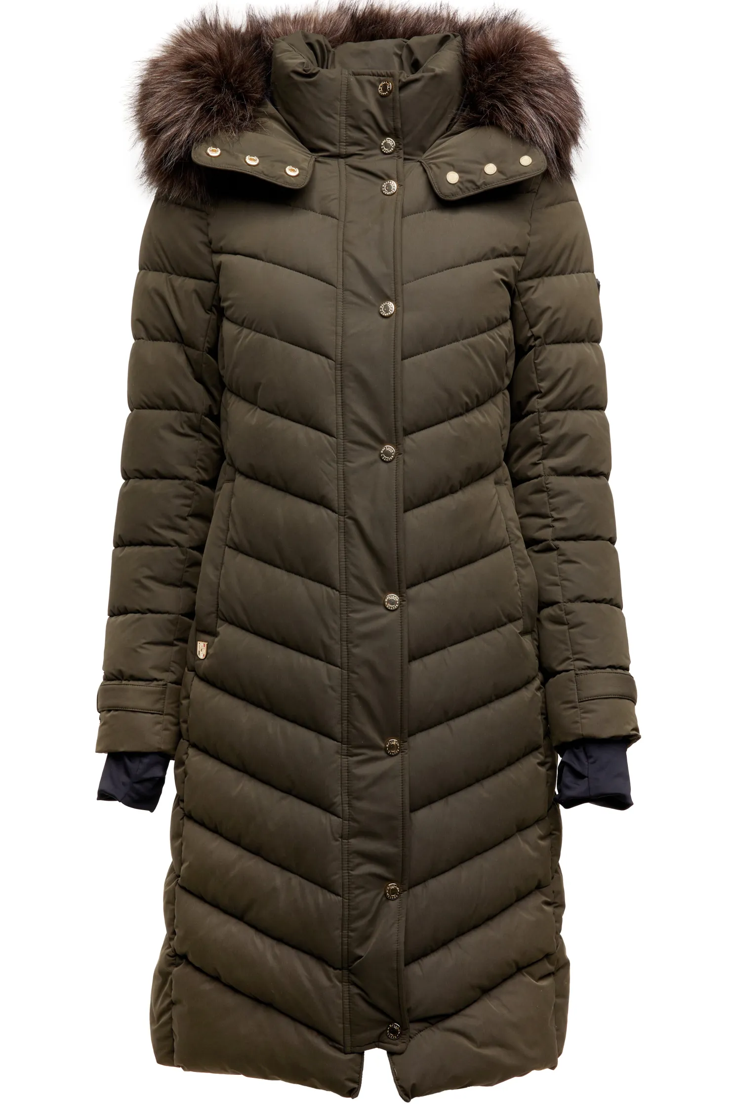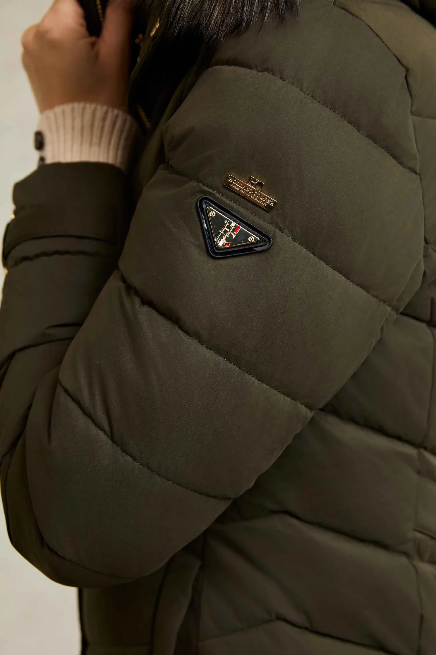 This durable coat has been filled with a premium eco fill to ensure ultimate warmth during those colder months. With detachable faux fur and detailed with our iconic gold hardware, this coat will elevate your winter wardrobe. Finished with two pockets to the hip and a two-way zip with a storm guard.