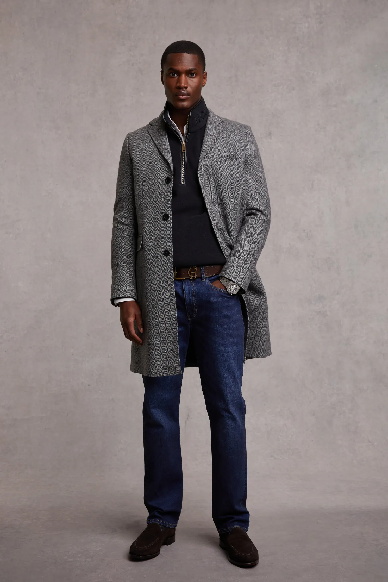 Expertly crafted from technical polar fleece fabric with a half centre zip, this piece has been designed to layer and ensure style on the coldest of days. Detailed with faux leather piping and subtle HC embroidery to the chest, the hidden seamed pockets ensure a smooth and clean fit when worn. Elevated with our iconic antique brass fastenings and metal hardware to finish the look. Layer under our Cheltenham Coat for a classic and British look.