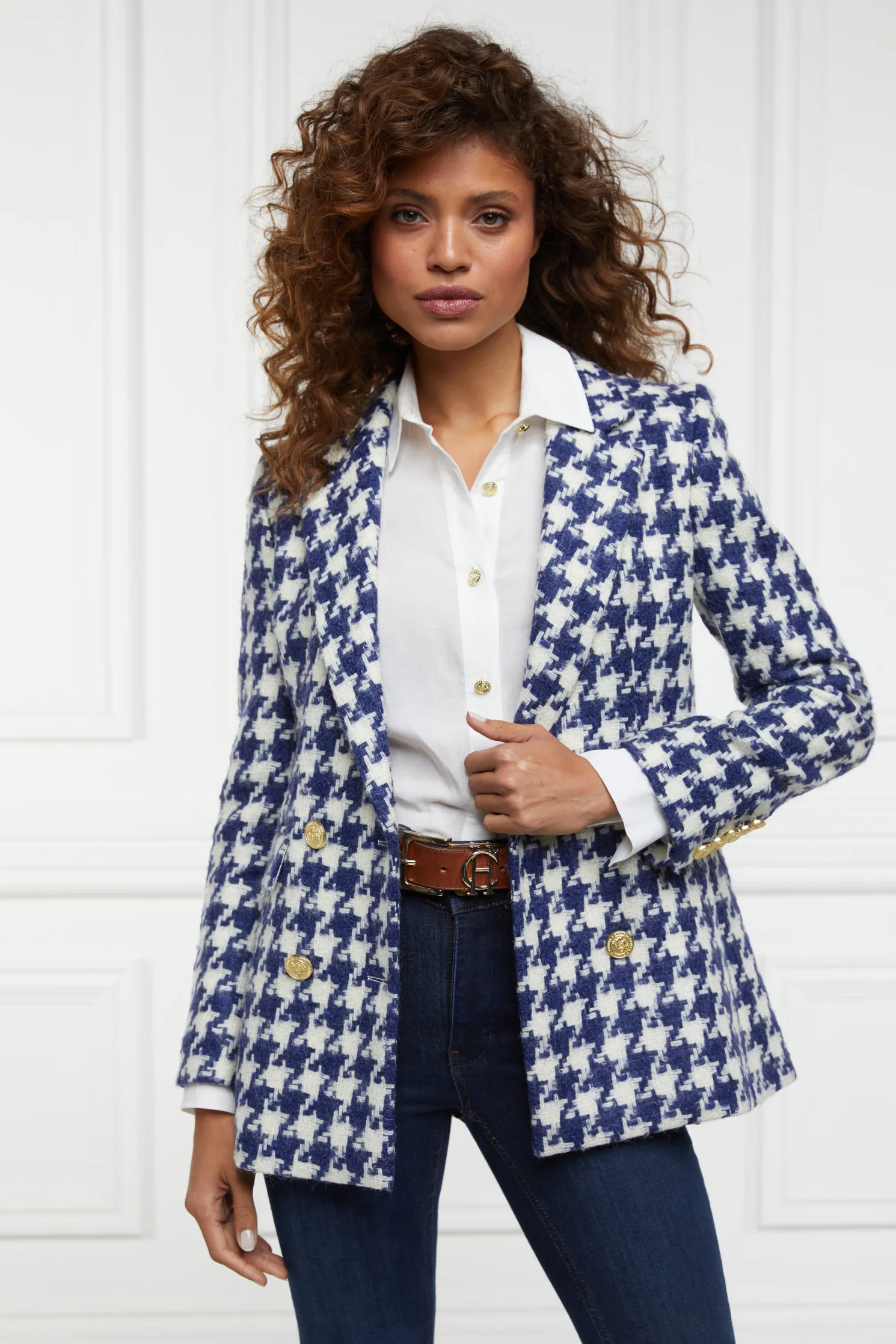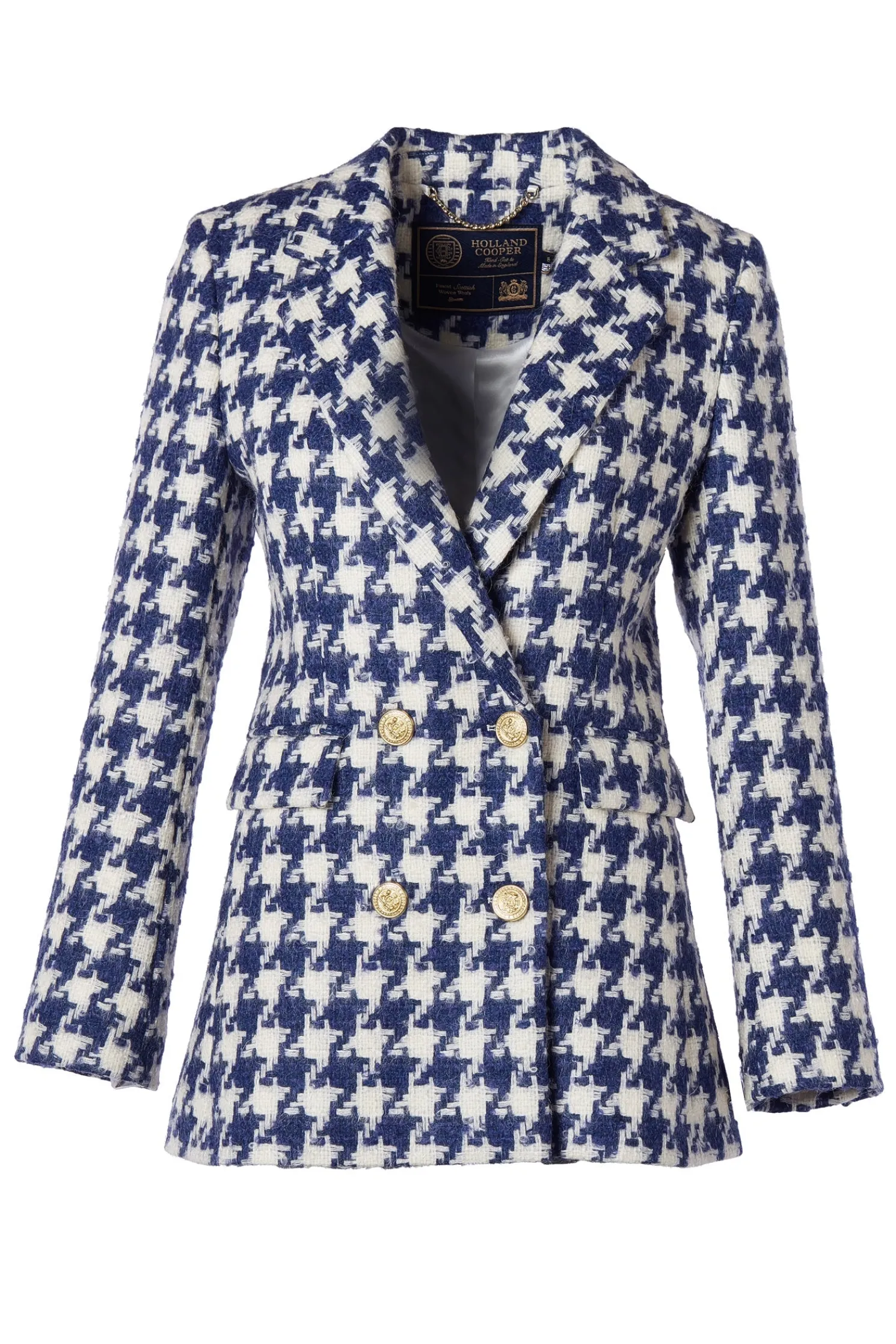 Designed to create a sharp tailored silhouette worn open or closed, the Double Breasted wool blazer has been handmade in the UK. Crafted from our statement houndstooth fabric & fully lined with a luxury stretch lining for extra comfort, this piece is a must-have staple for your wardrobe. With bold lapels & subtle hip pockets, each blazer has been elevated with HC signature gold hardware to the front and cuffs.