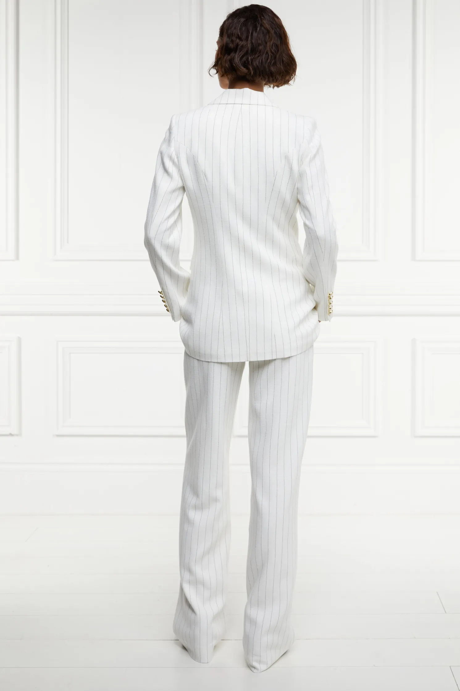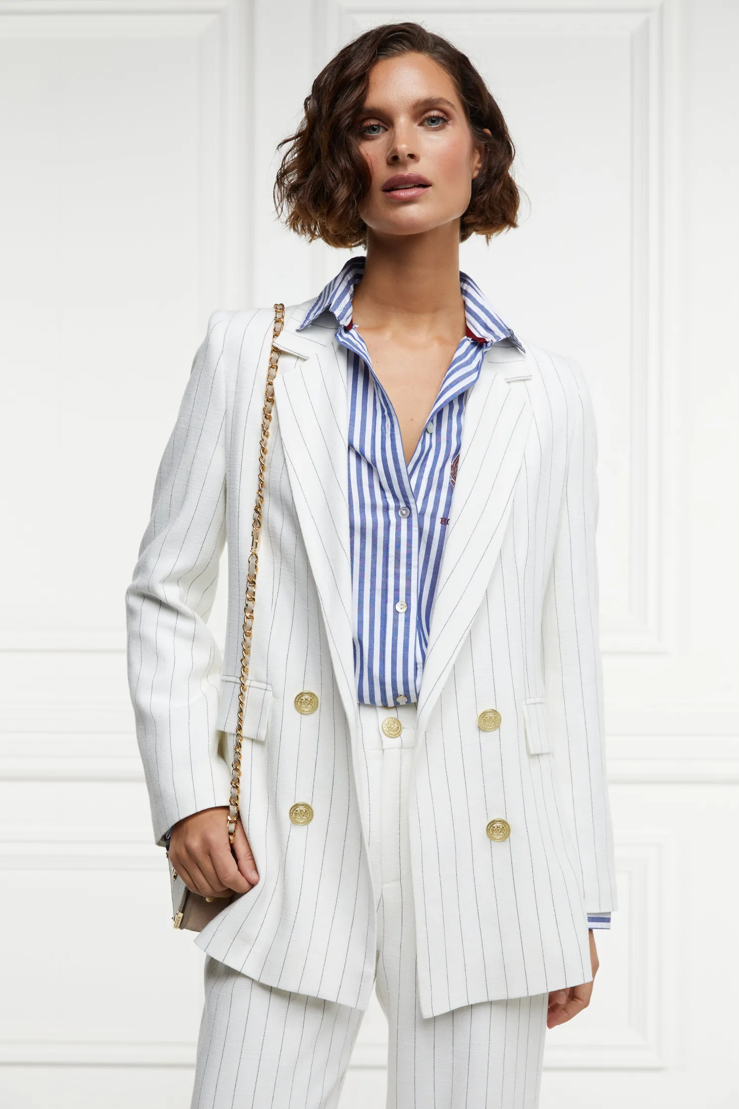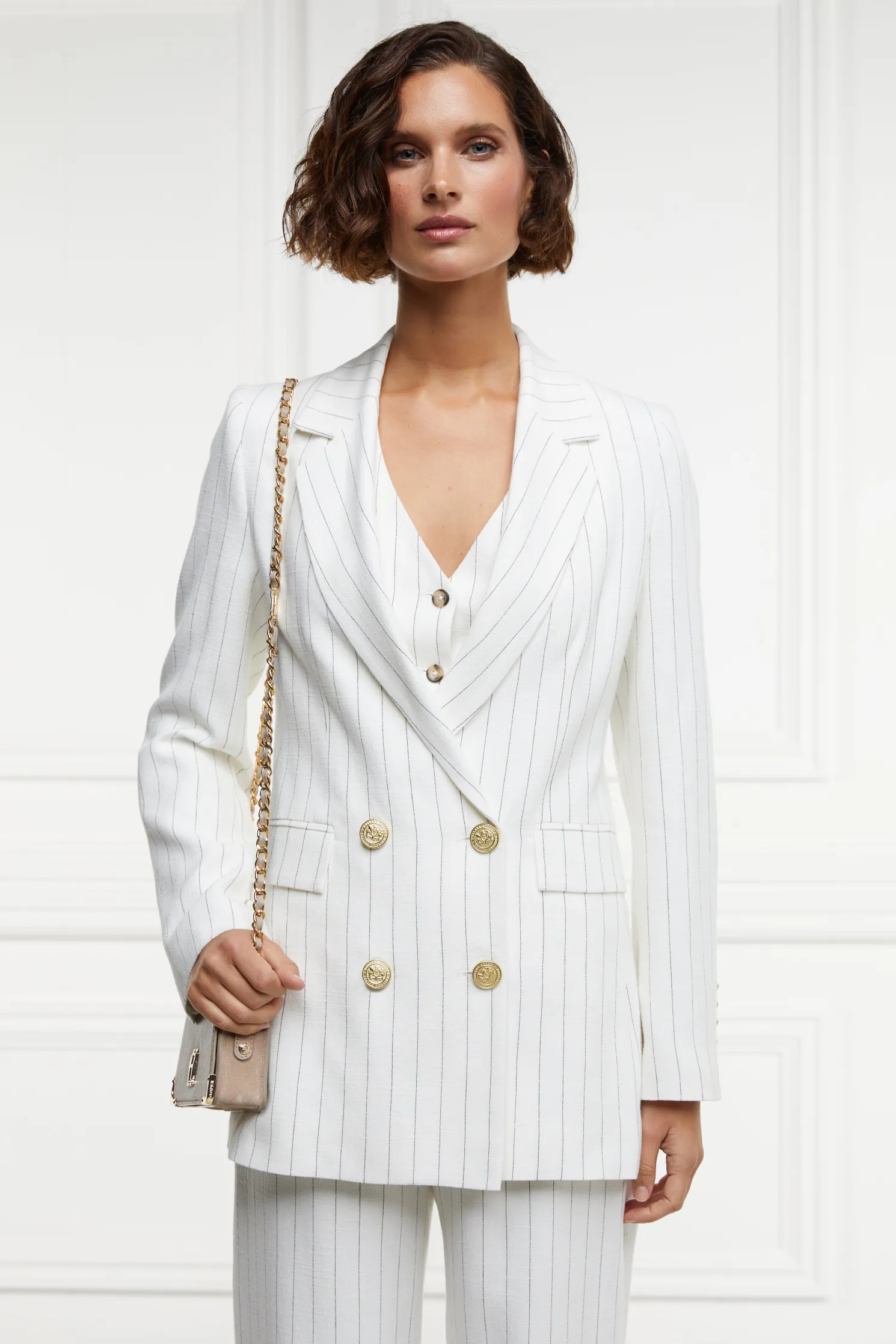 Designed to create a sharp tailored silhouette worn open or closed, the Double Breasted Linen Blazer has been handmade in the UK. Crafted from a crease-resistant, lightweight and breathable linen blend & fully lined with a luxury stretch lining for extra comfort, this piece is a must-have for your summer wardrobe. Elevated with our signature gold hardware to the front and cuffs.