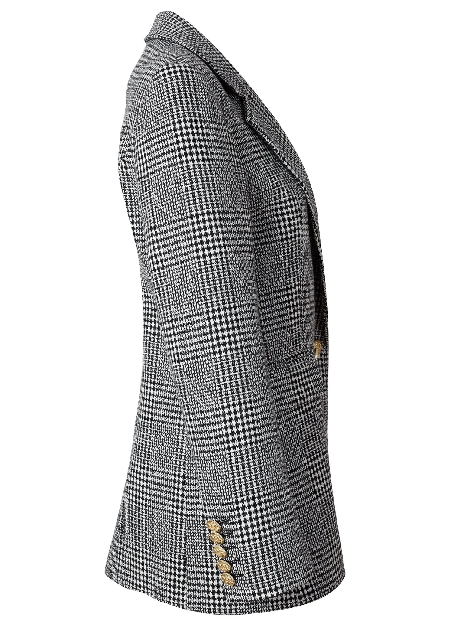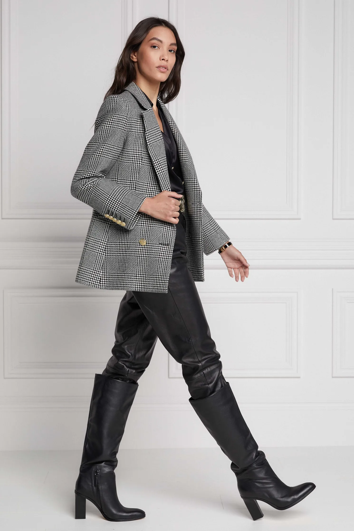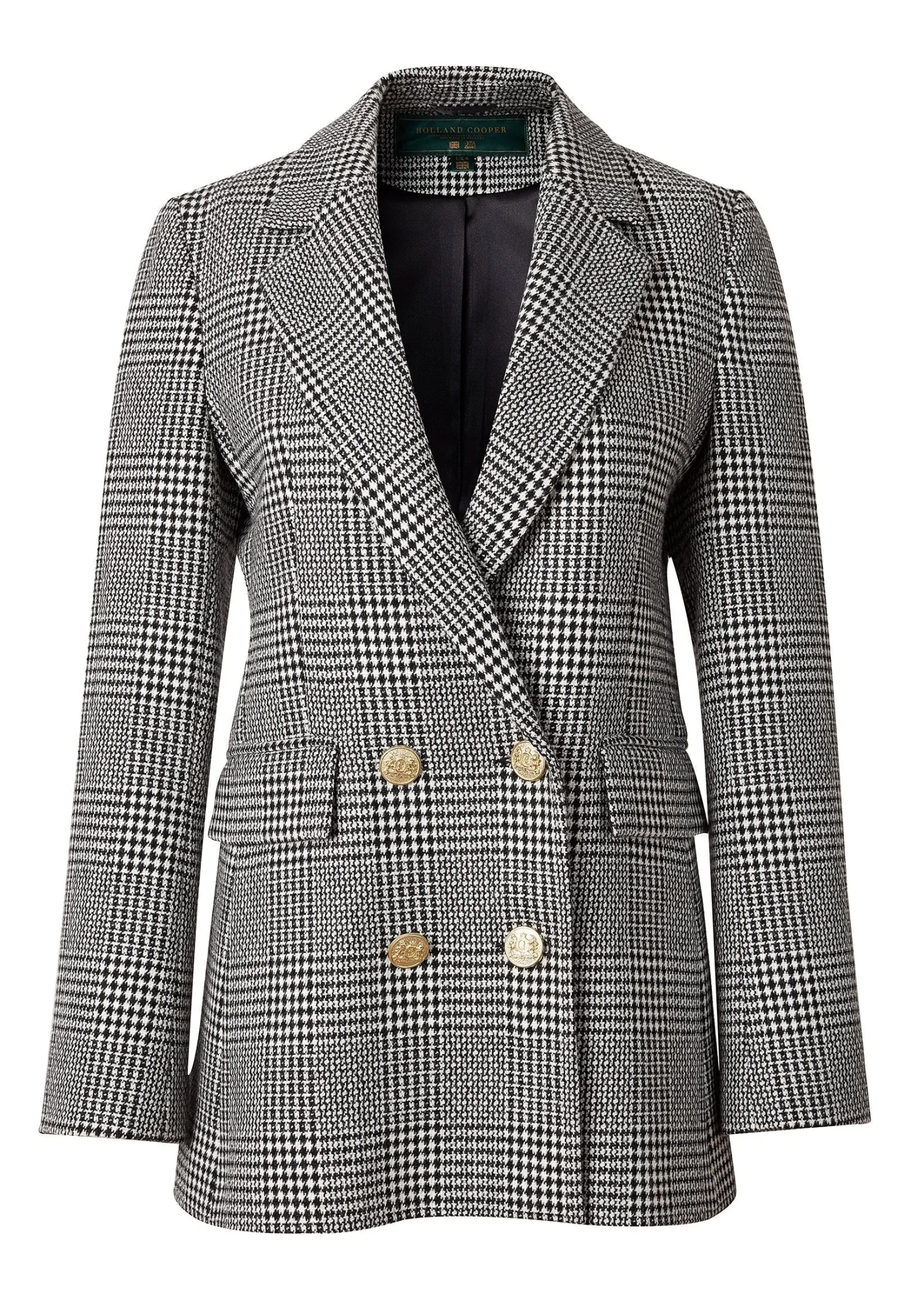 This longline double breasted wool blazer is a chic trans-seasonal forever wardrobe essential. Designed to create a sharp tailored silhouette worn open or closed. Fully lined with a luxury stretch lining for extra comfort and adorned with HC signature Gold buttons on the front and cuffs. This blazer has been hand cut and made entirely in England using wools woven in the UK.