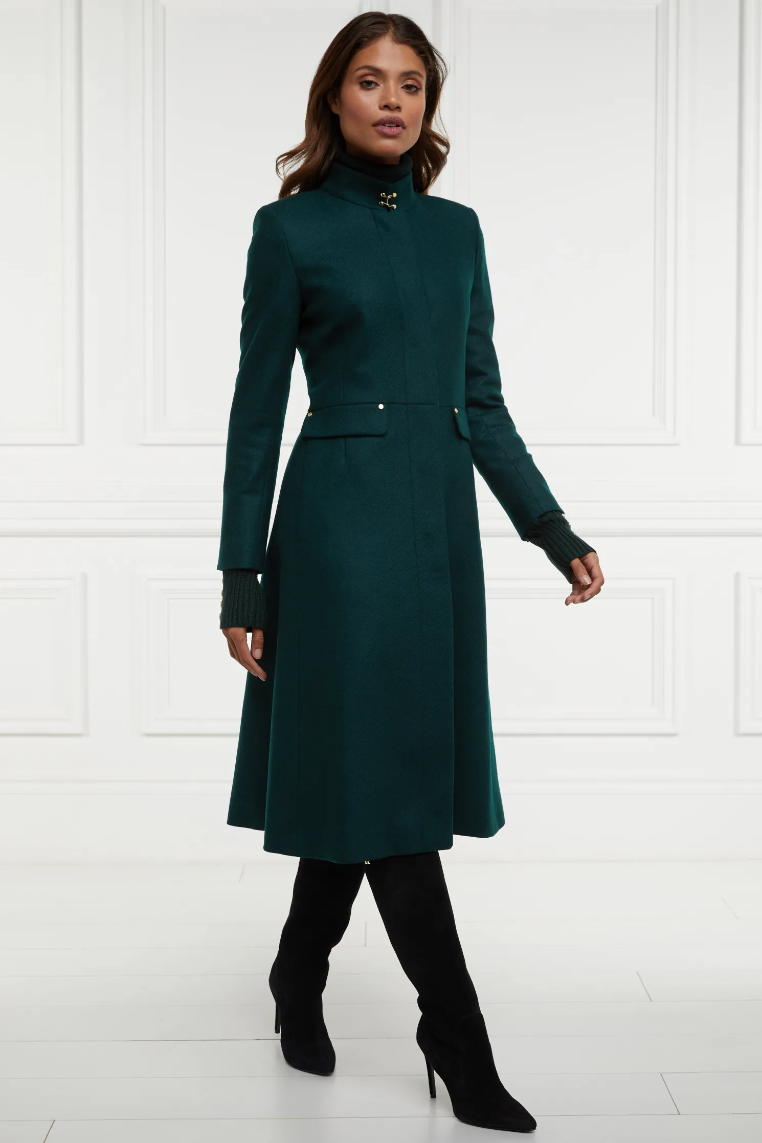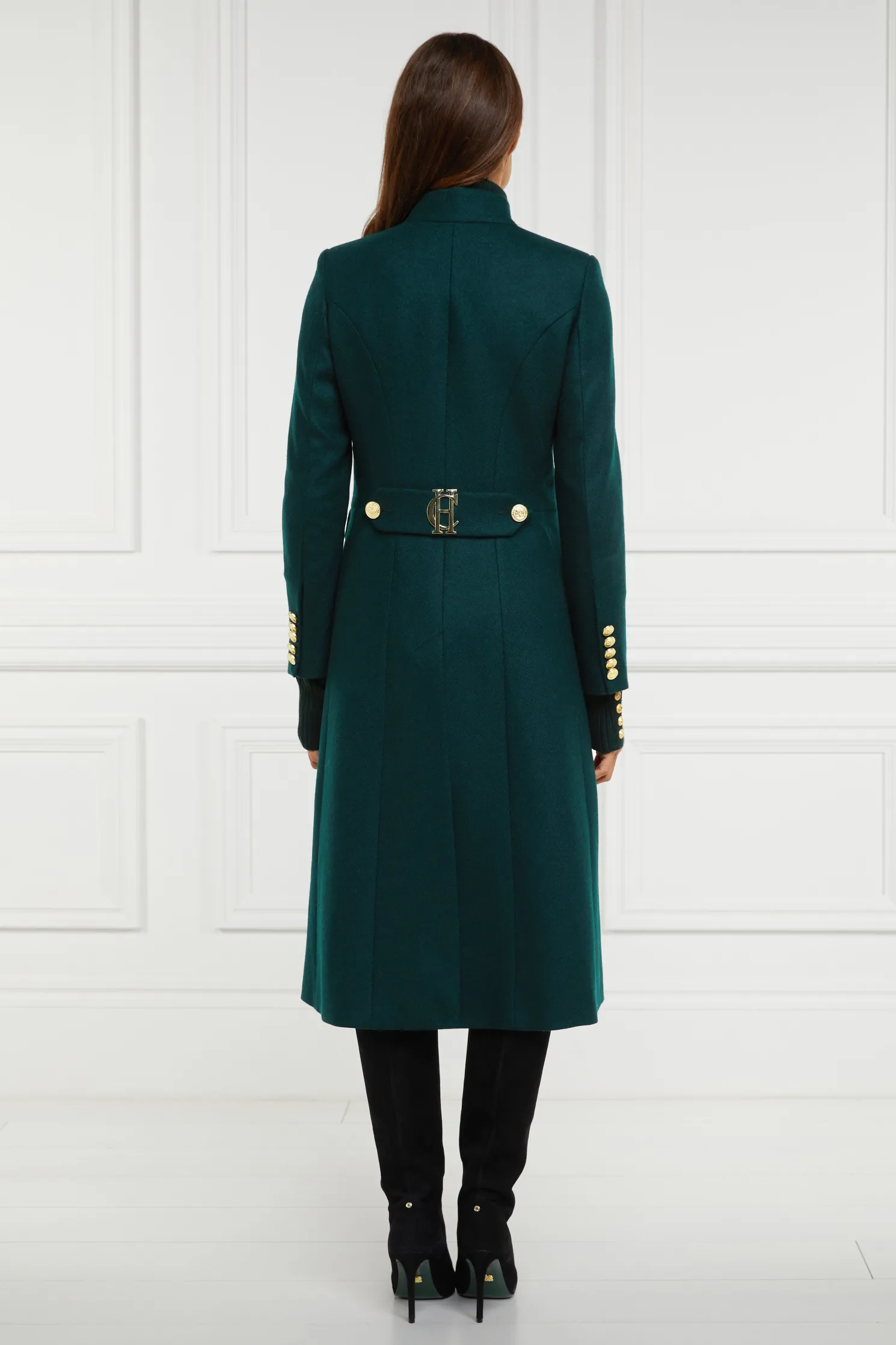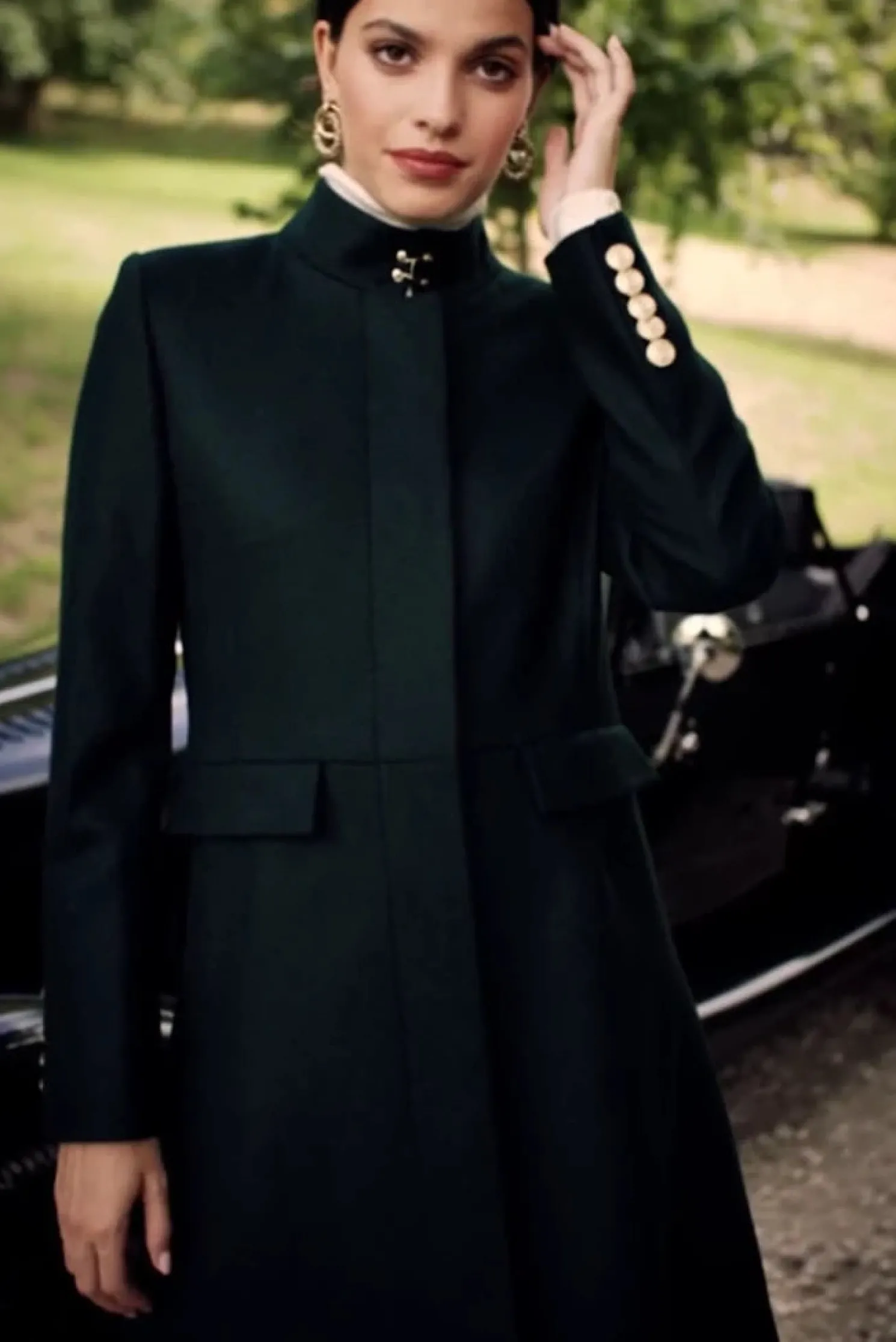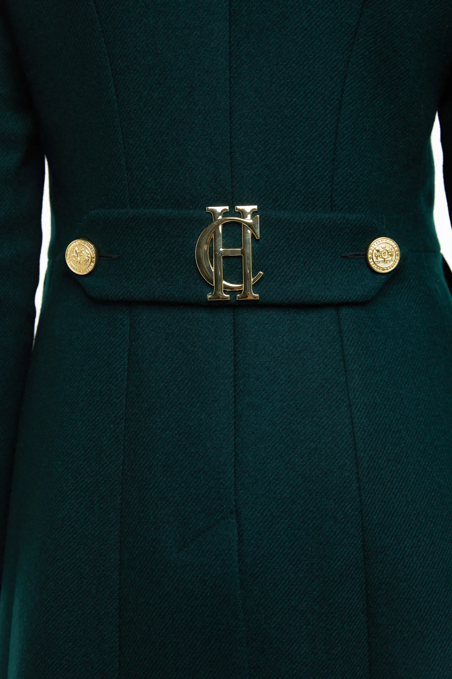 Perfectly capturing understated elegance, the Dowdeswell Coat offers a tailored silhouette with an exceptional fit and flare shape. Designed with clean lines, the elegant fitted back has been beautifully centred around a decorative HC back buckle. With dual entry lower pockets, this piece has been detailed with a high neck hook and eye closure and finished throughout with our signature gold hardware.