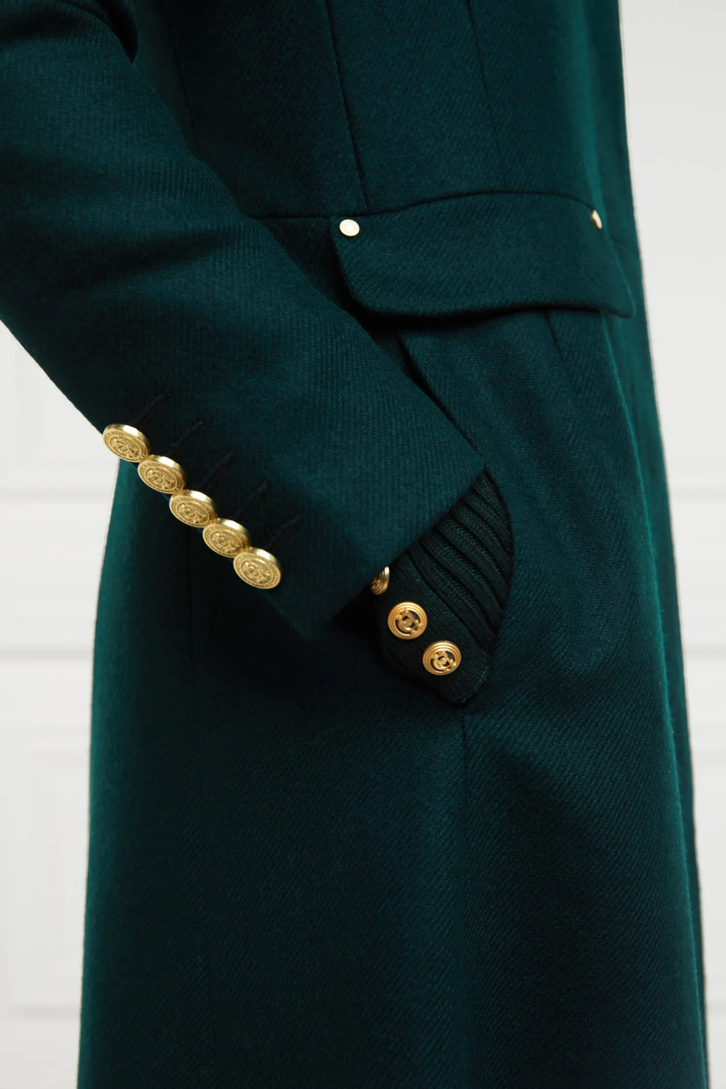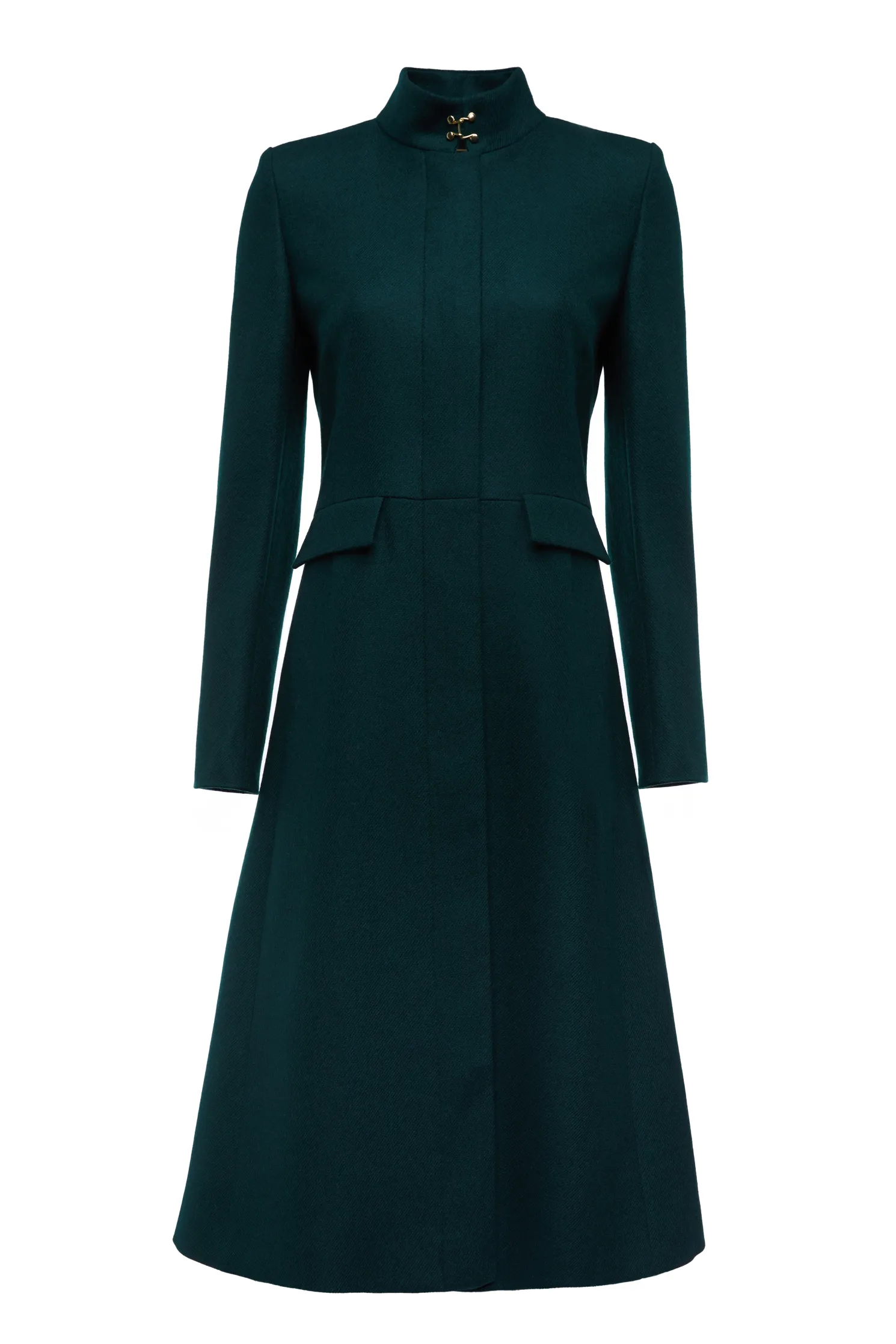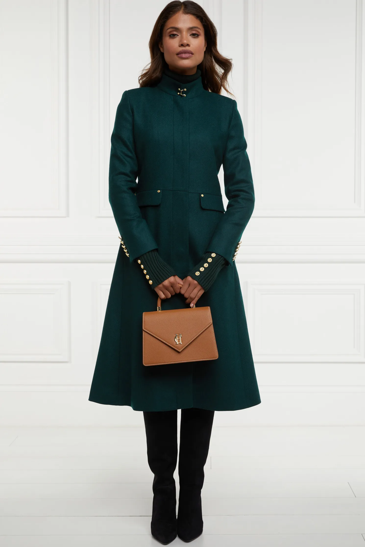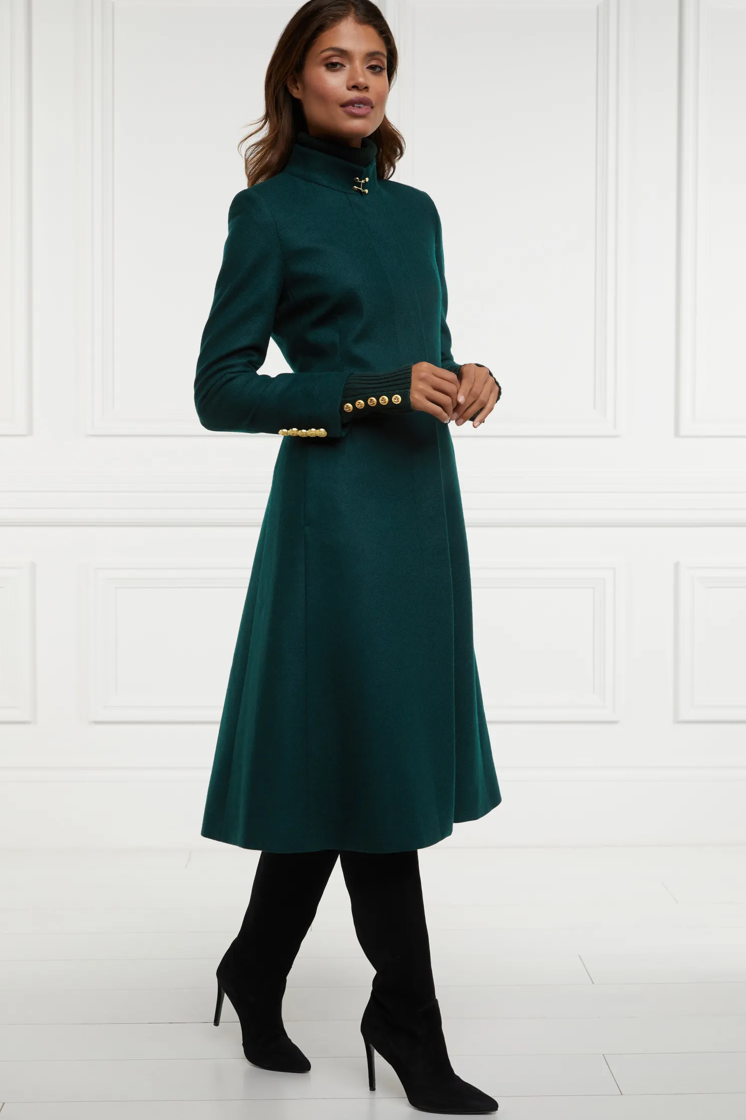 Perfectly capturing understated elegance, the Dowdeswell Coat offers a tailored silhouette with an exceptional fit and flare shape. Designed with clean lines, the elegant fitted back has been beautifully centred around a decorative HC back buckle. With dual entry lower pockets, this piece has been detailed with a high neck hook and eye closure and finished throughout with our signature gold hardware.