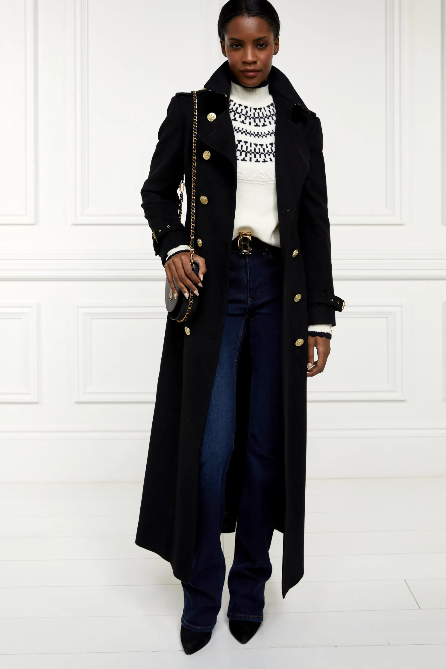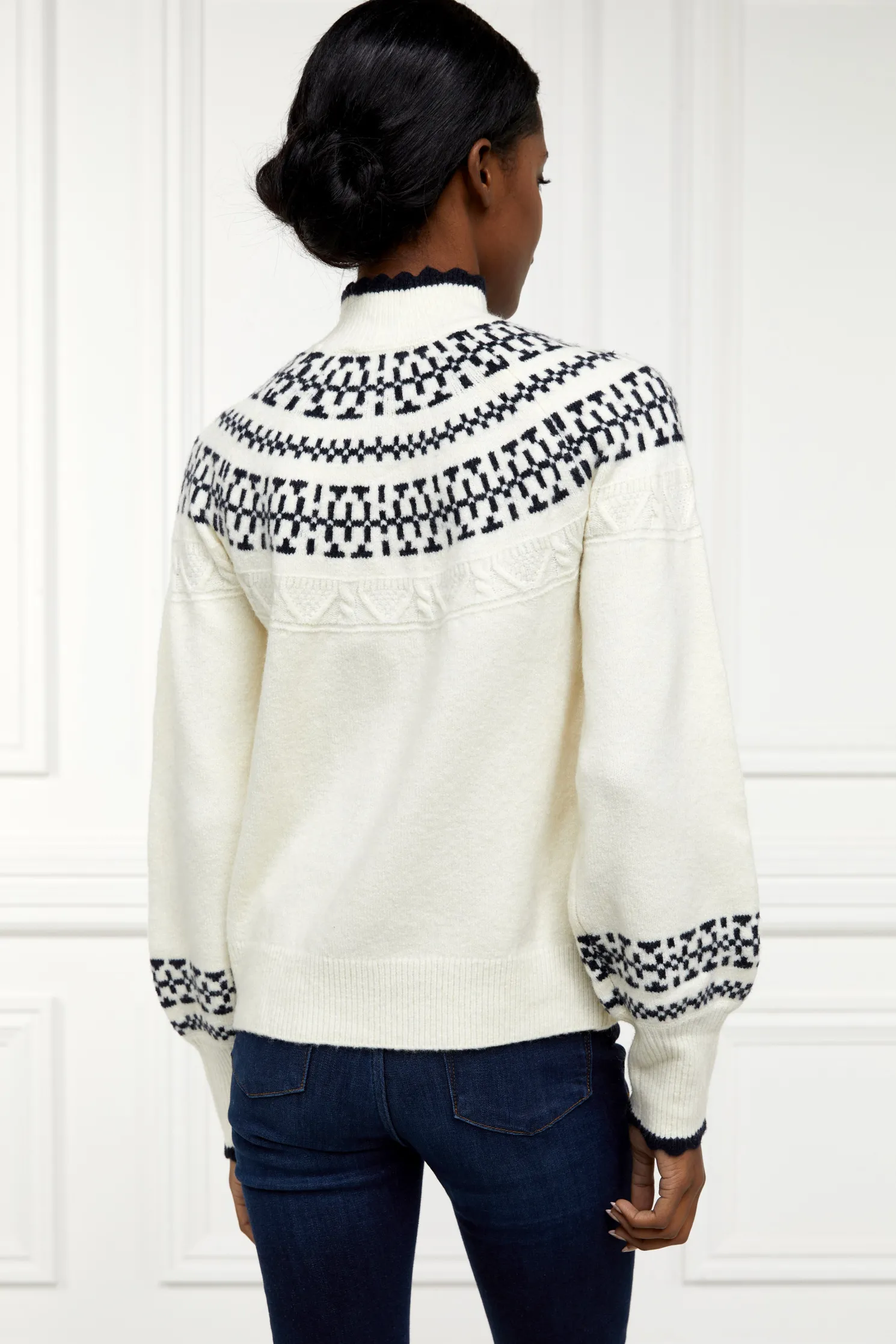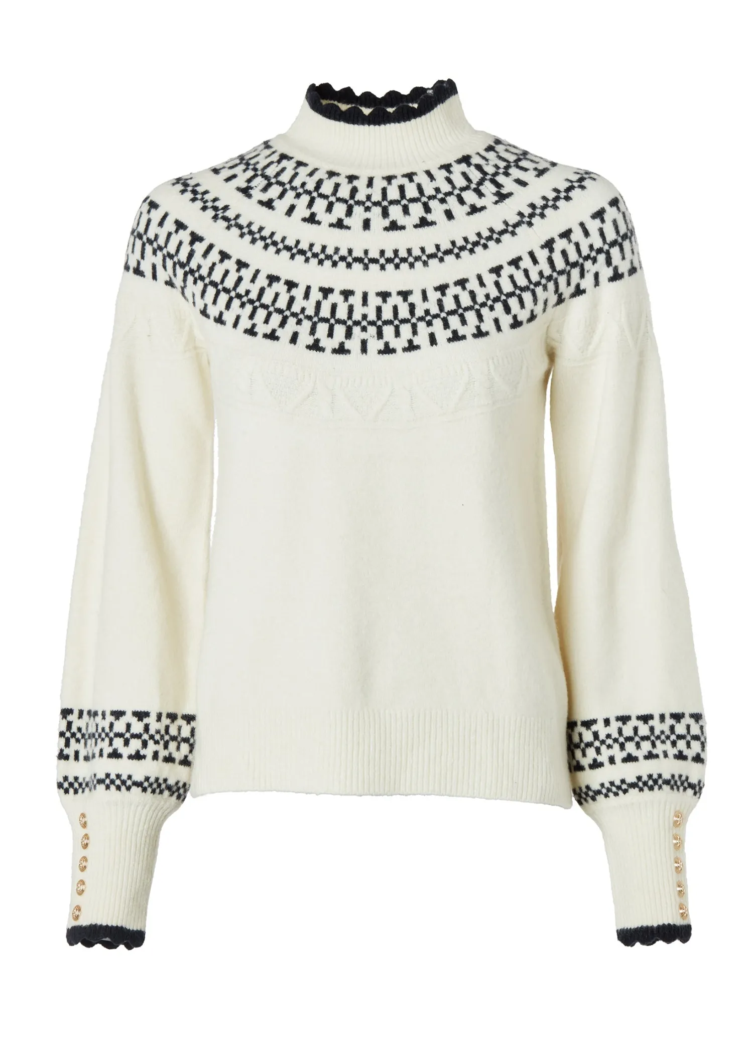 The Elodie Roll Neck Knit combines timeless style with intricate detailing. Featuring a classic Fair Isle pattern with cable detailing and voluminous, feminine raglan sleeves , this knit offers a cozy, yet refined look. The roll neck is accented with contrast scallop edging, adding a unique touch, while signature hardware on the cuffs completes the piece with a touch of sophistication. Ideal for layering or wearing on its own, this knit is a perfect blend of comfort and elegance.