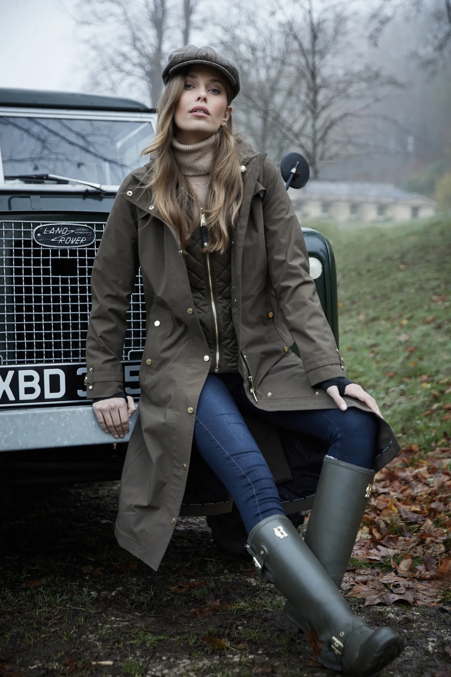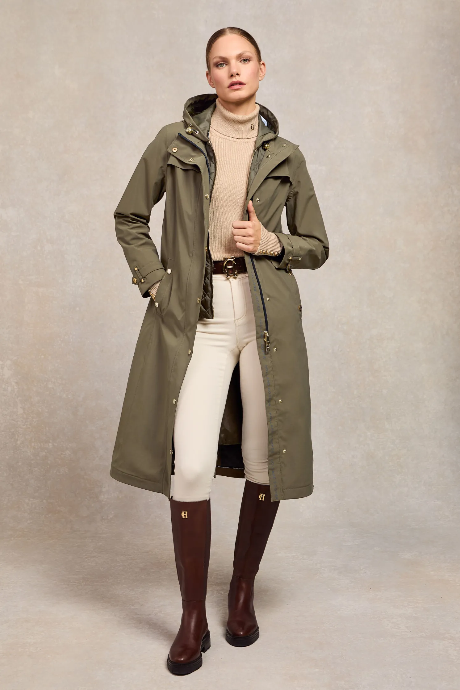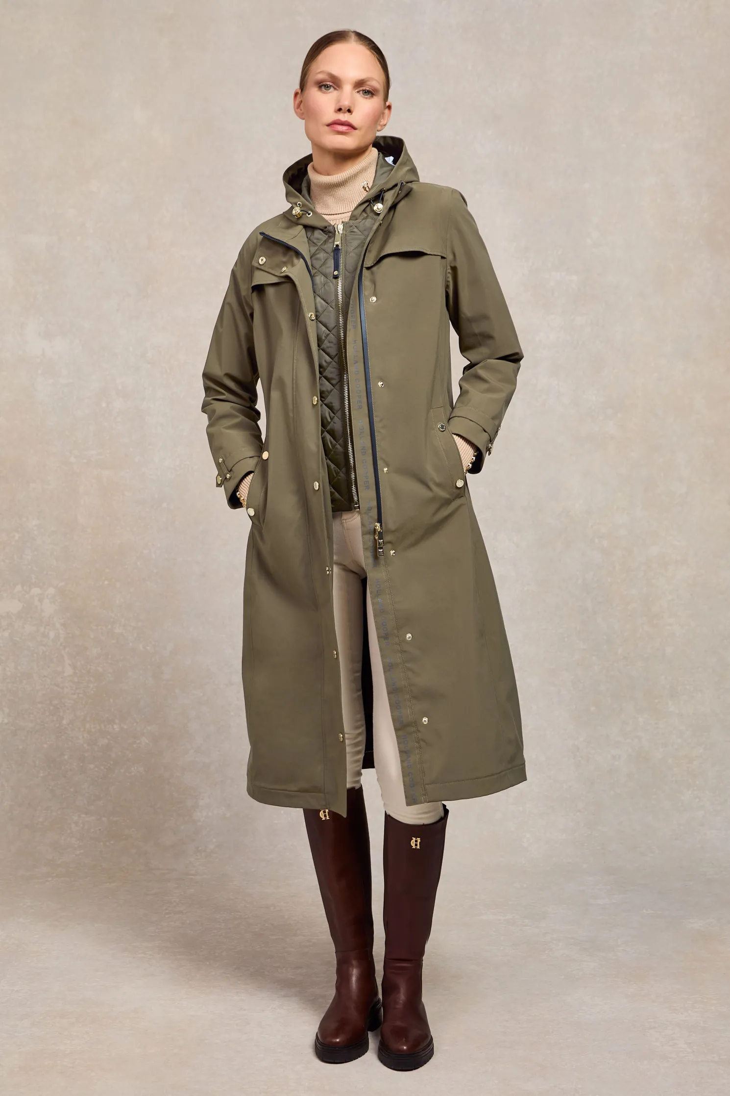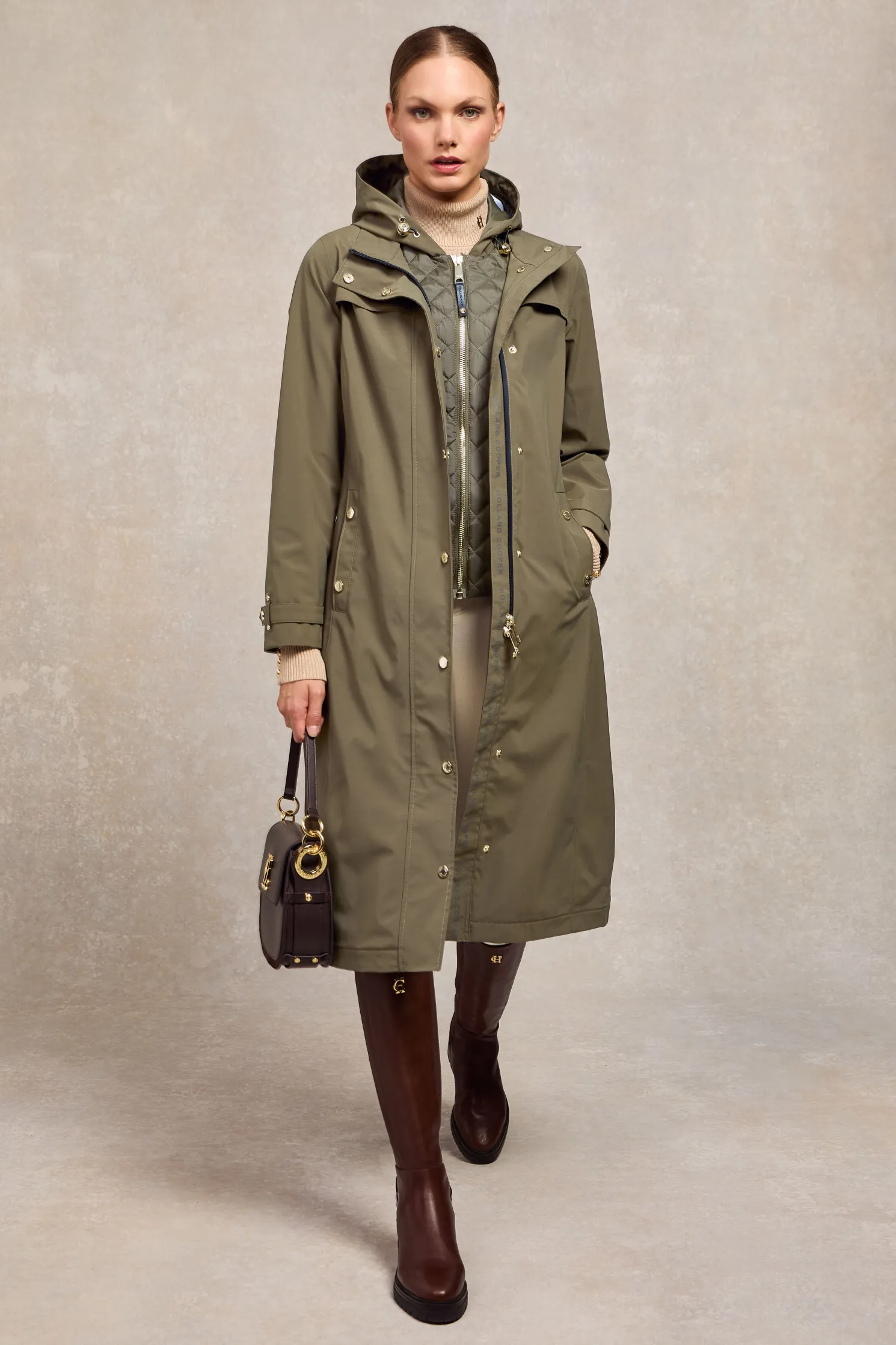 Elegant and slim fitting, this long length rain coat is the perfect companion for a rainy day. Meticulously constructed from waterproof materials with taped and sealed seams, this coat has a modern, technical feel. It comes with a built in padded vest for added warmth along with large lower welt pockets to the front and is detailed with our iconic gold HC hardware.