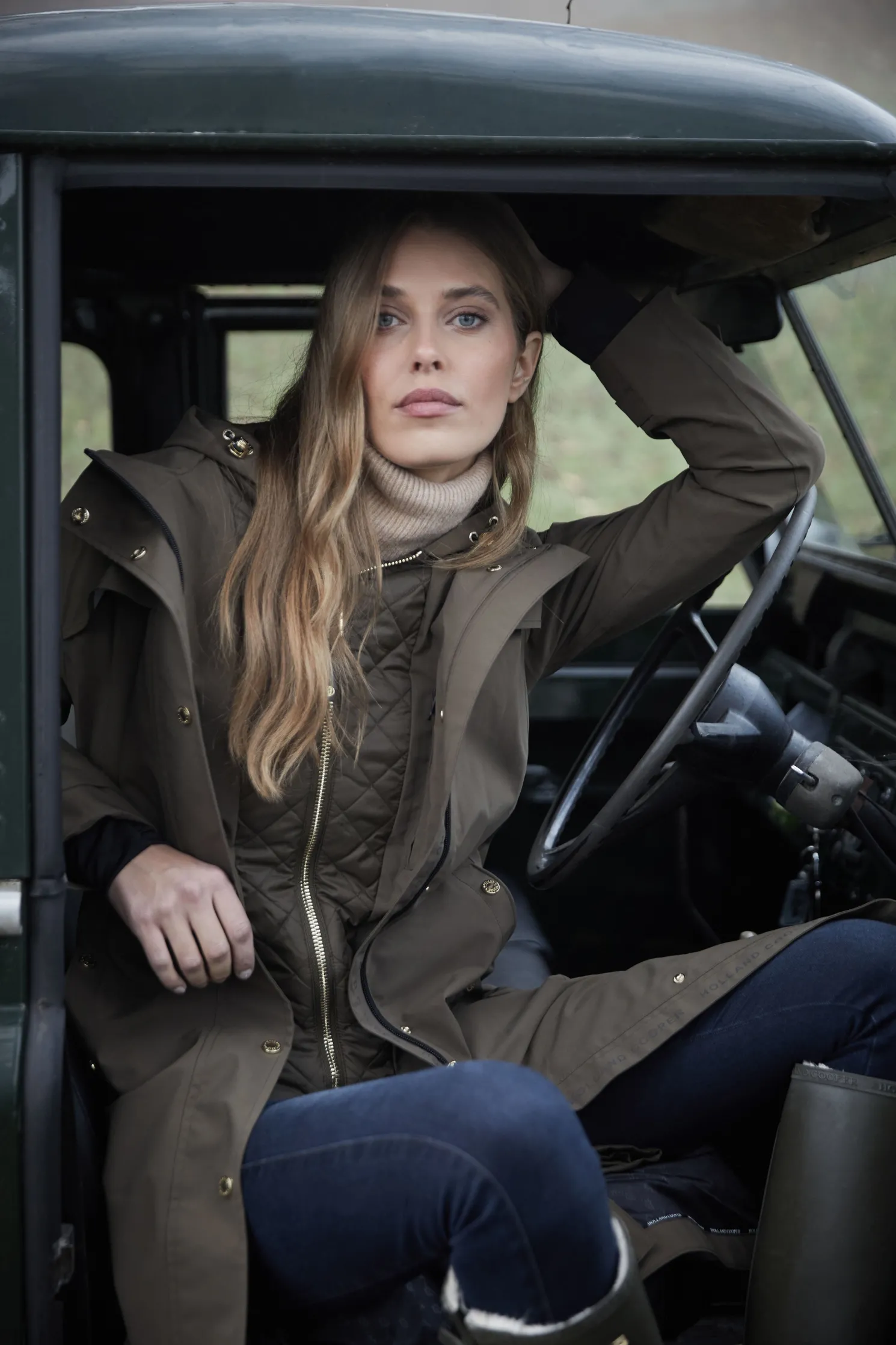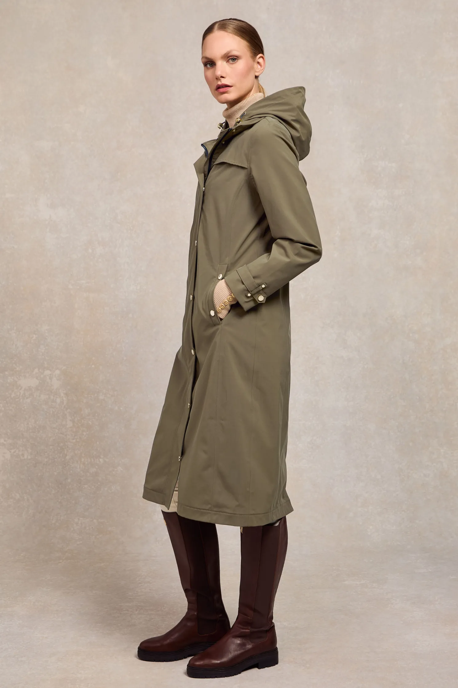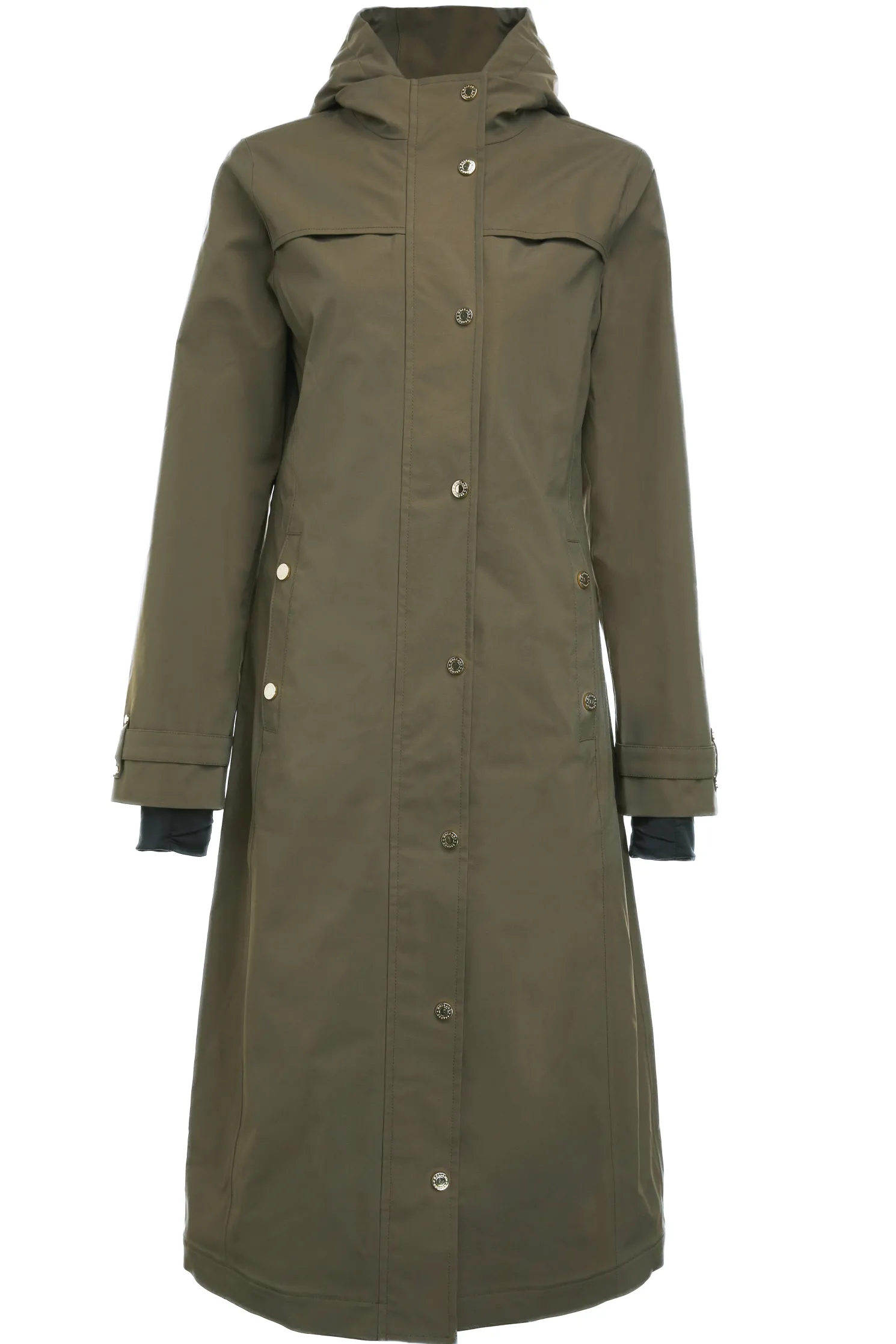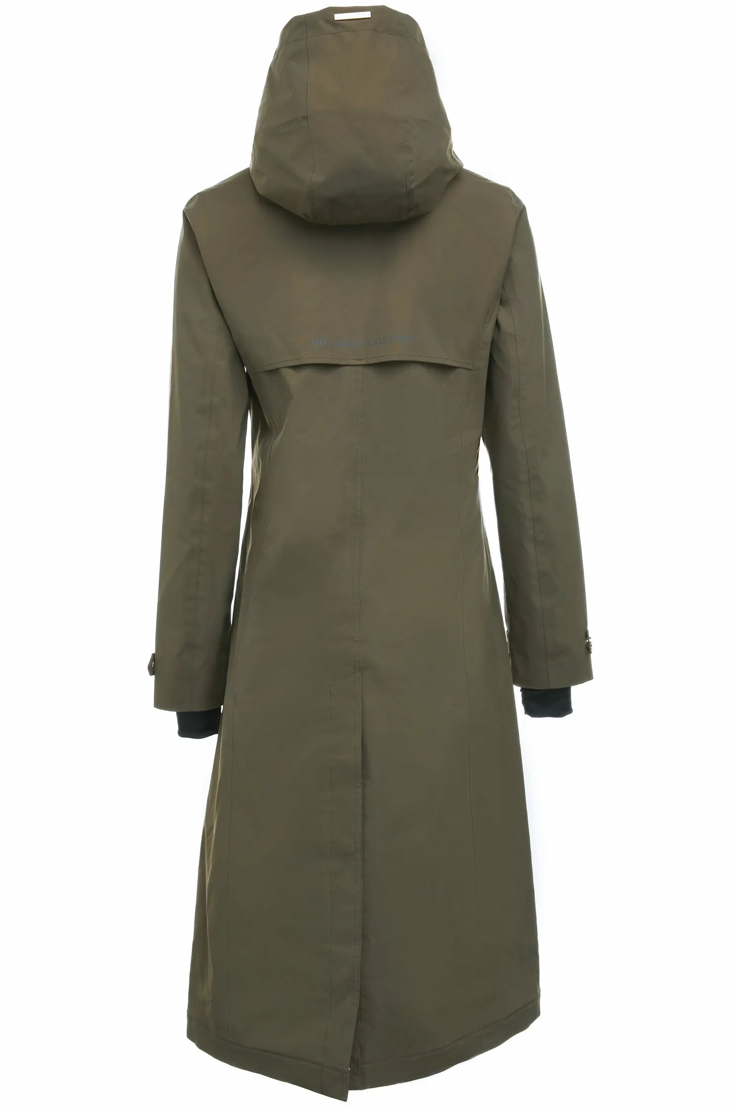 Elegant and slim fitting, this long length rain coat is the perfect companion for a rainy day. Meticulously constructed from waterproof materials with taped and sealed seams, this coat has a modern, technical feel. It comes with a built in padded vest for added warmth along with large lower welt pockets to the front and is detailed with our iconic gold HC hardware.