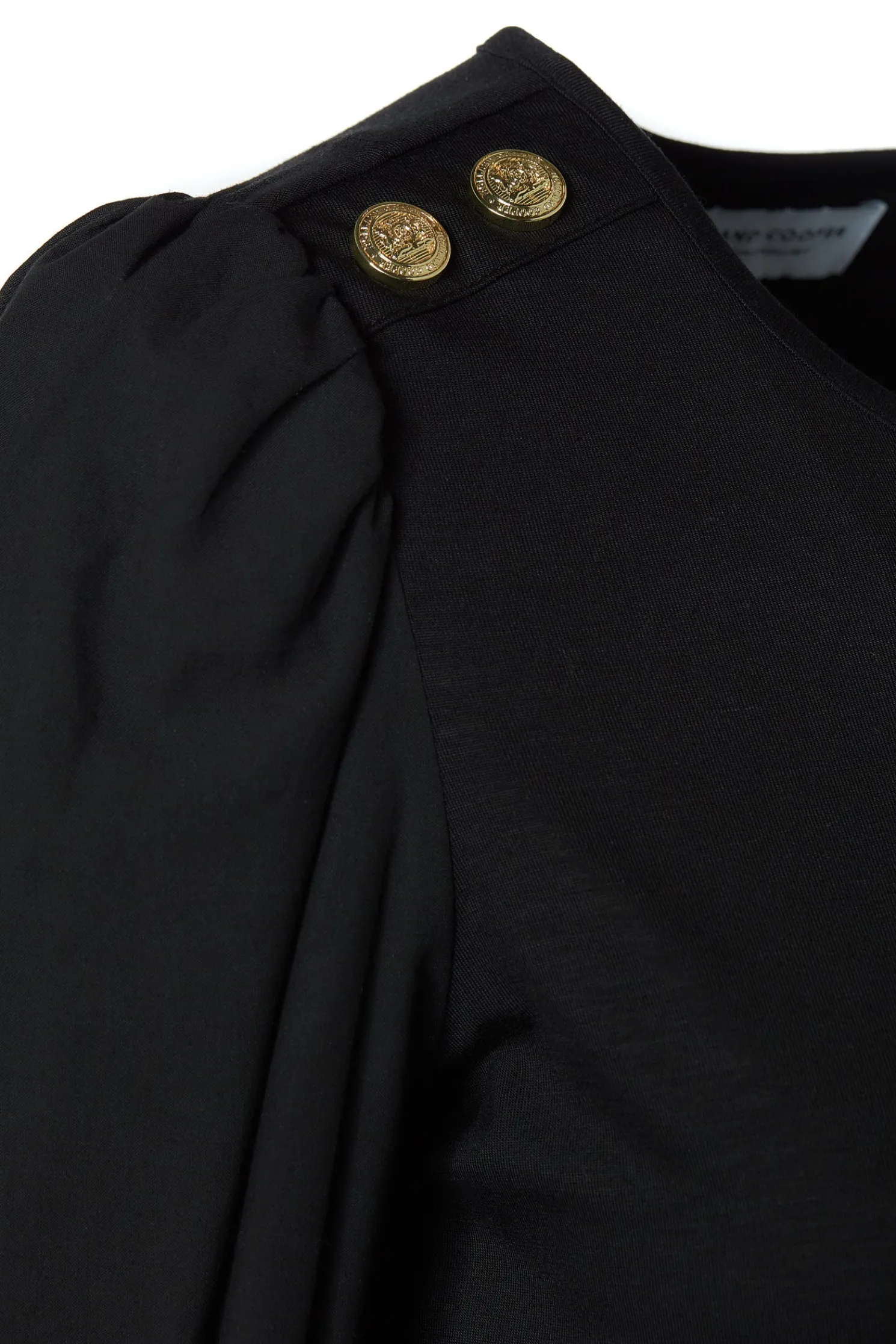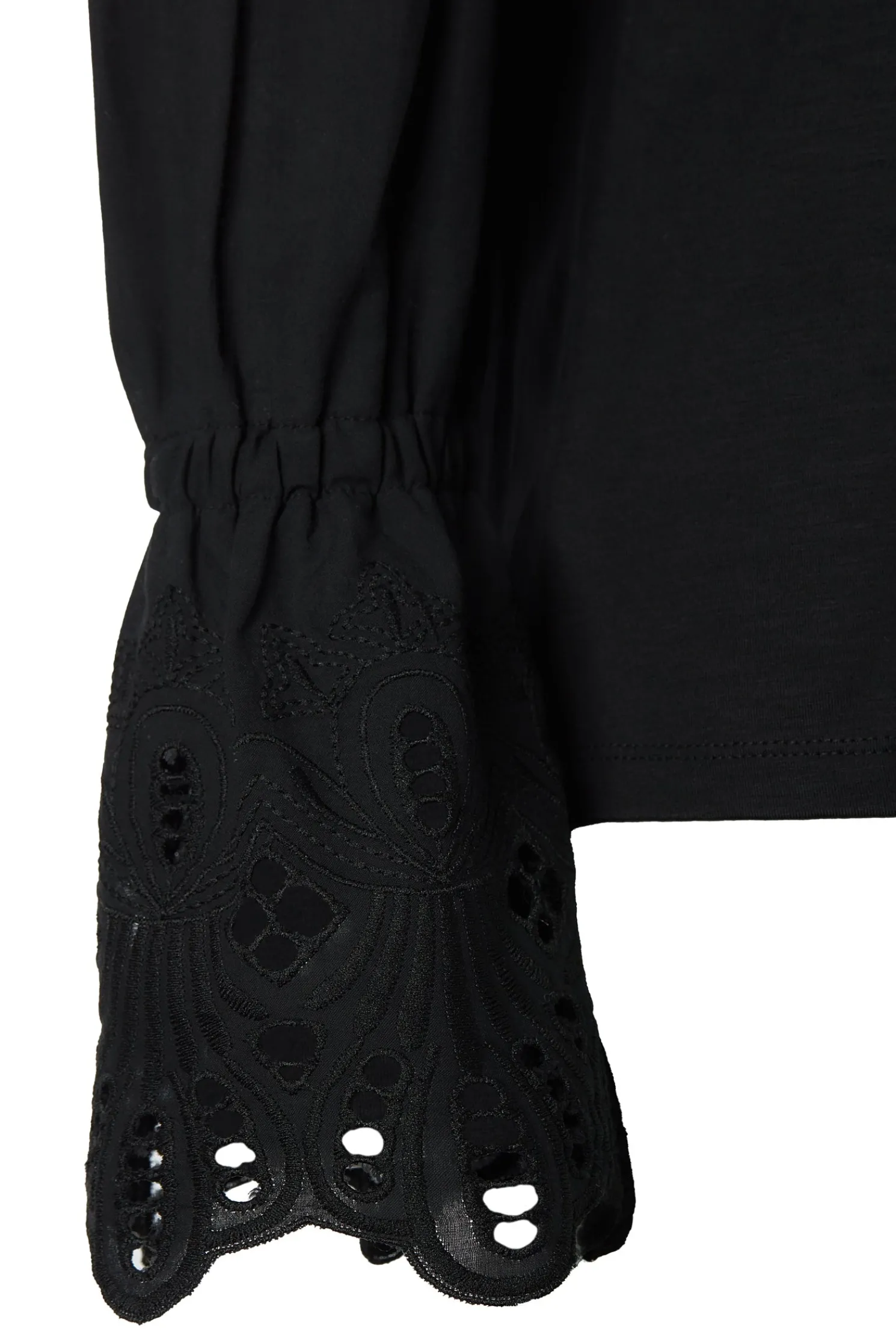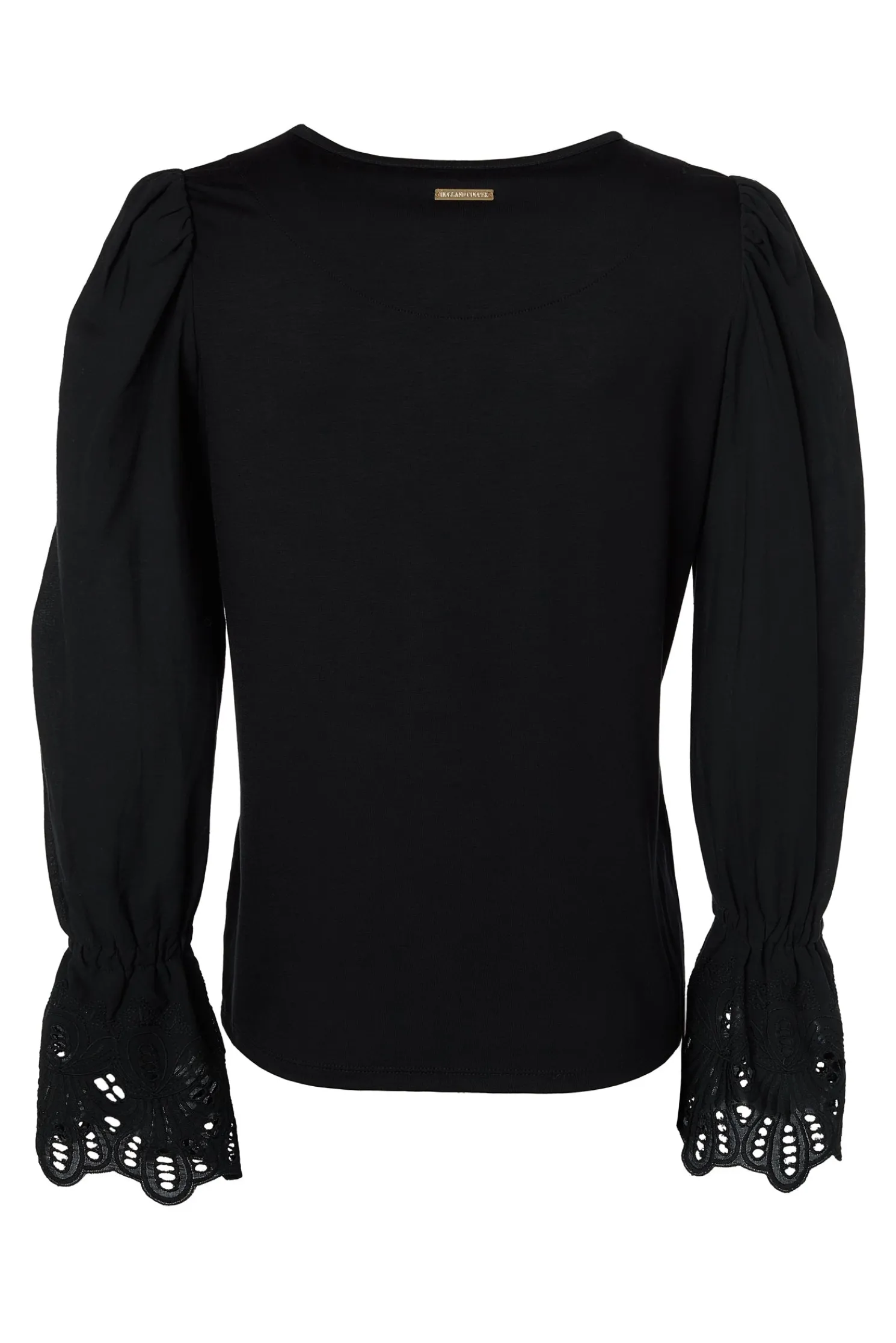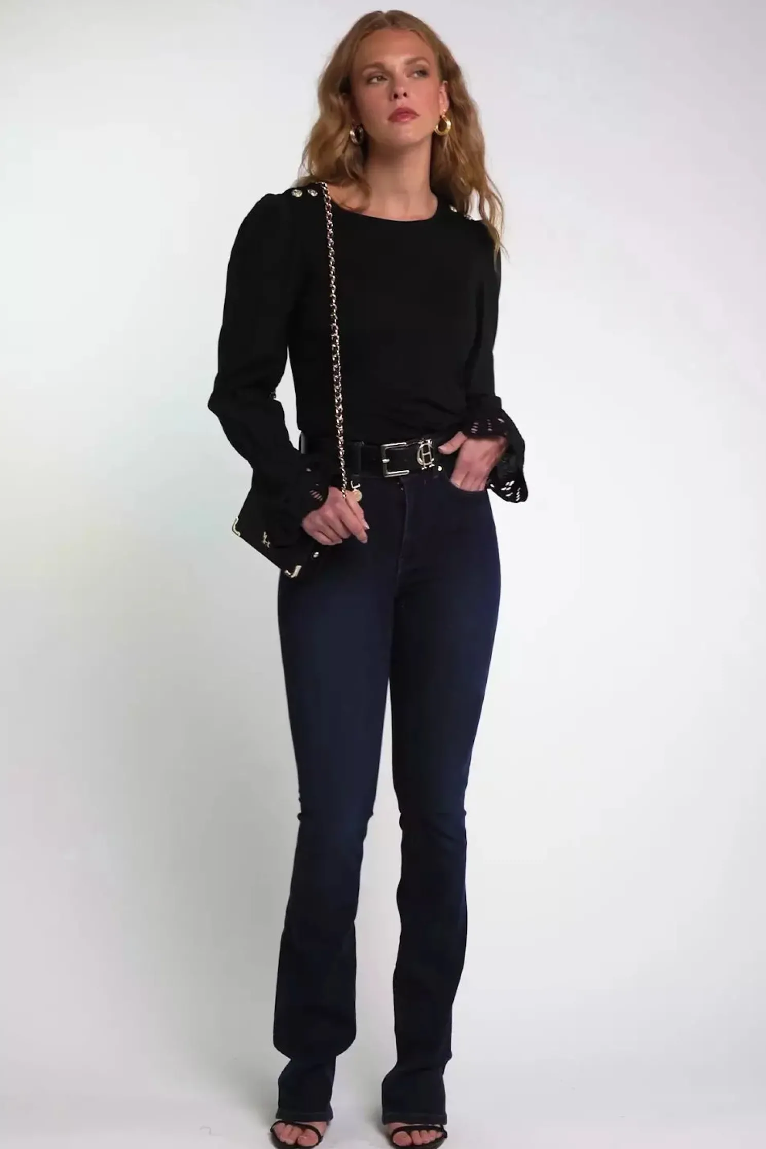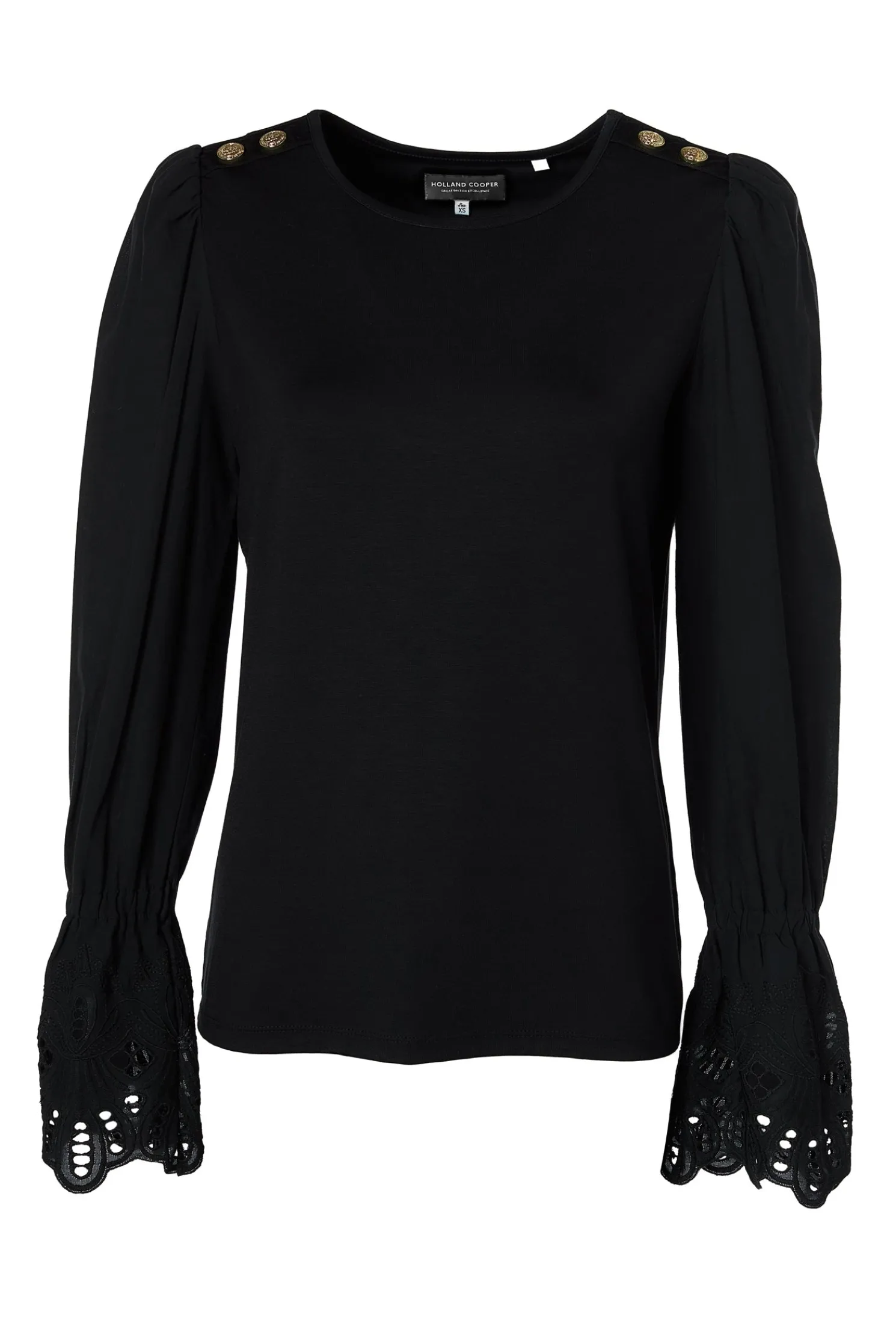 Elegant and feminine, this slim fitted blouse is perfect for layering. It features voluminous sleeves with gathered details at the shoulder and broderie detailing above the cuff. Finished off with our iconic HC gold hardware on the shoulders.