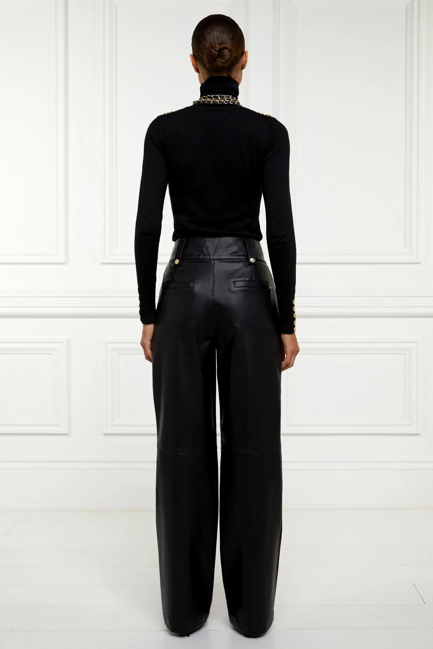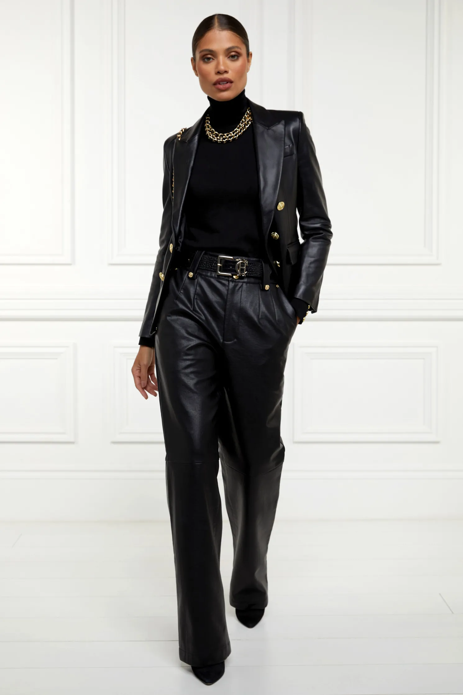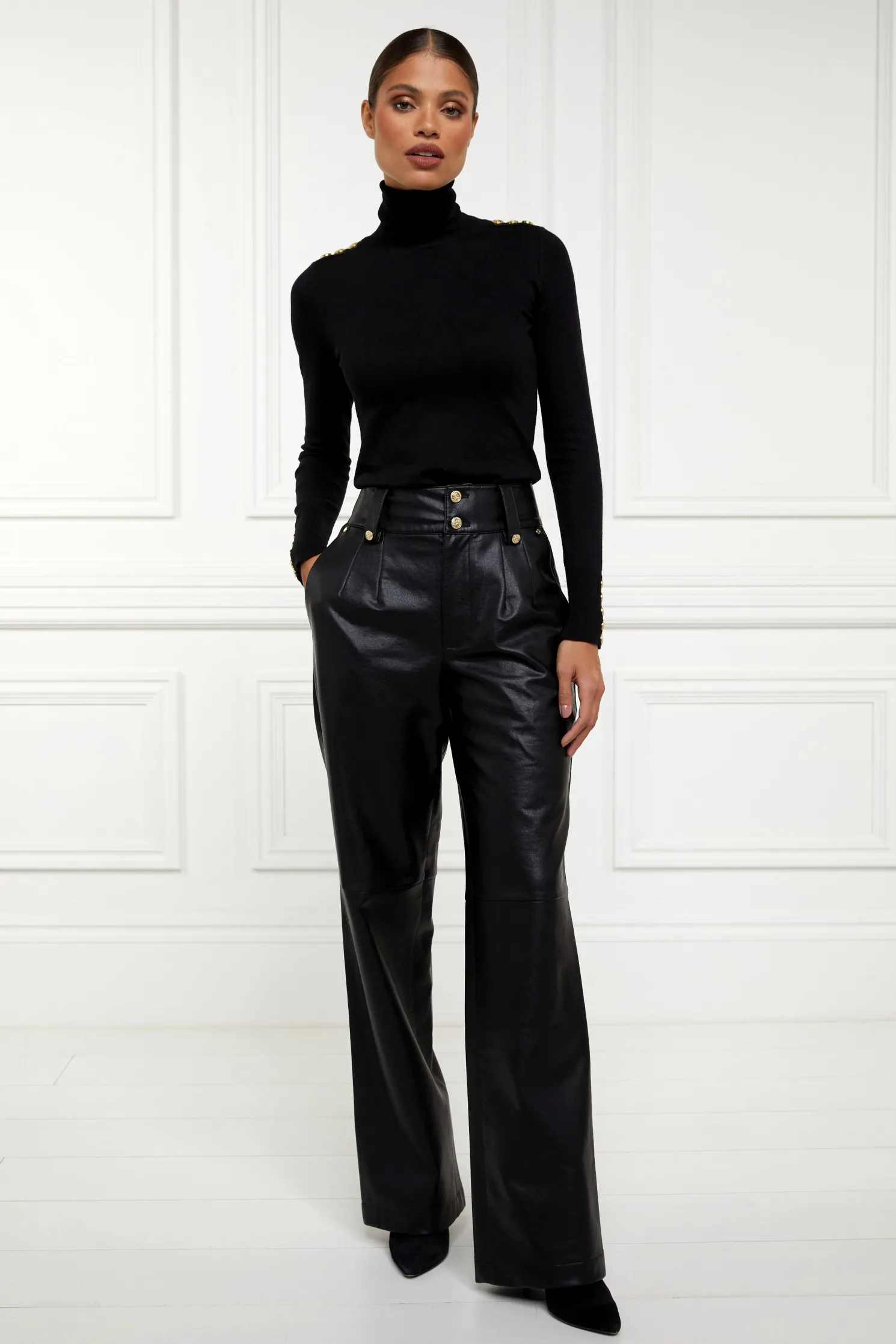 Our high-waisted PU trousers are a sophisticated addition to your wardrobe. Featuring a high-rise waist and a straight, loose-fit leg, offering a chic and modern silhouette. The pleated front adds a touch of femininity and fluidity, while the deep, flattering waistband ensures a comfortable and secure fit. Crafted from soft and subtle faux leather, these trousers provide a luxurious look and feel. Adorned with our signature gold hardware, they can elevate any outfit. Perfect for any occasion, these trousers combine style and comfort effortlessly.