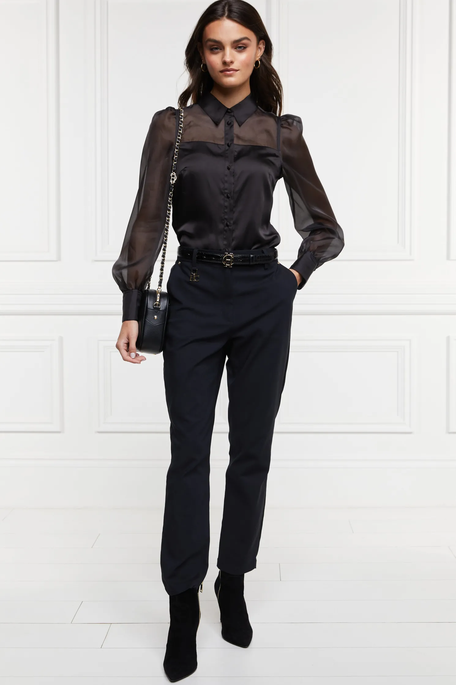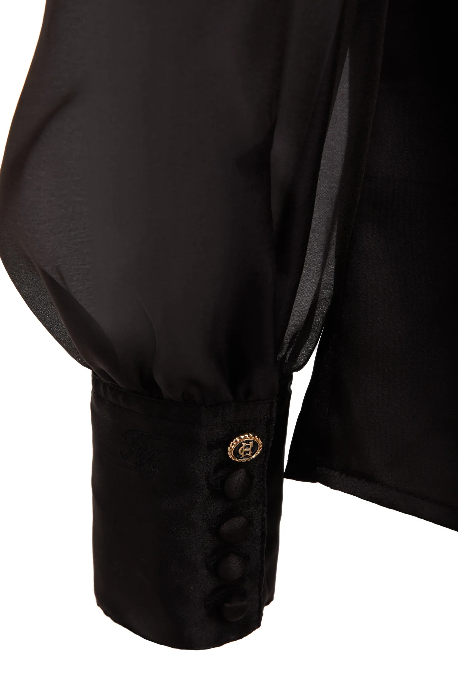 Designed with a classic tailored shirt aesthetic, this piece has been beautifully elevated with a sheer front & back yolk with chiffon sleeves and extended cuffs. Both the collar & body have been created from luxurious satin fabric. Elevated with HC details and finished with a concealed front placket.
