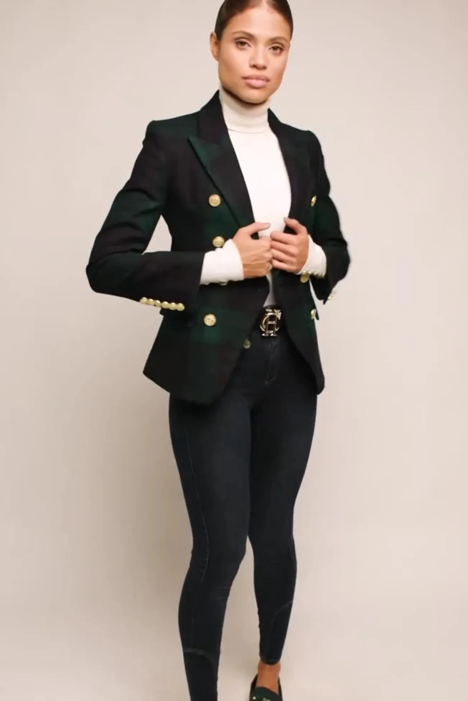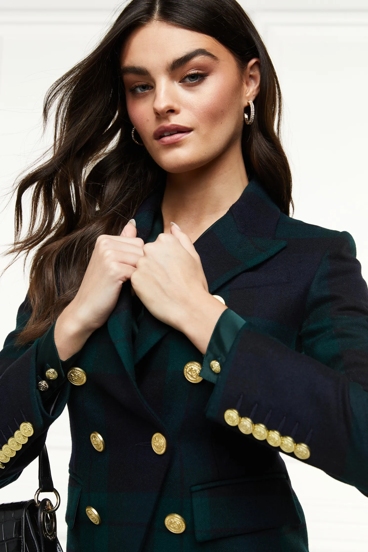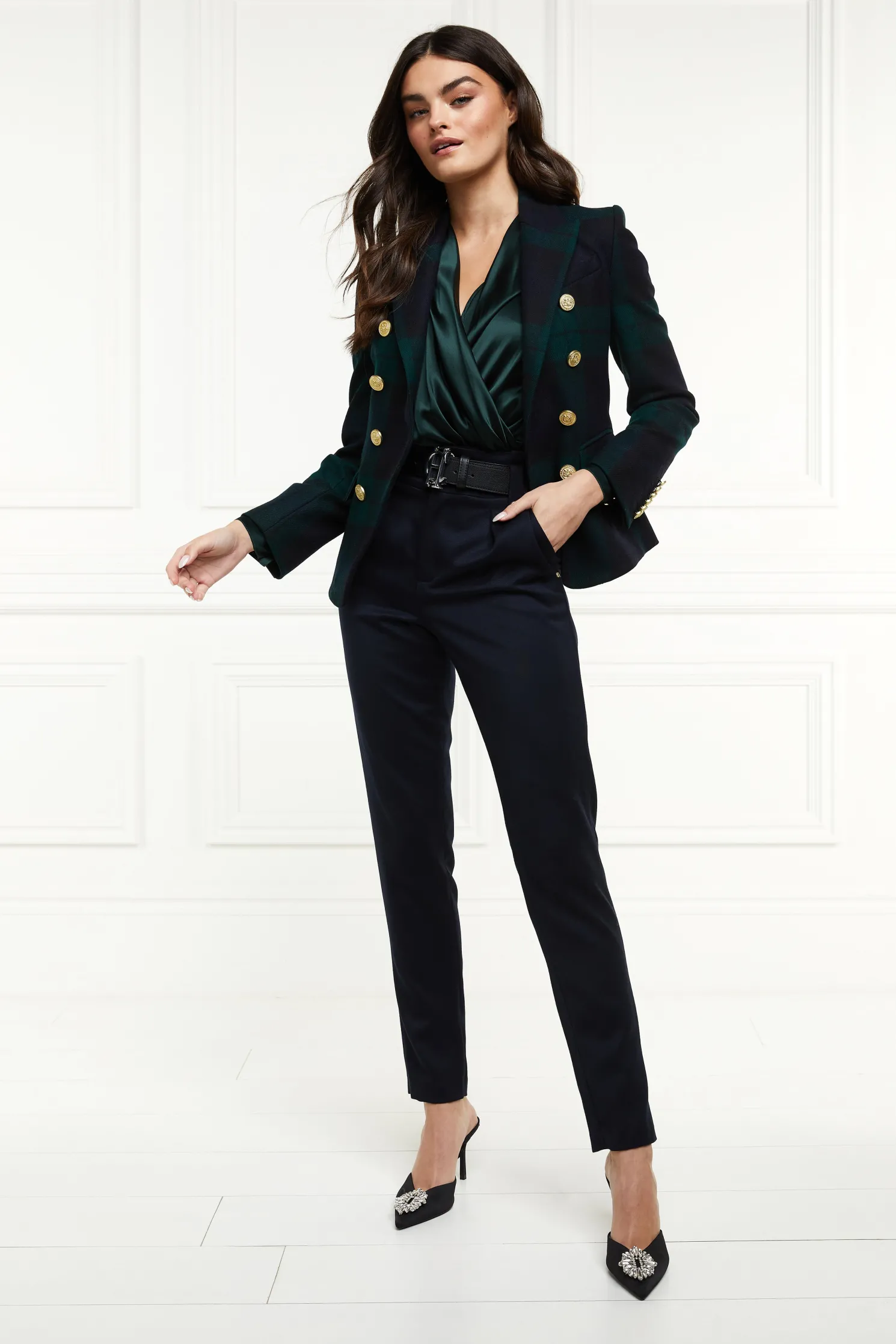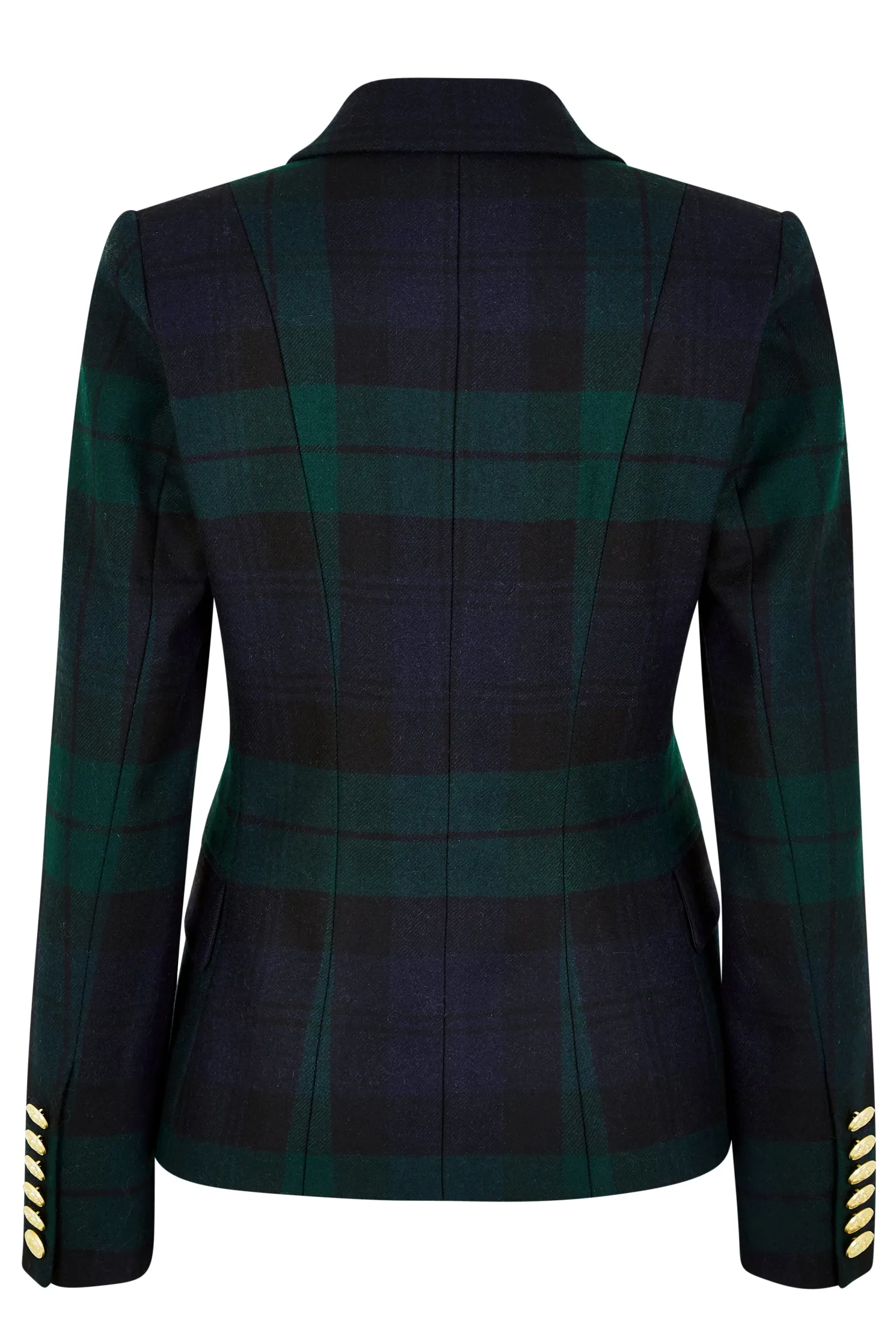 This double breasted blazer is a chic transeasonal wardrobe essential. Designed to create a sharp tailored silhouette worn open or closed. Fully lined with a luxury stretch lining for extra comfort and adorned with HC signature Gold buttons on the front and cuffs. This blazer has been hand cut and made entirely in England using wools woven in the UK.