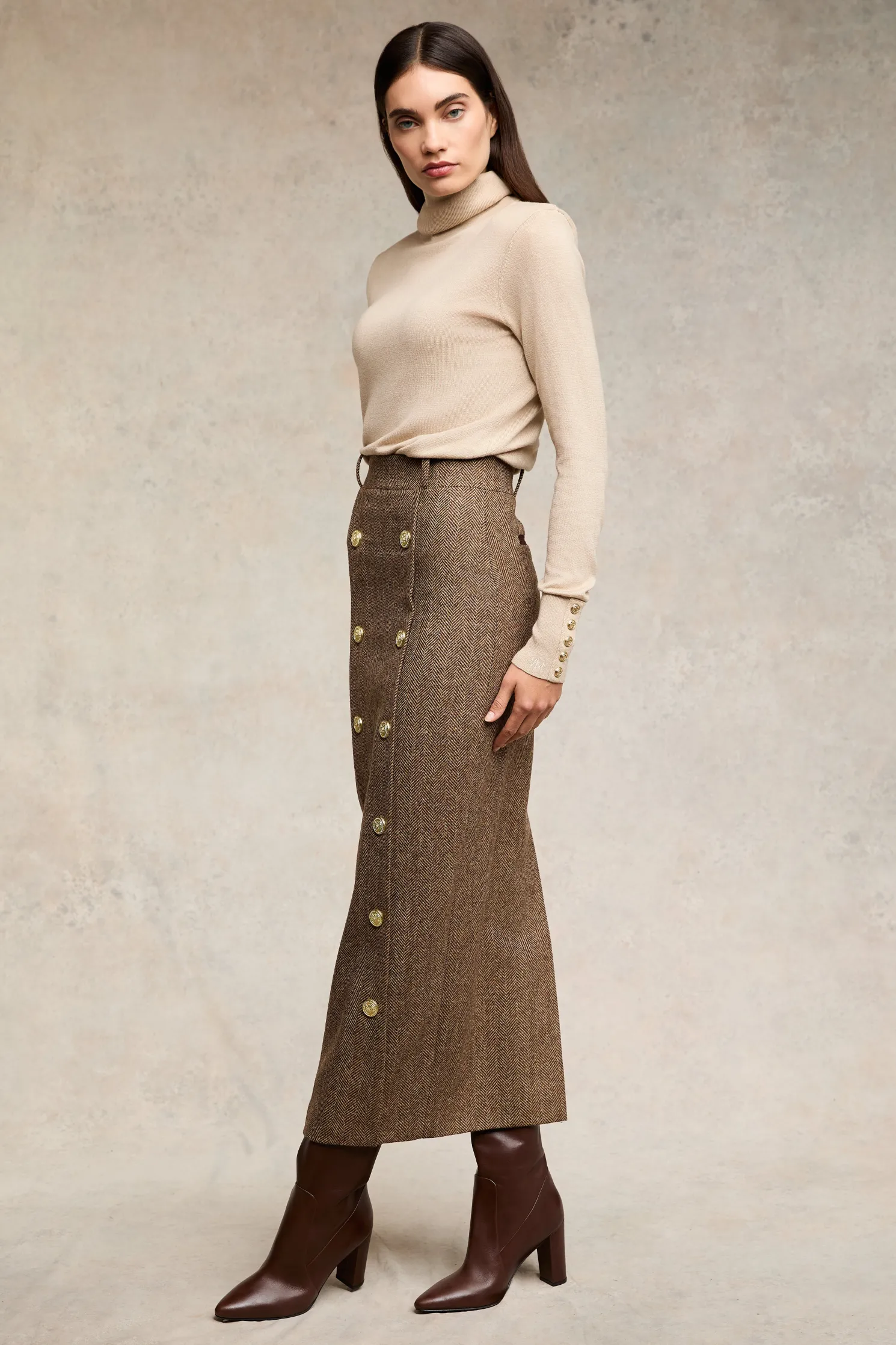 Handcrafted from the finest wool, this new addition to our skirt collection has been designed with a refined, pencil silhouette. Designed with a full satin lining and a zip back closure. With a close fit and high waist, this piece is a classic wardrobe staple. Detailed with our iconic gold hardware and statement gold buttons.