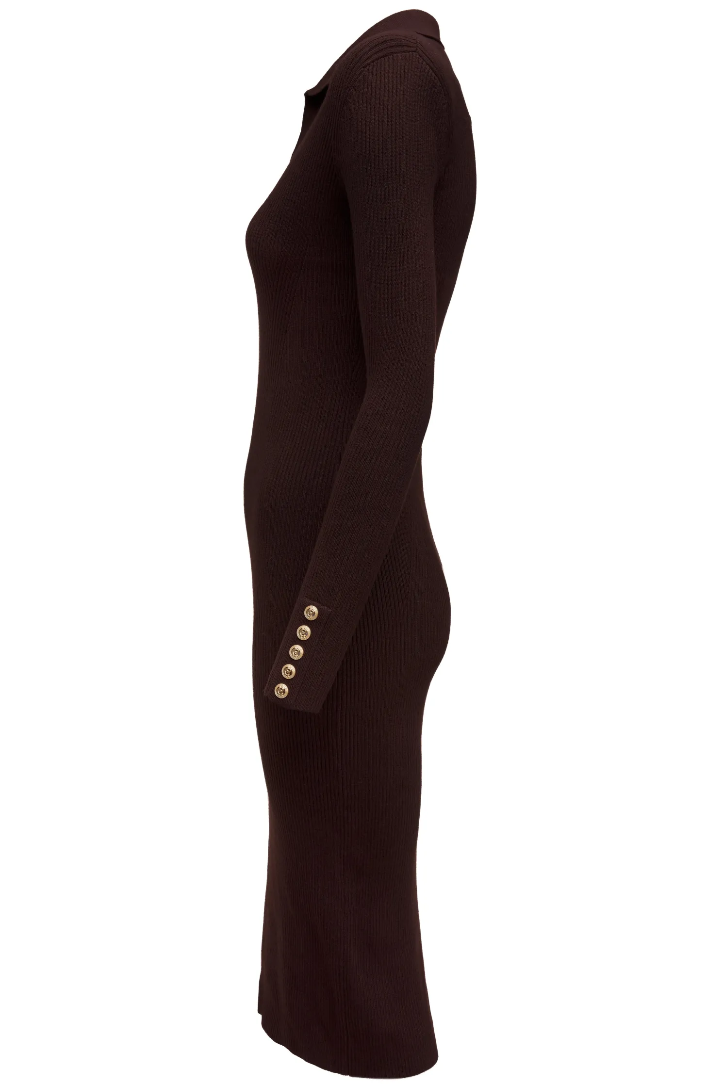 Designed with a slim fit and midi length, this dress has been crafted from a sumptuously soft yarn blend. With subtle shoulder pads and a leg split for a sharp silhouette, this dress has been accentuated by our iconic hardware detailing.
