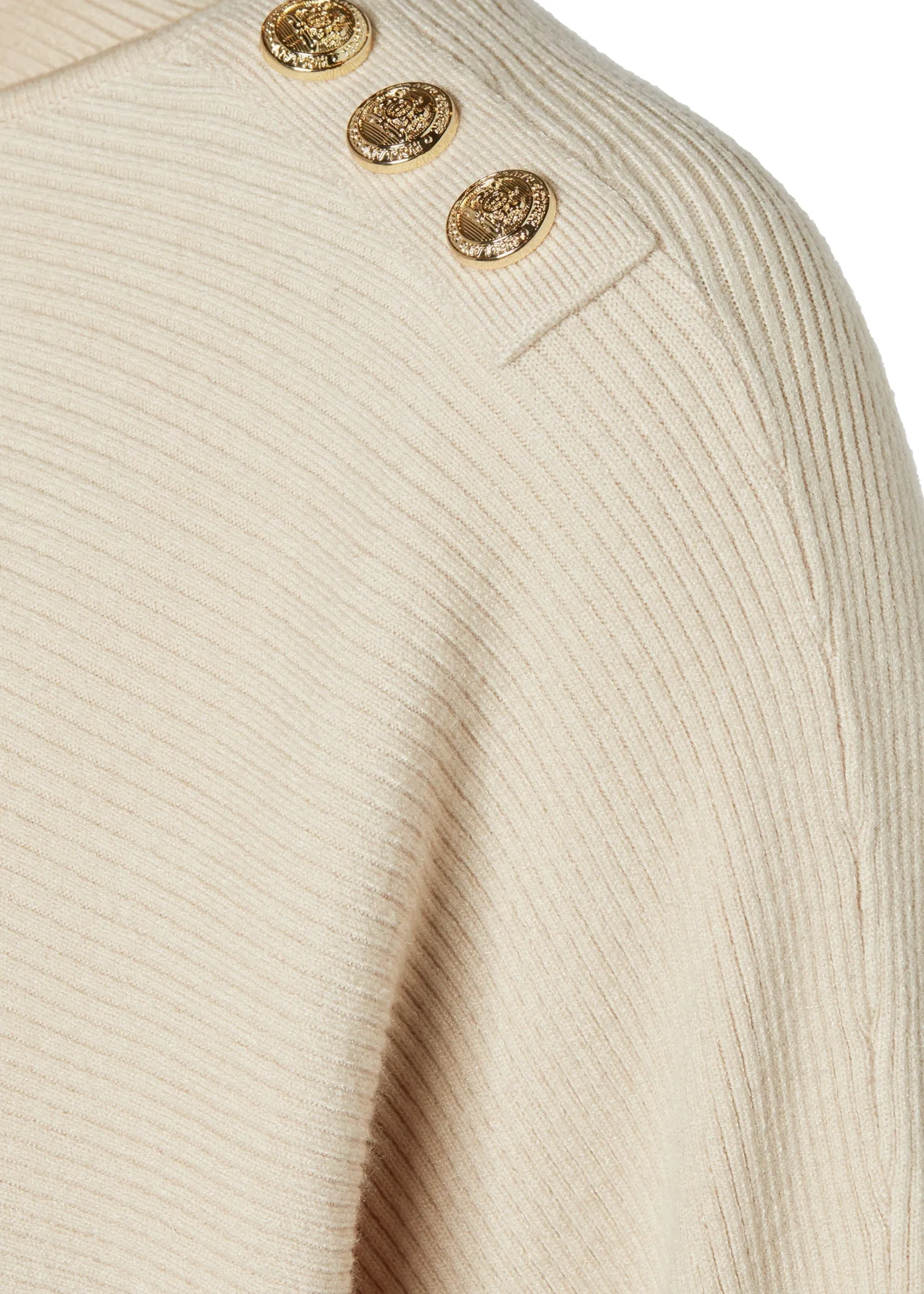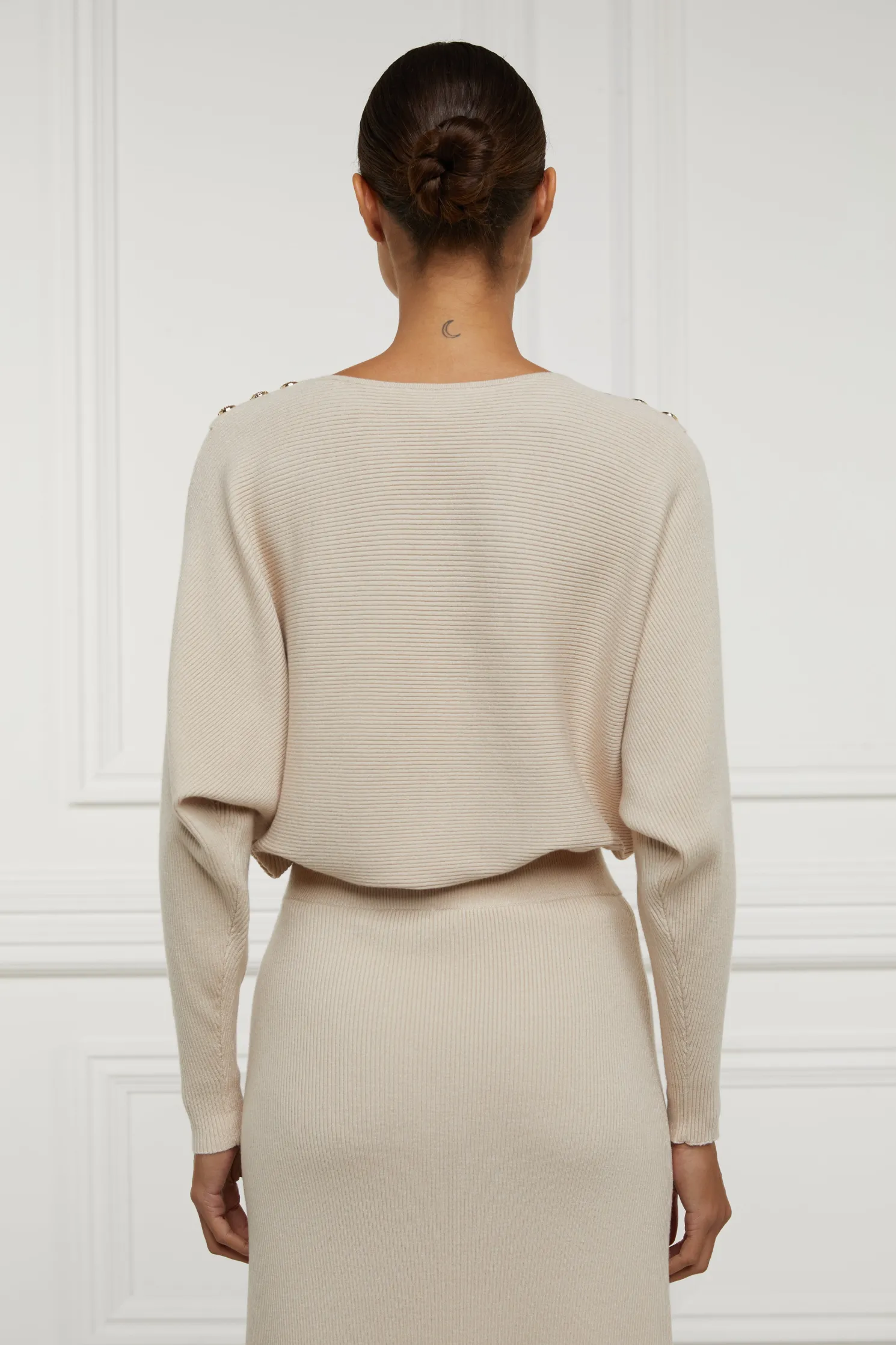 The Leyla Knit is a sophisticated staple, featuring a boat neck and batwing sleeves for a relaxed, yet elegant silhouette. The horizontal ribbed texture on the main body is complemented by a deep ribbed waistband, creating a flattering fit. Signature hardware on the shoulders and cuffs adds a refined touch, making this knit a perfect blend of comfort and style.