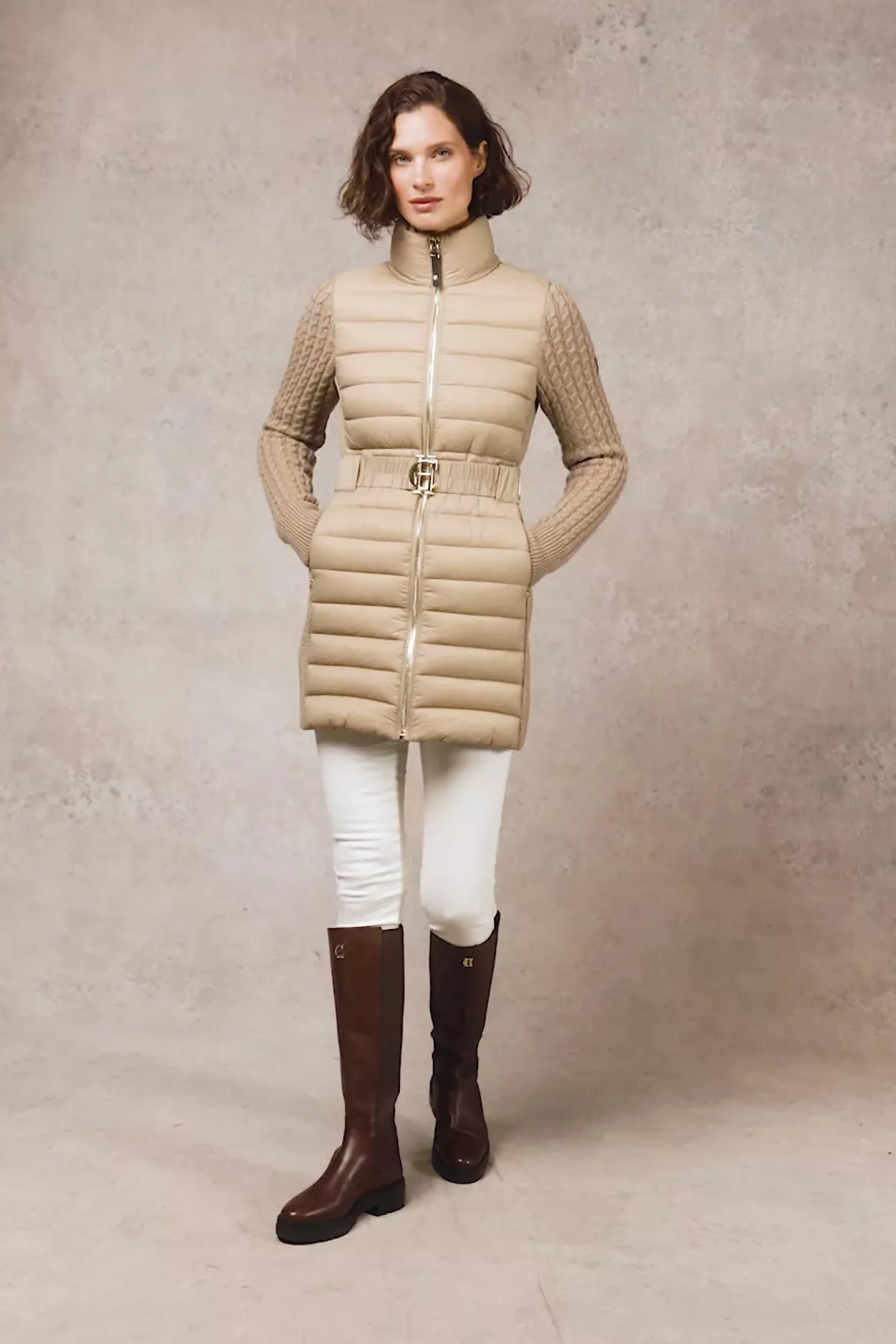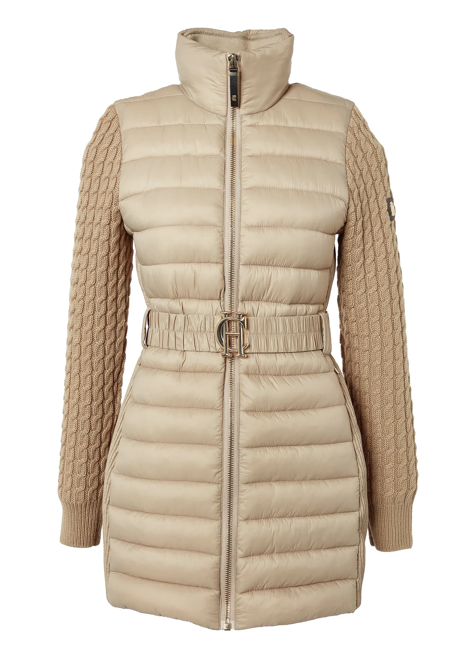 A sophisticated mid-length coat that seamlessly blends classic style with modern functionality. Crafted with Sorona by DuPont synthetic down fill, it ensures lightweight warmth and comfort, perfect for colder days. This coat features a self-fabric-covered elastic belt with an elegant HC buckle, adding a refined touch to the silhouette. The contrasting cable knitted sleeves provide both texture and style, enhancing its aesthetic appeal.