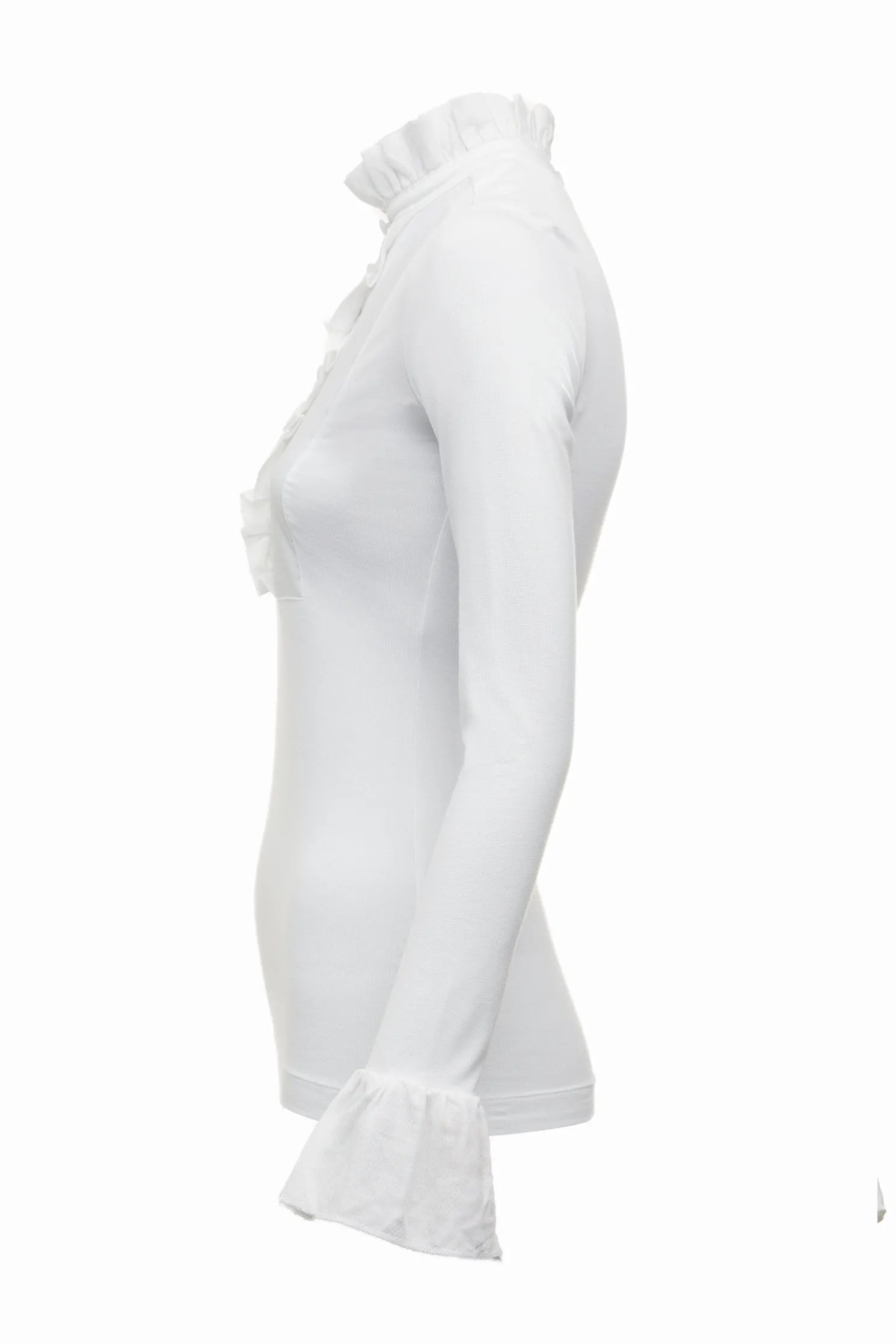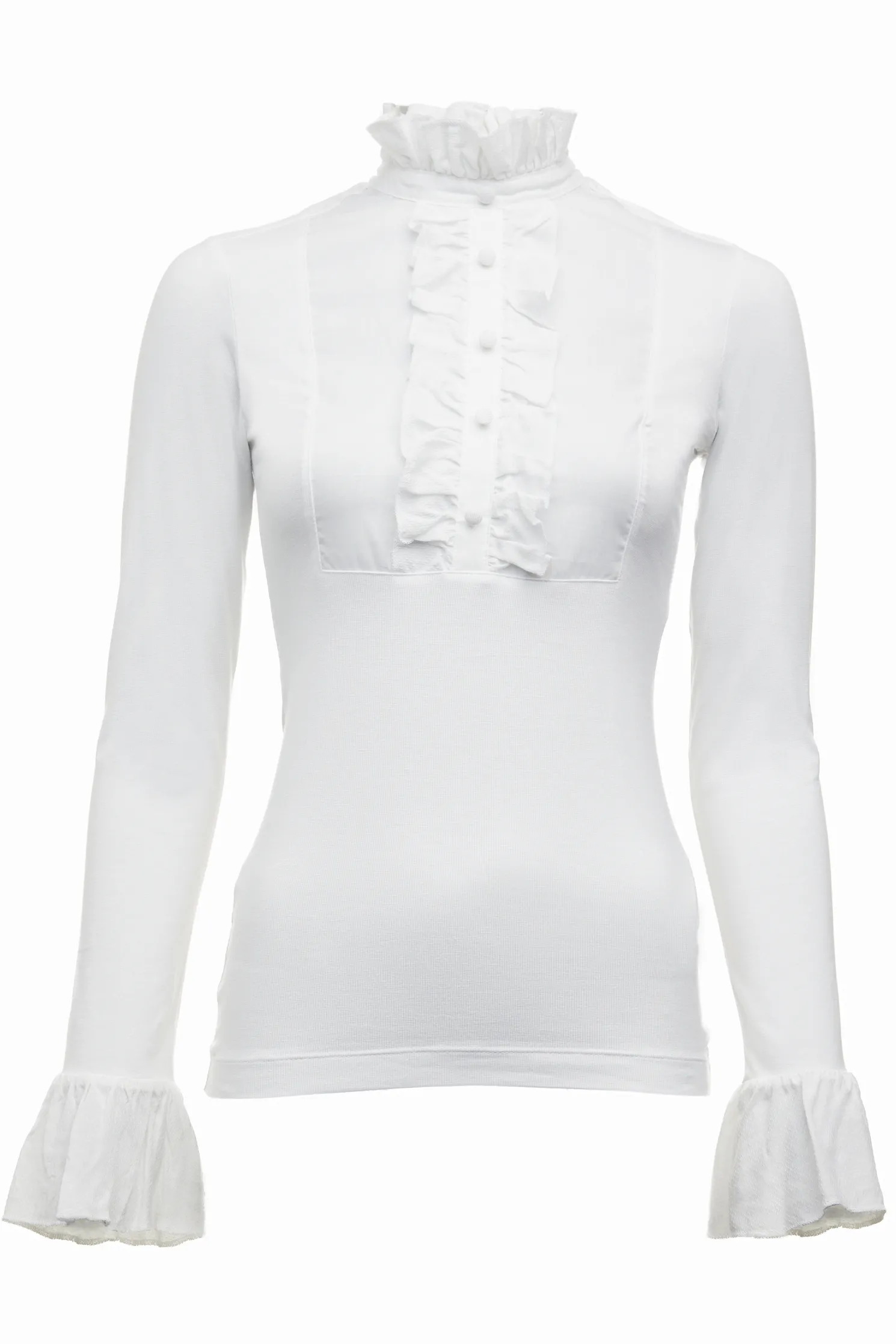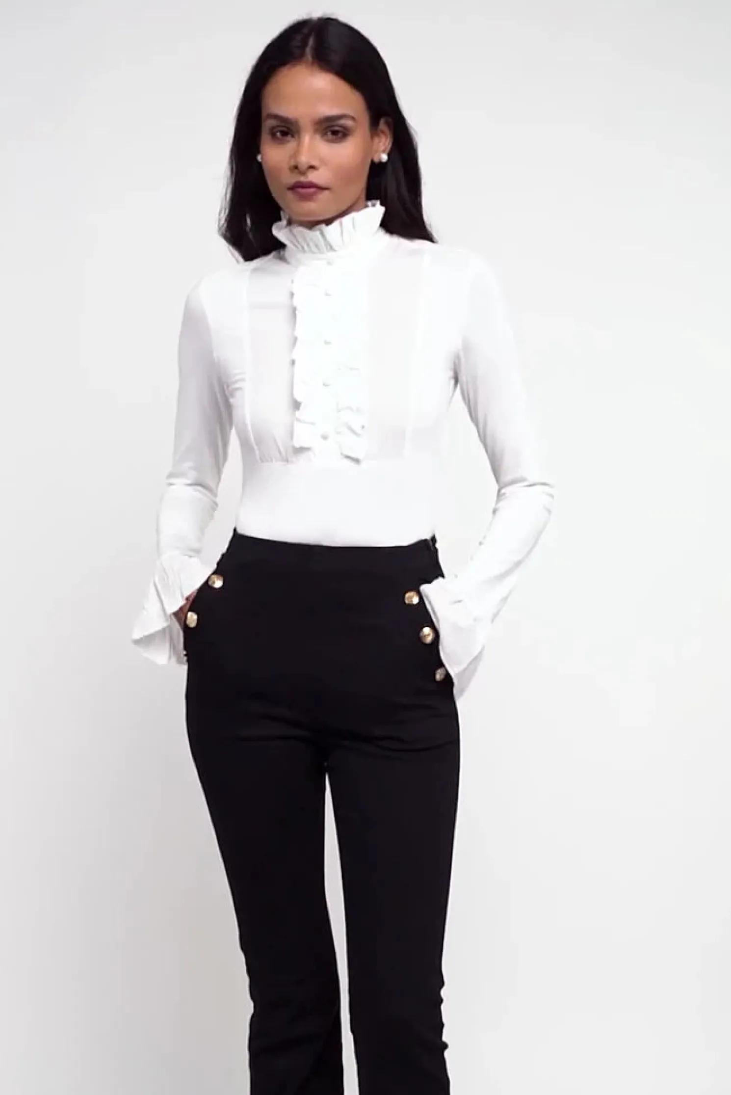 Designed as a neatly fitted shirt with feminine frills on the front and cuffs giving a softness to the blouse. This blouse is highly versatile, style with our high-waisted peg trousers or layer under one of our jumpers with the collar and cuff peeking out.