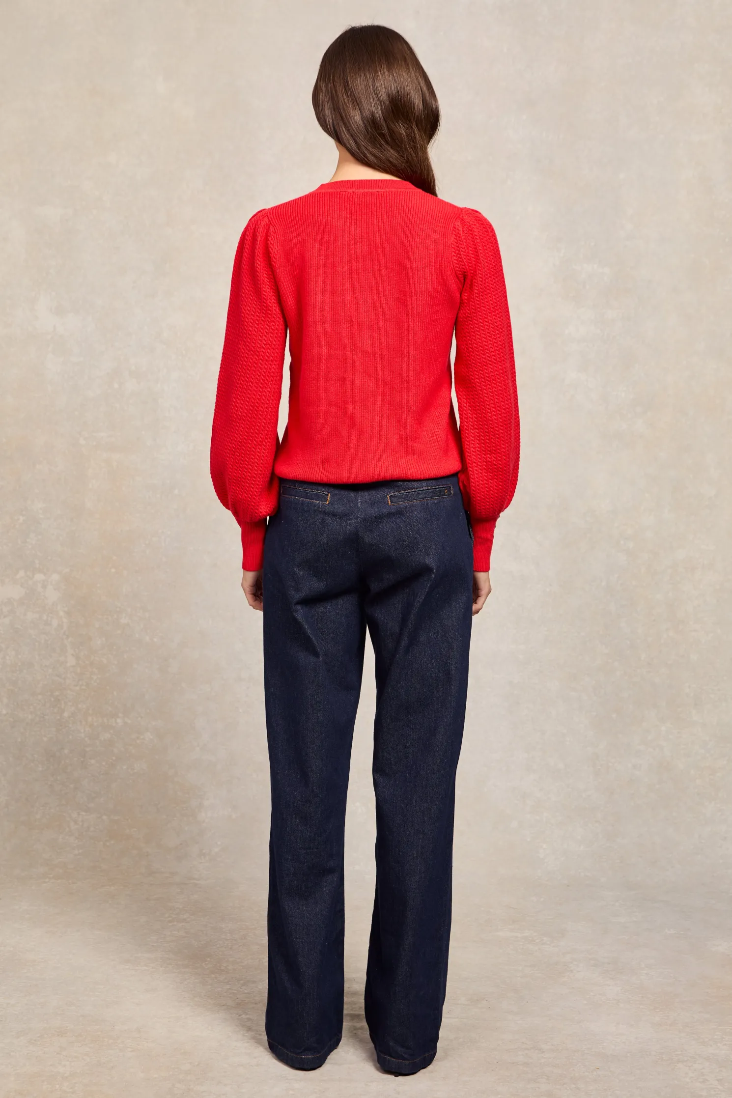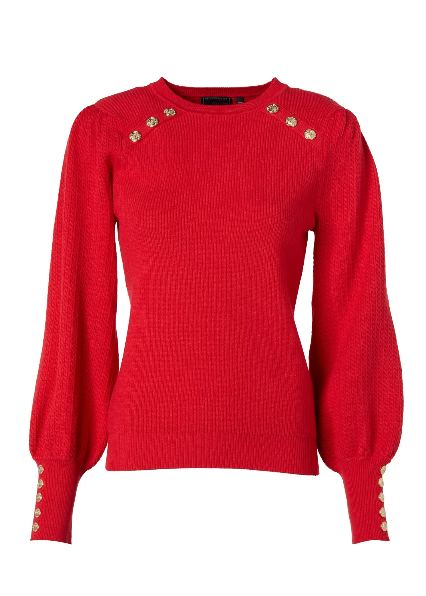 A stylish blend of modern design and classic elegance. The main body features a refined ribbed texture, while the blouson sleeves are adorned with an intricate cable stitch pattern, adding a touch of sophistication. Hardware detailing at the neckline and cuffs enhances the luxurious appeal. With a slim fit throughout the body the Naomi Crew Neck Knit offers both versatility and chic style.