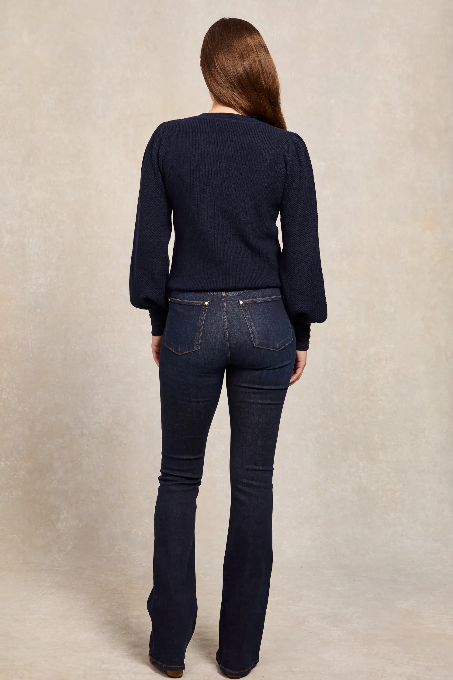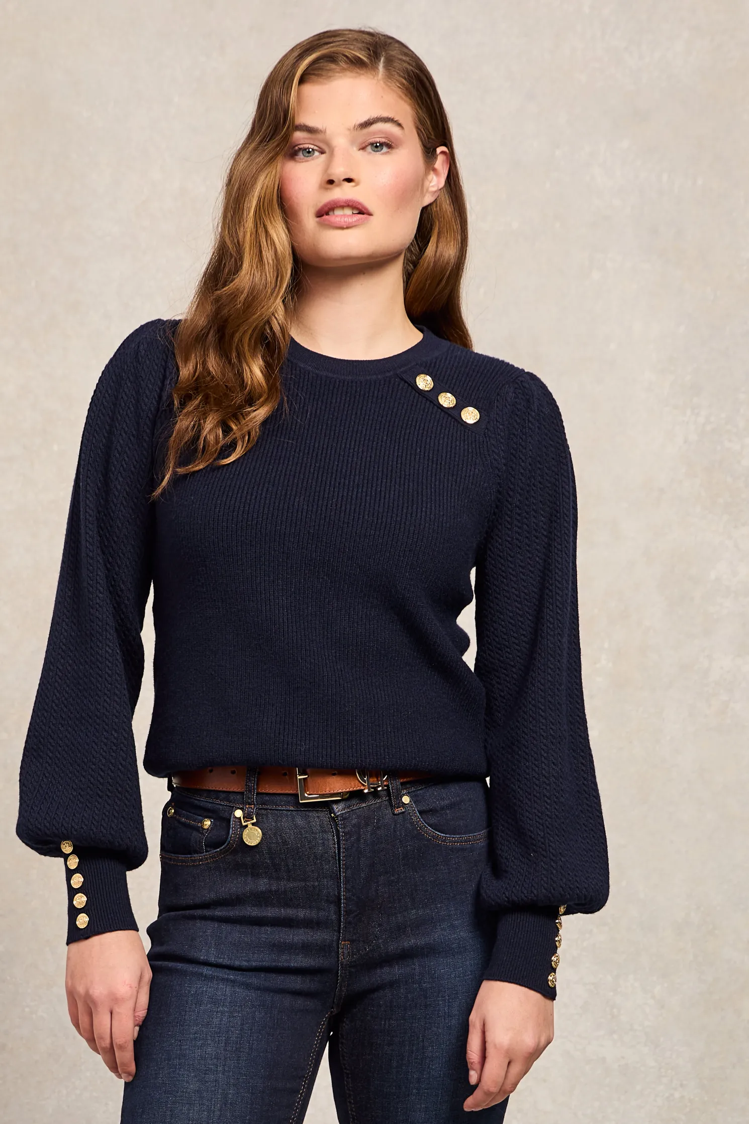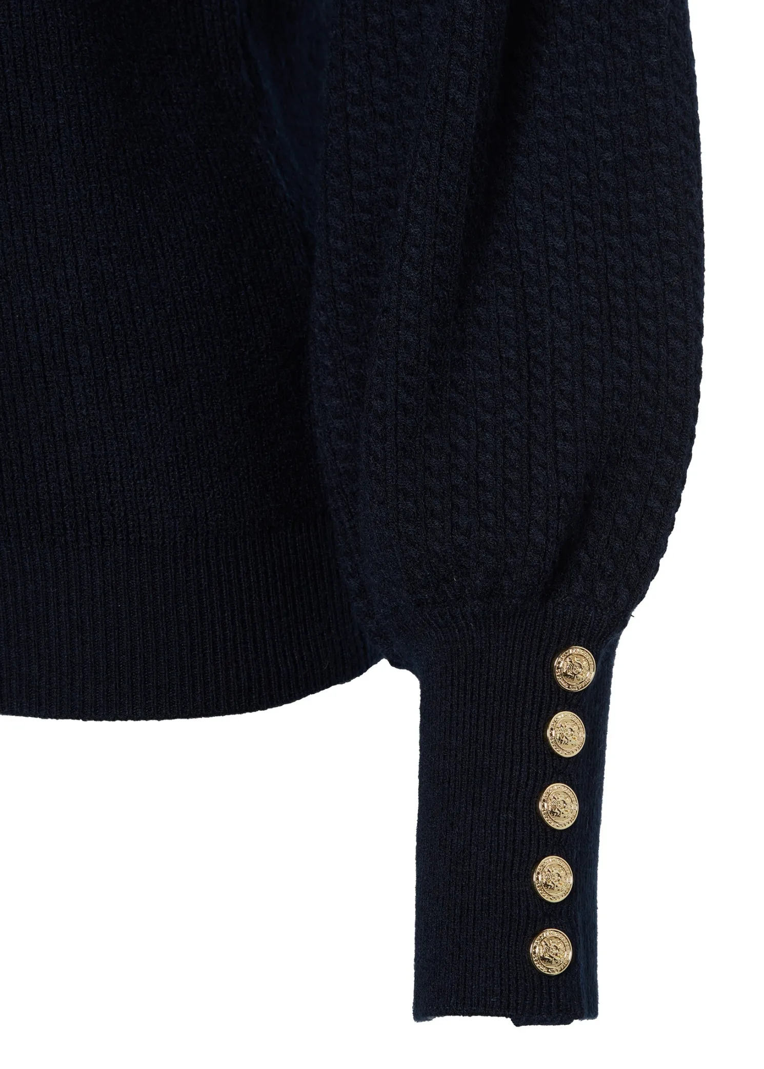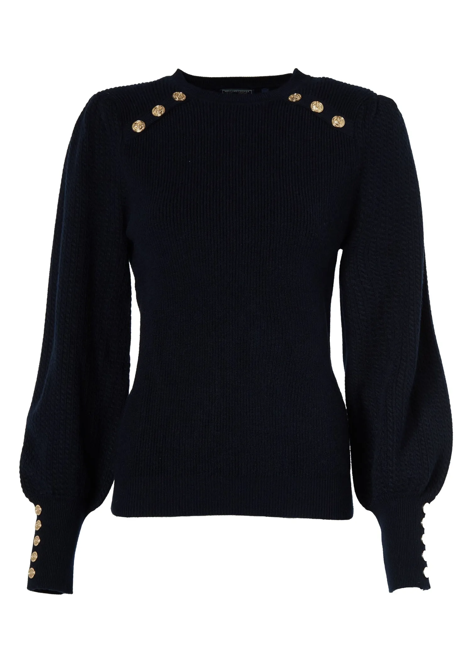 A stylish blend of modern design and classic elegance. The main body features a refined ribbed texture, while the blouson sleeves are adorned with an intricate cable stitch pattern, adding a touch of sophistication. Hardware detailing at the neckline and cuffs enhances the luxurious appeal. With a slim fit throughout the body the Naomi Crew Neck Knit offers both versatility and chic style.
