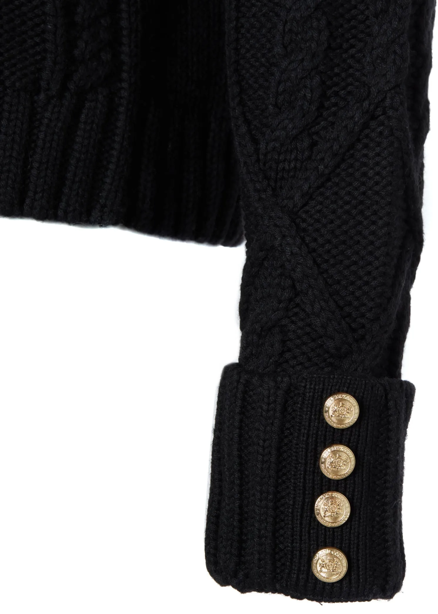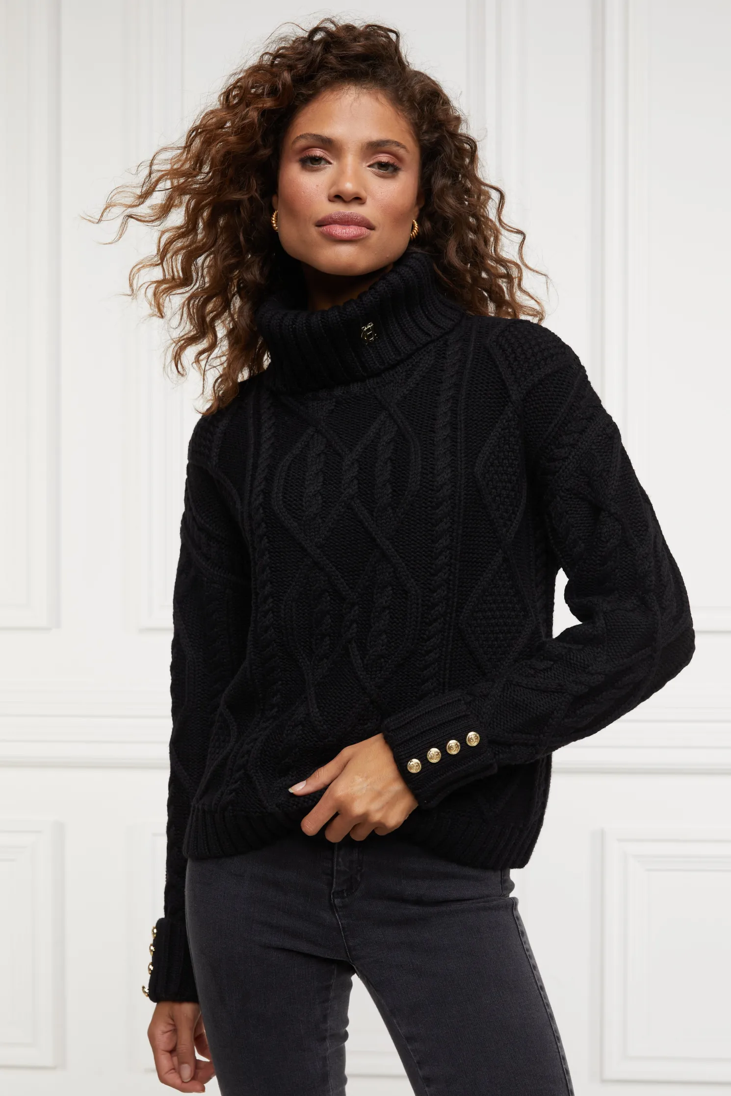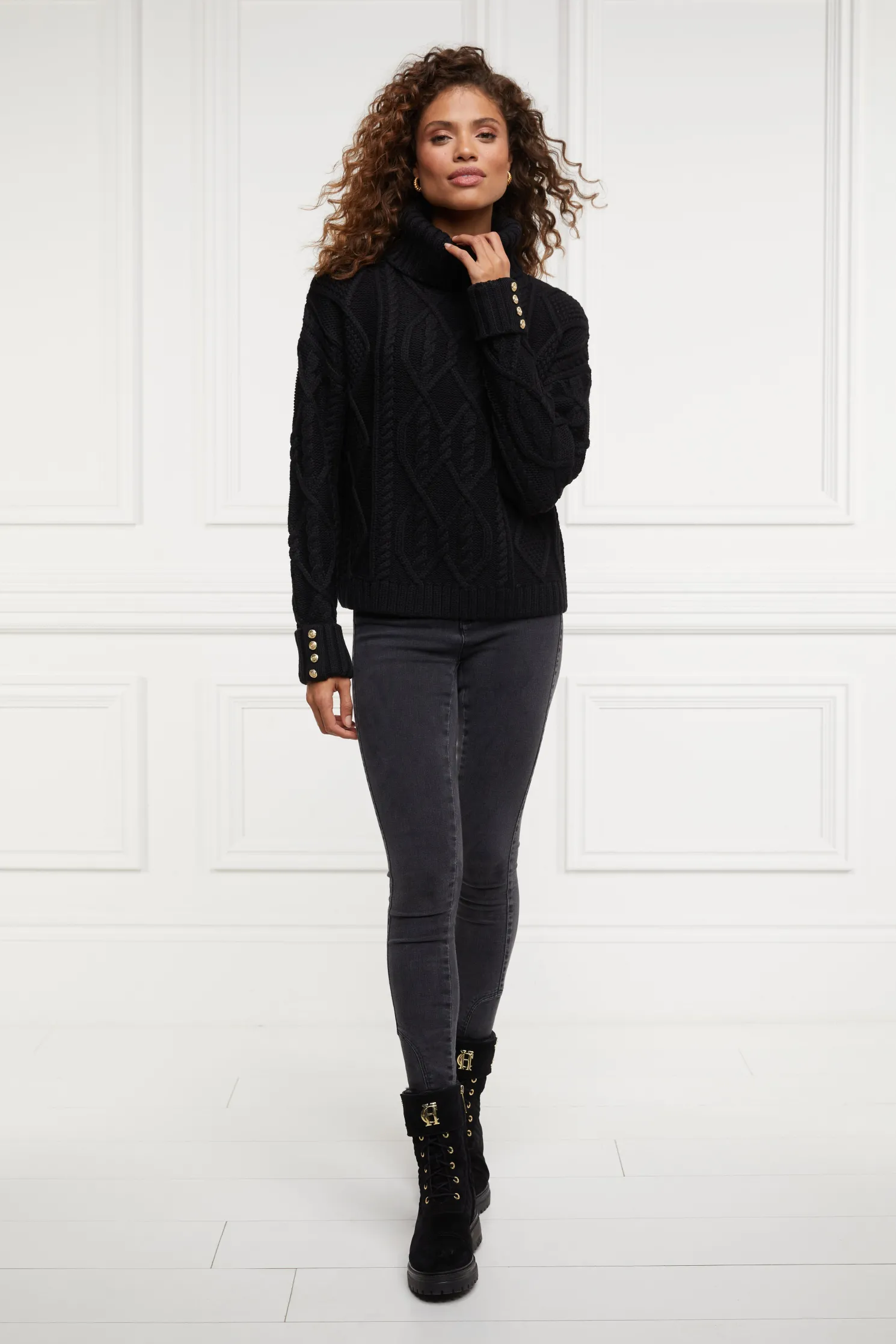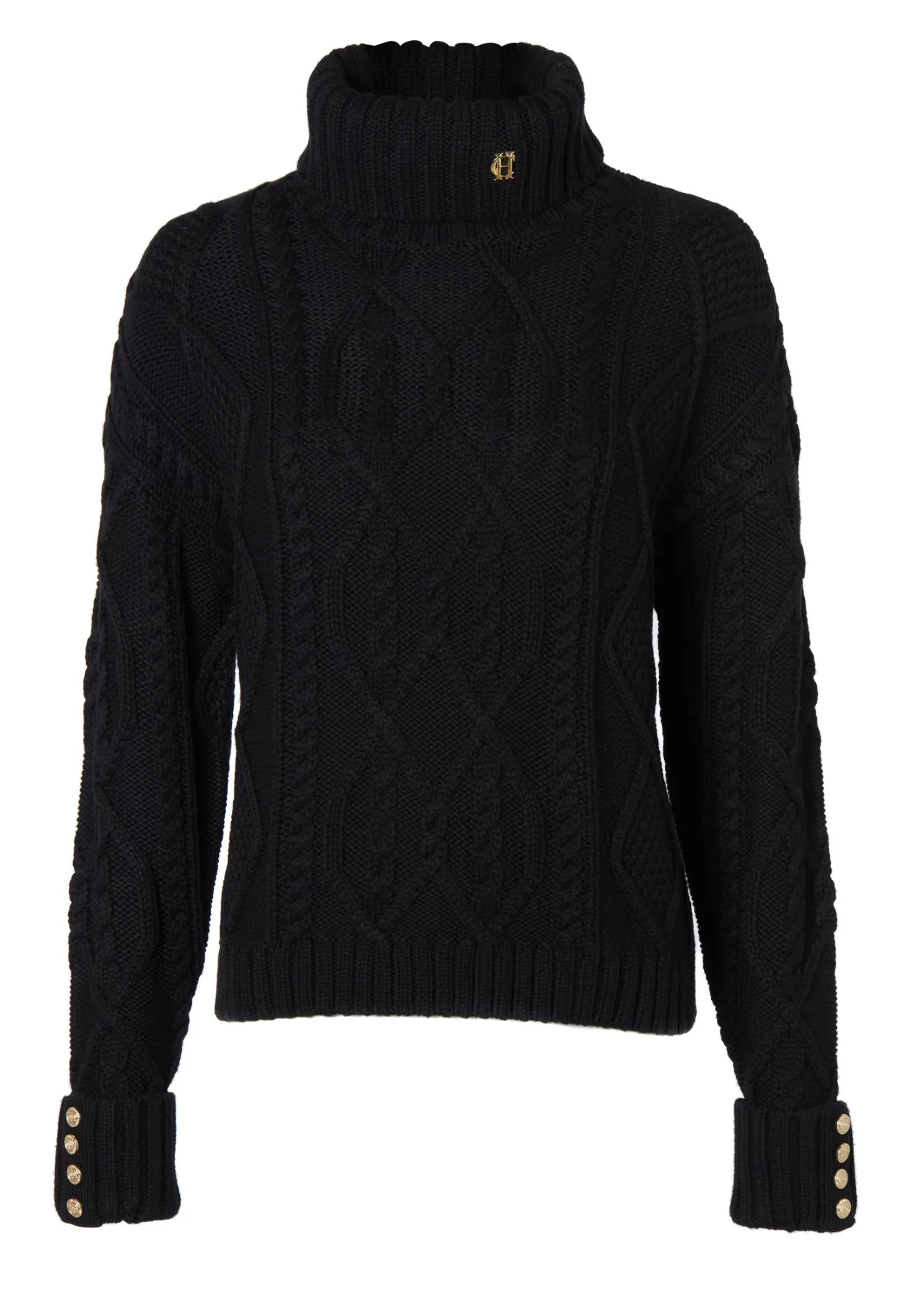 Crafted from sumptuously soft yarns with a modern cable knit design, the boxy fit and drop shoulder makes for a contemporary look & feel. Elevated with our signature gold rivets on the cuffs and HC hardware to the collar.