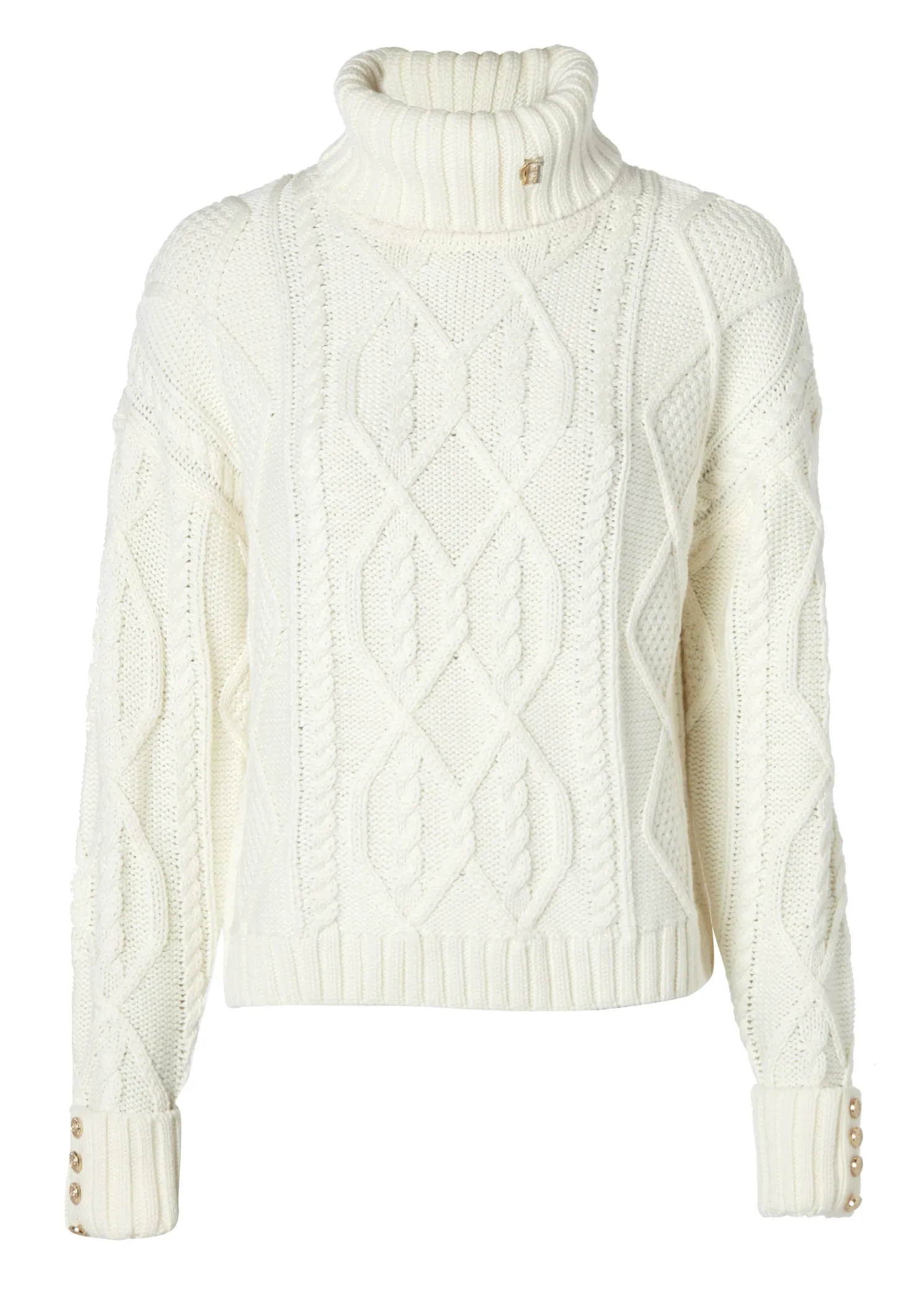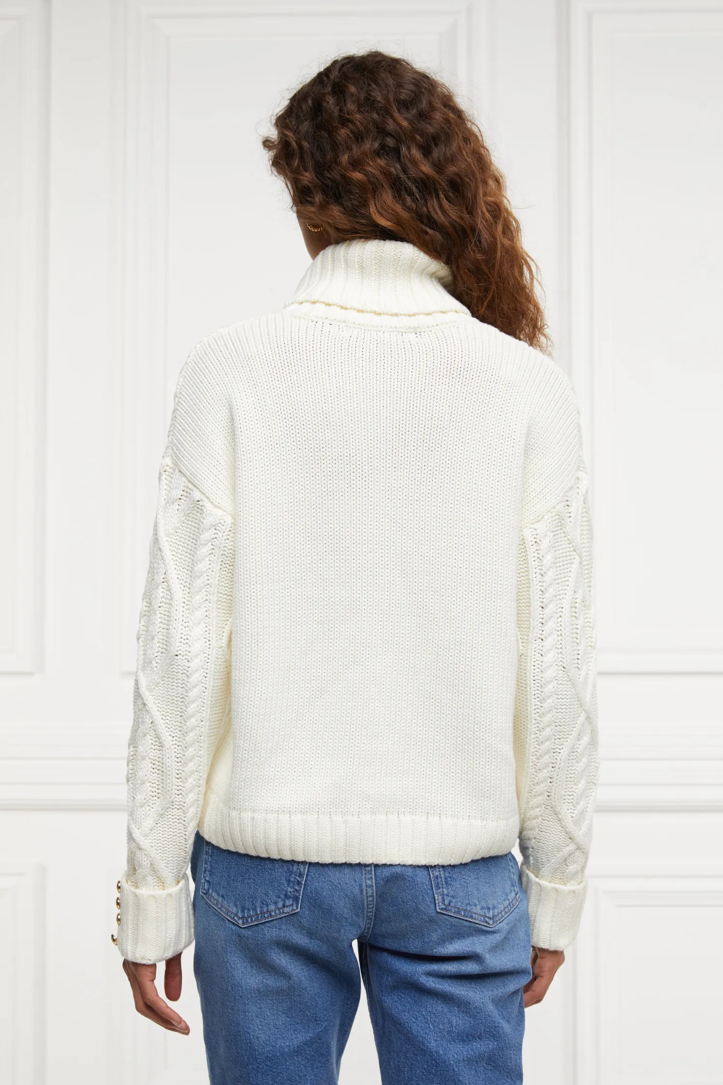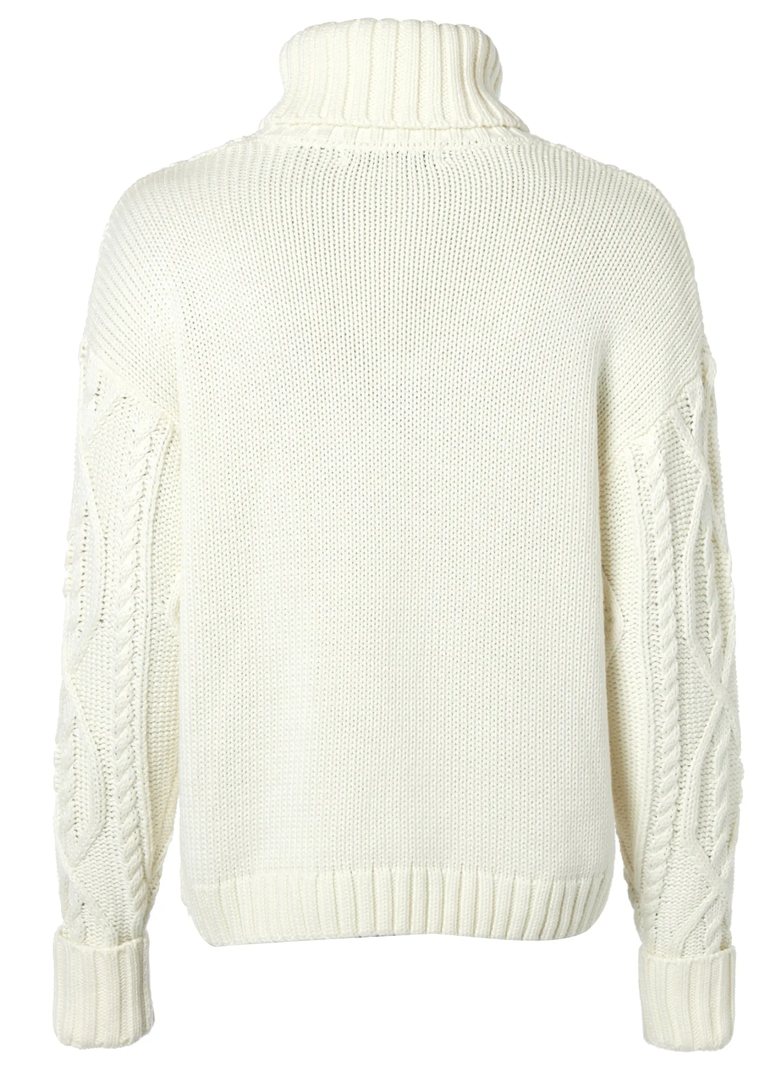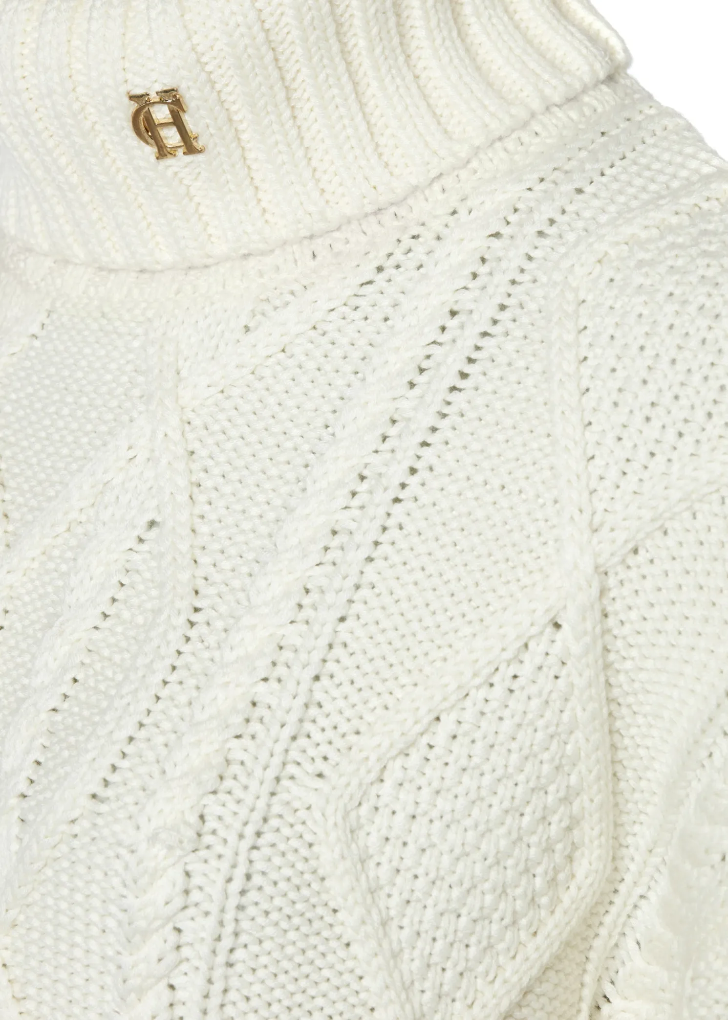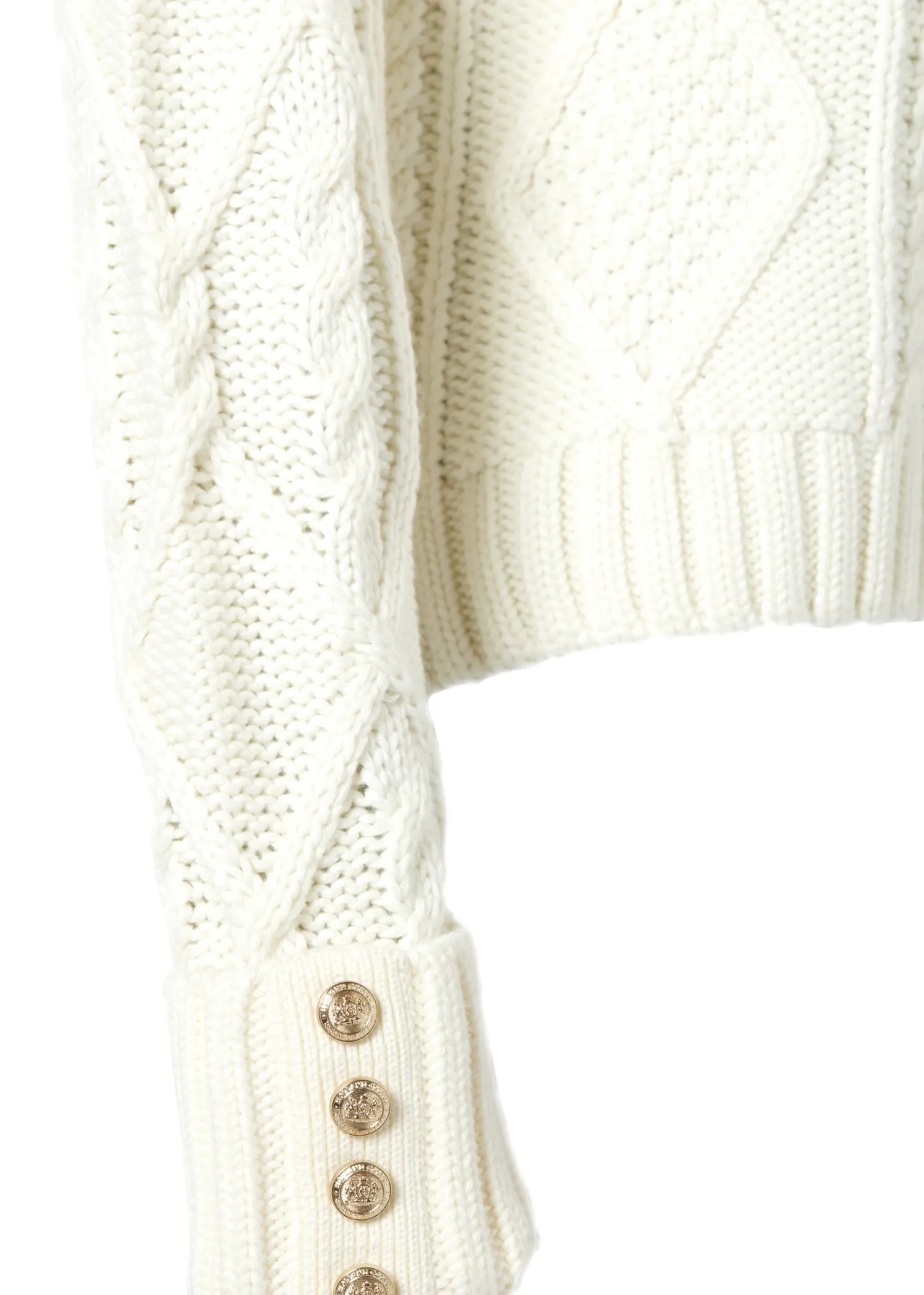 Crafted from sumptuously soft yarns with a modern cable knit design, the boxy fit and drop shoulder makes for a contemporary look & feel. Elevated with our signature gold rivets on the cuffs and HC hardware to the collar.
