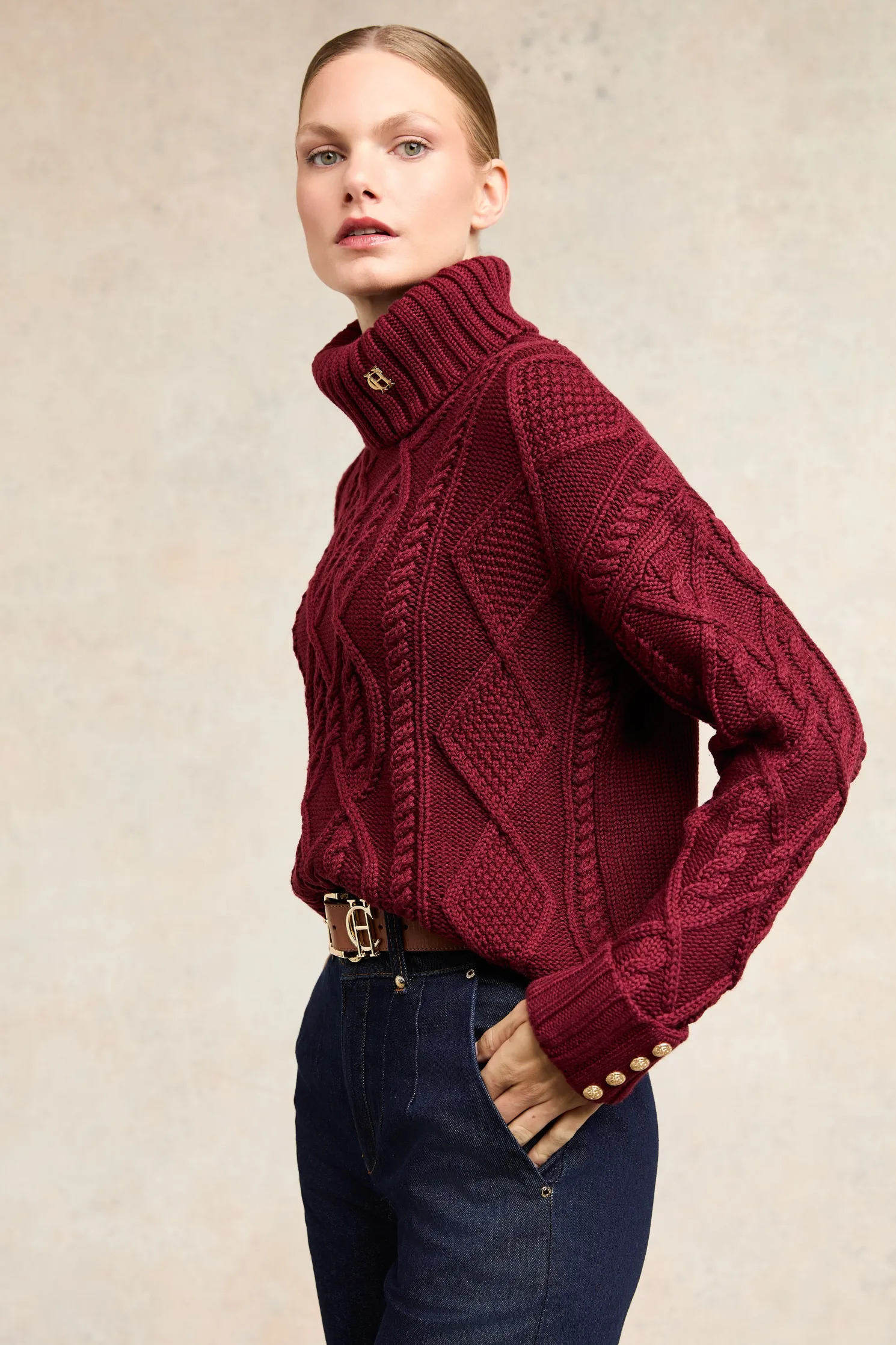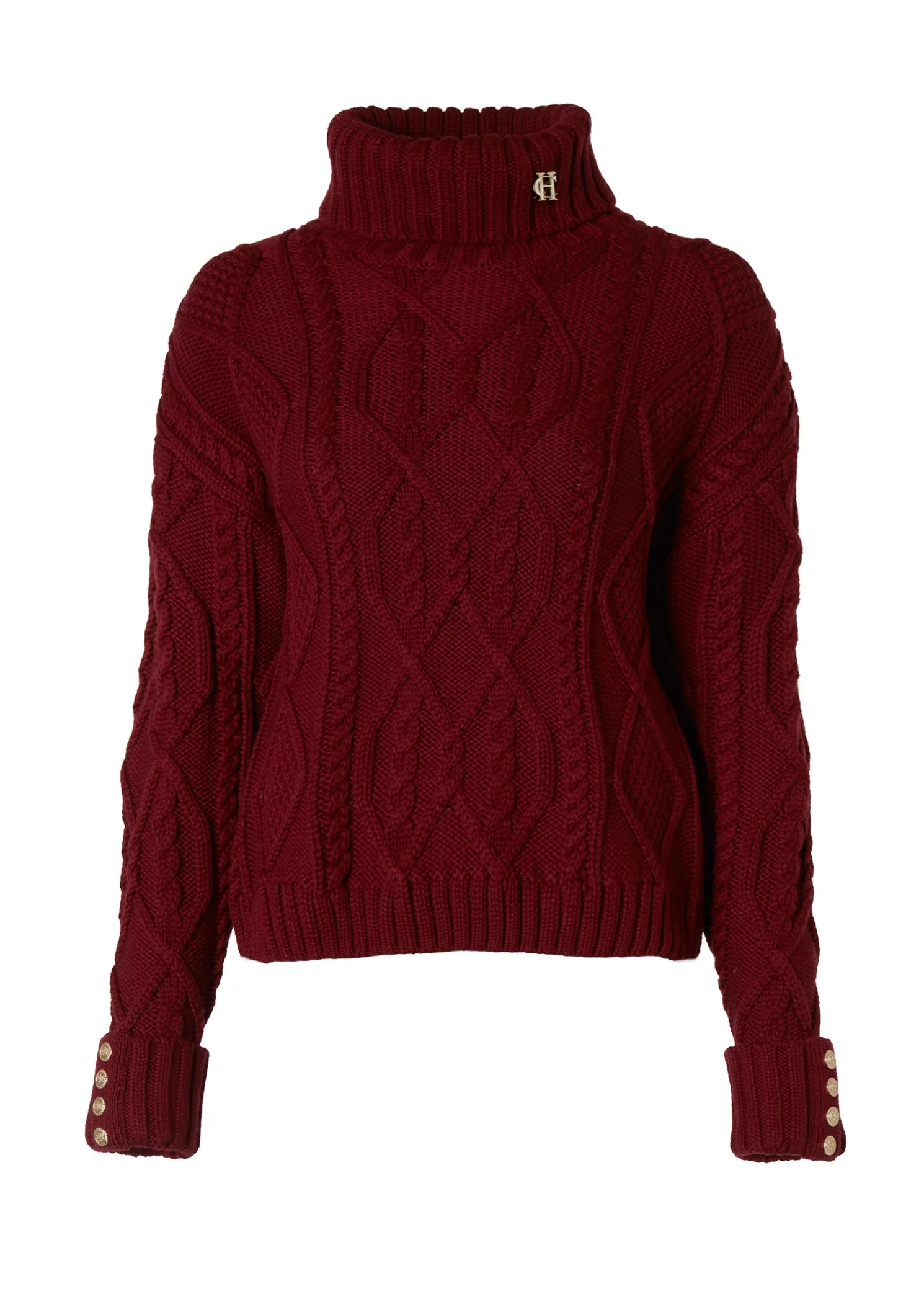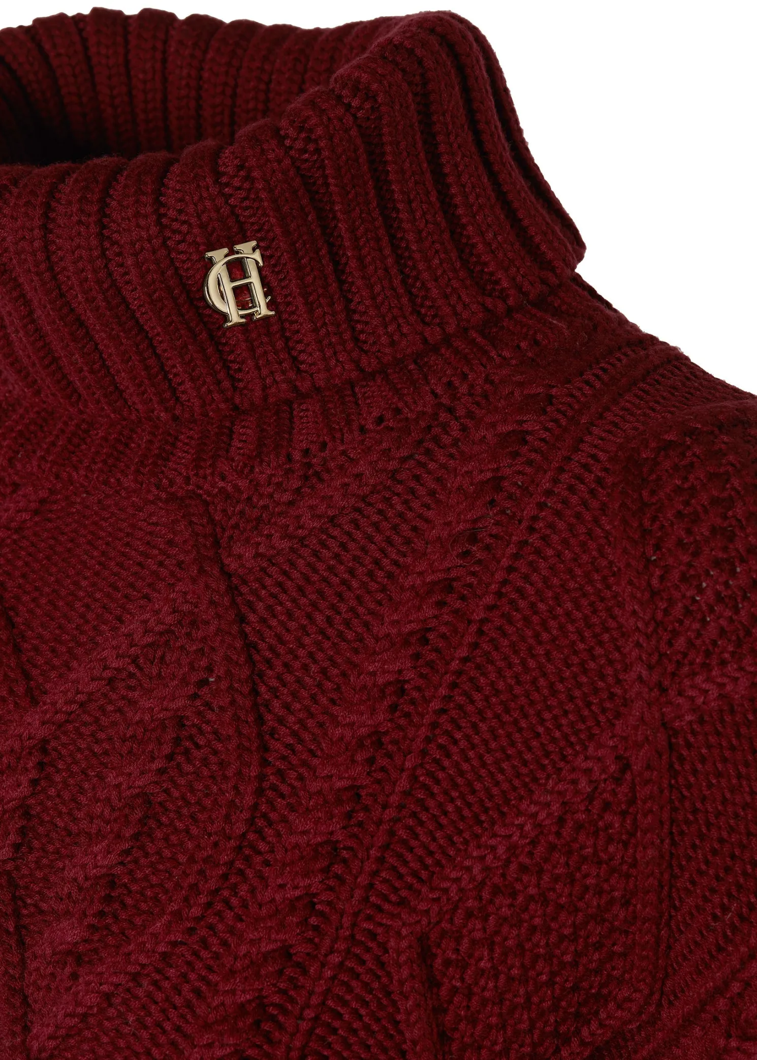A timeless piece that combines classic design with luxurious details. This knit features a beautifully crafted cable design on the body, adding texture and elegance. The iconic HC hardware adorns the collar, while the long sleeves are finished with ribbed cuffs and gold rivets for a touch of sophistication. A ribbed hem completes the look, ensuring a flattering fit. This knit is a perfect blend of tradition and style, making it a versatile addition to your wardrobe.