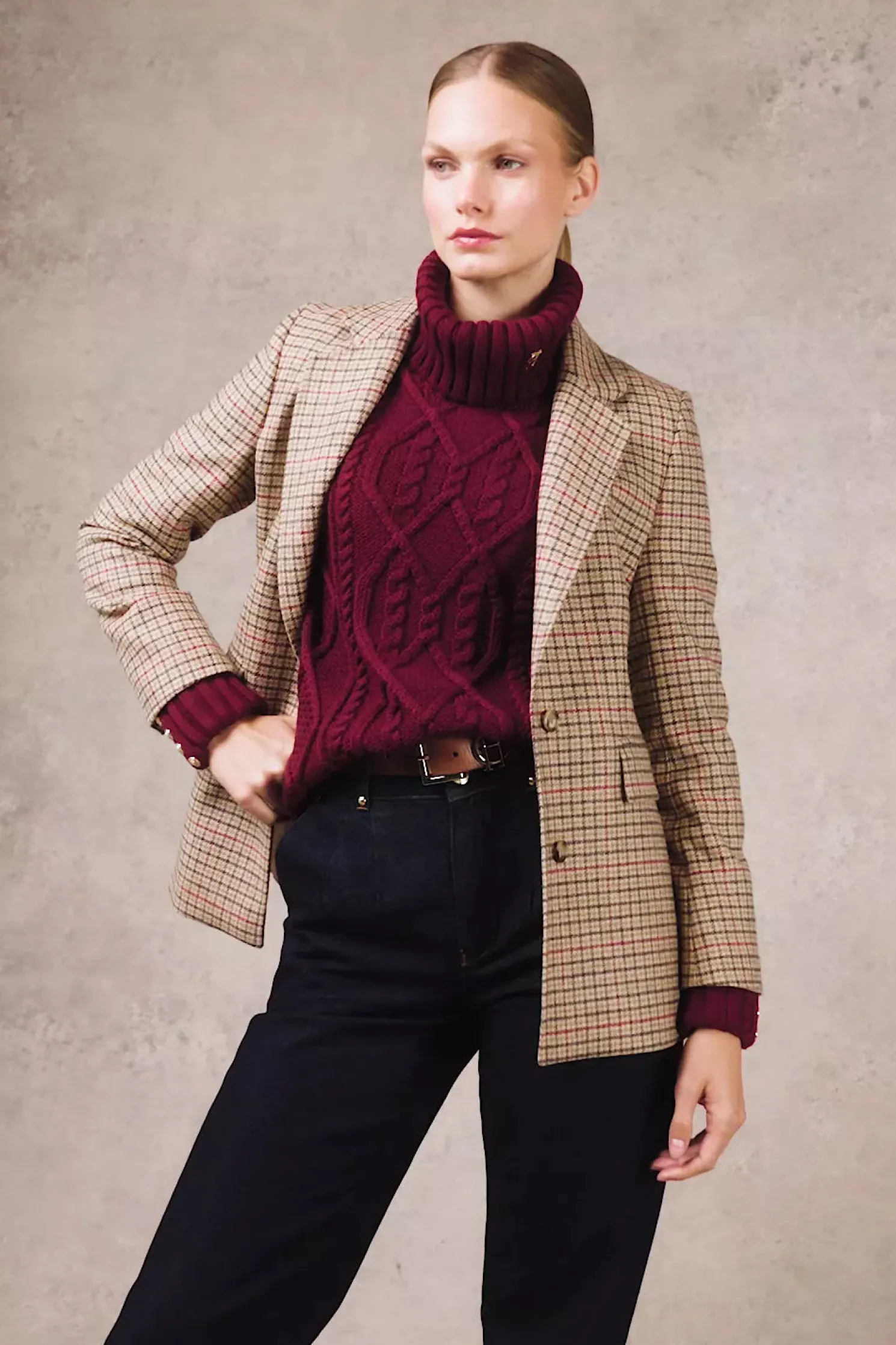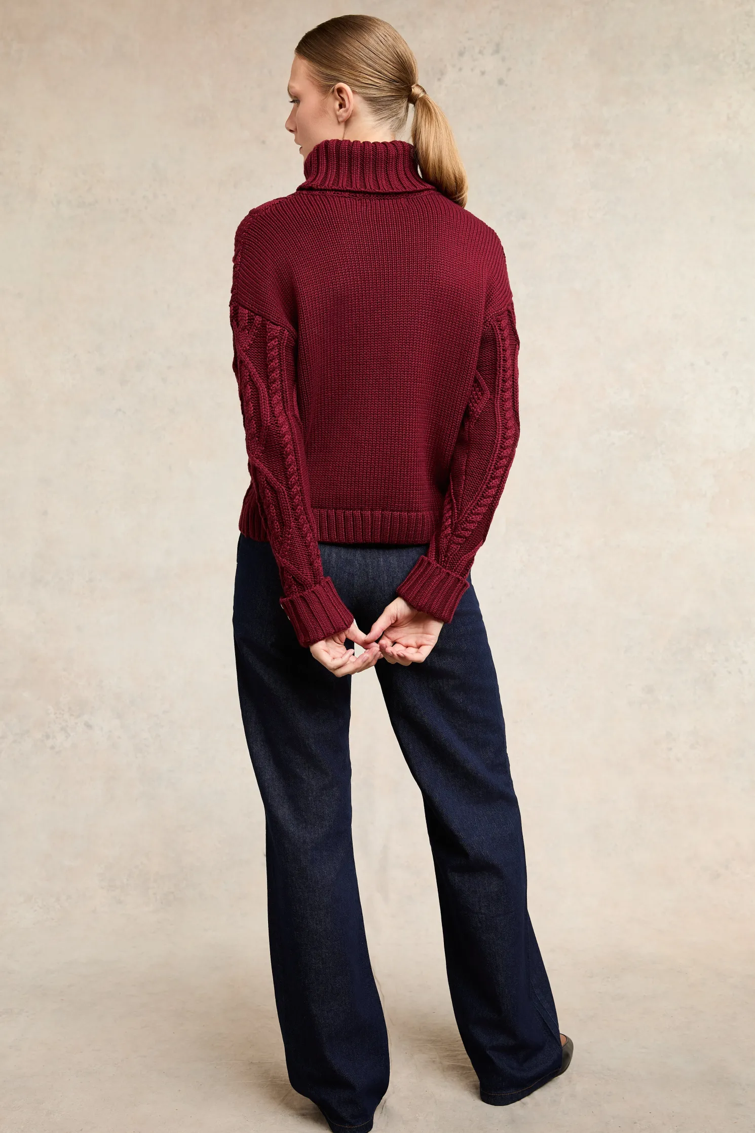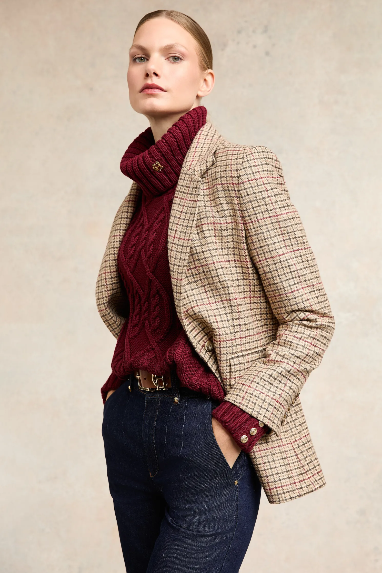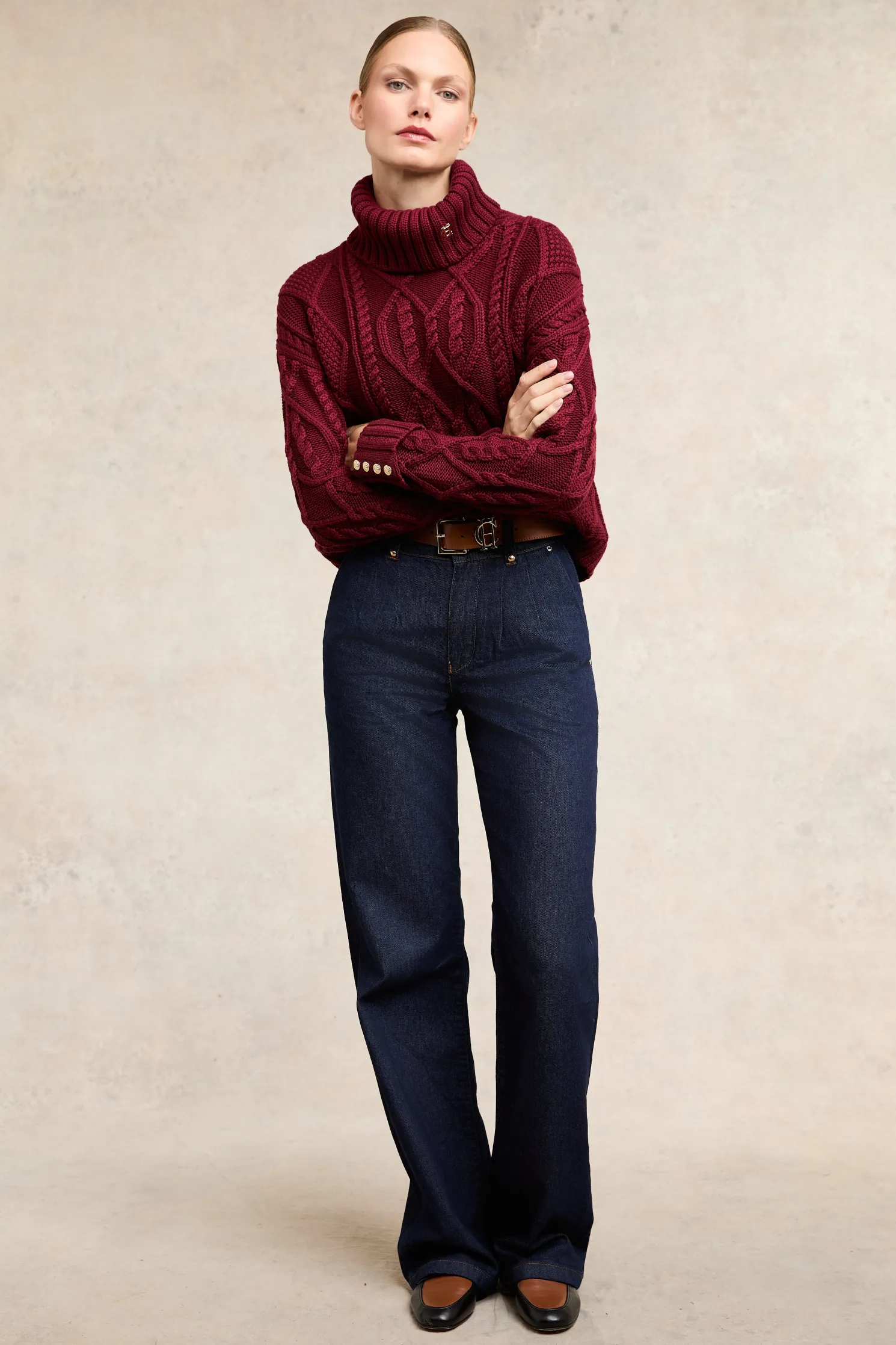 A timeless piece that combines classic design with luxurious details. This knit features a beautifully crafted cable design on the body, adding texture and elegance. The iconic HC hardware adorns the collar, while the long sleeves are finished with ribbed cuffs and gold rivets for a touch of sophistication. A ribbed hem completes the look, ensuring a flattering fit. This knit is a perfect blend of tradition and style, making it a versatile addition to your wardrobe.
