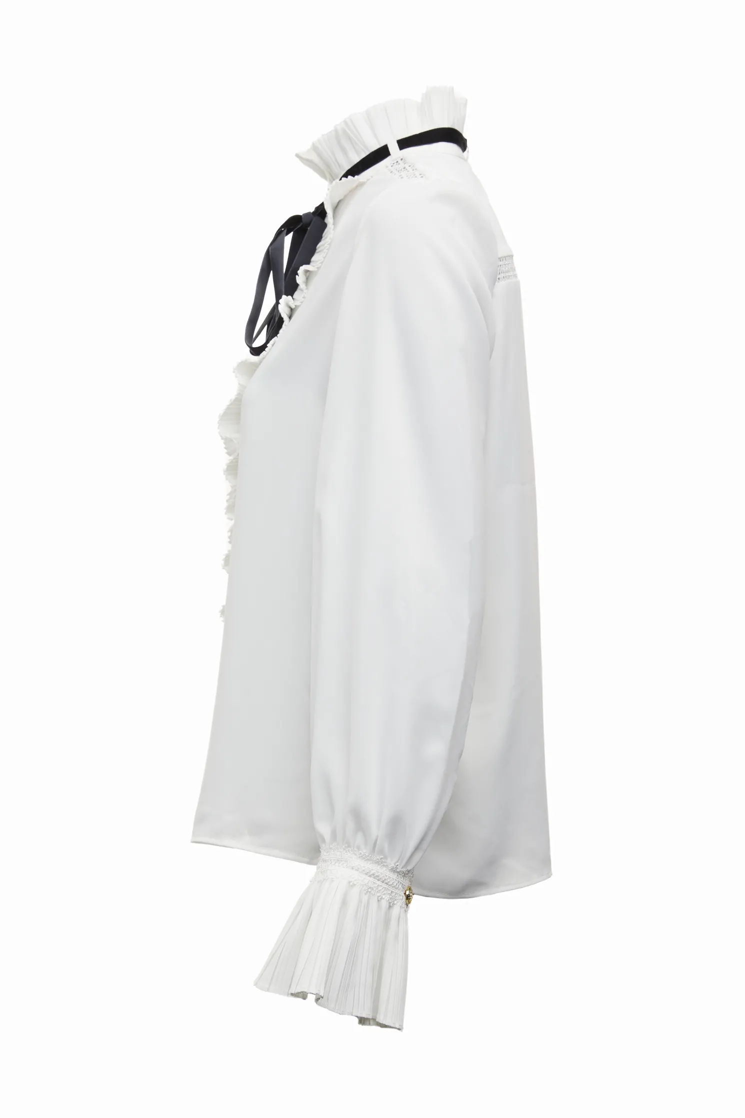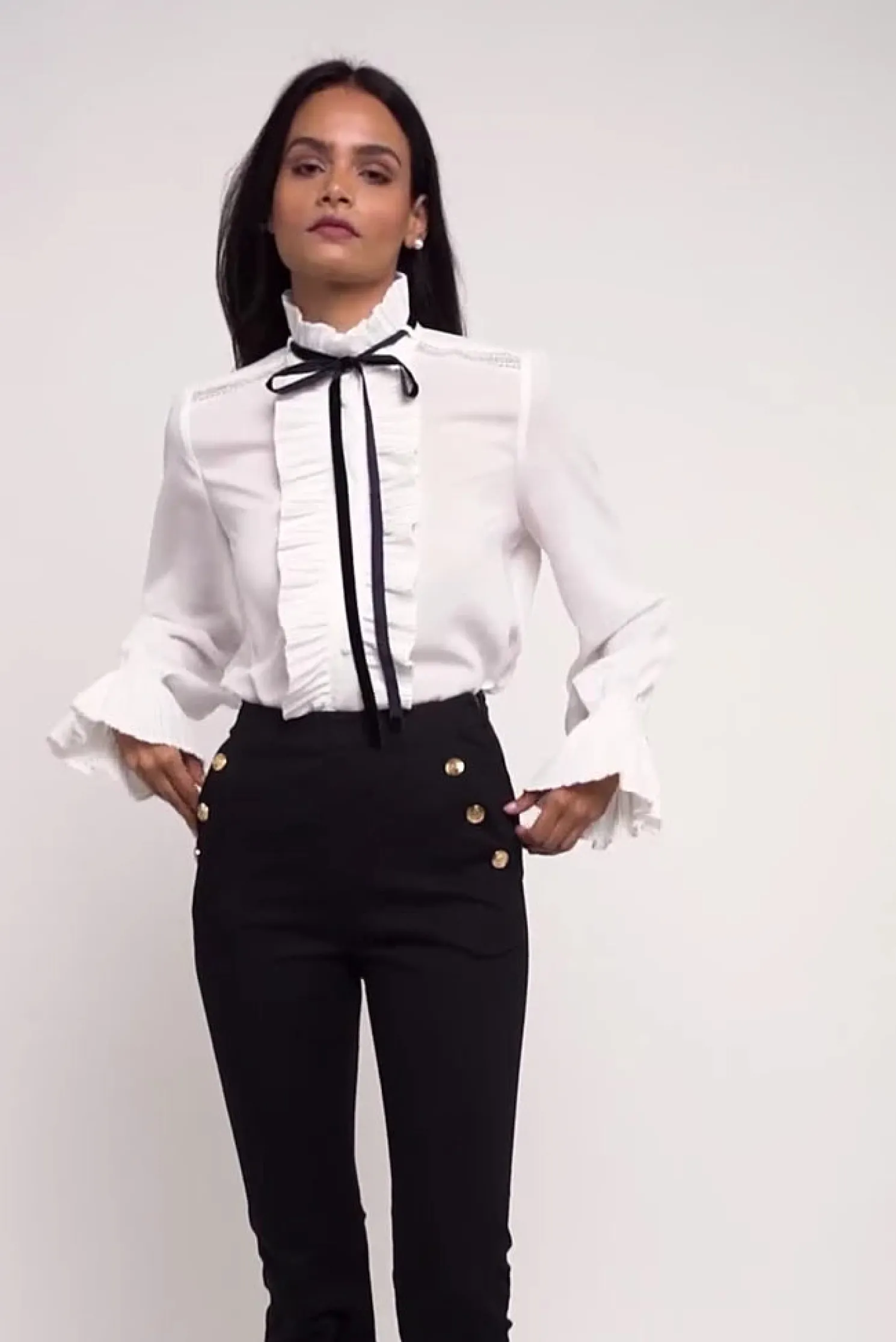Elegant and sophisticated, the Olivia Tie Shirt has been created with a relaxed yet tailored fit, perfect for any occasion. The shirt has a luxurious, removable velvet tie around the collar along with delicate lace on the shoulders and cuffs. This shirt also features our signature HC gold hardware to the cuff and matched buttons to the front for an elegant look.