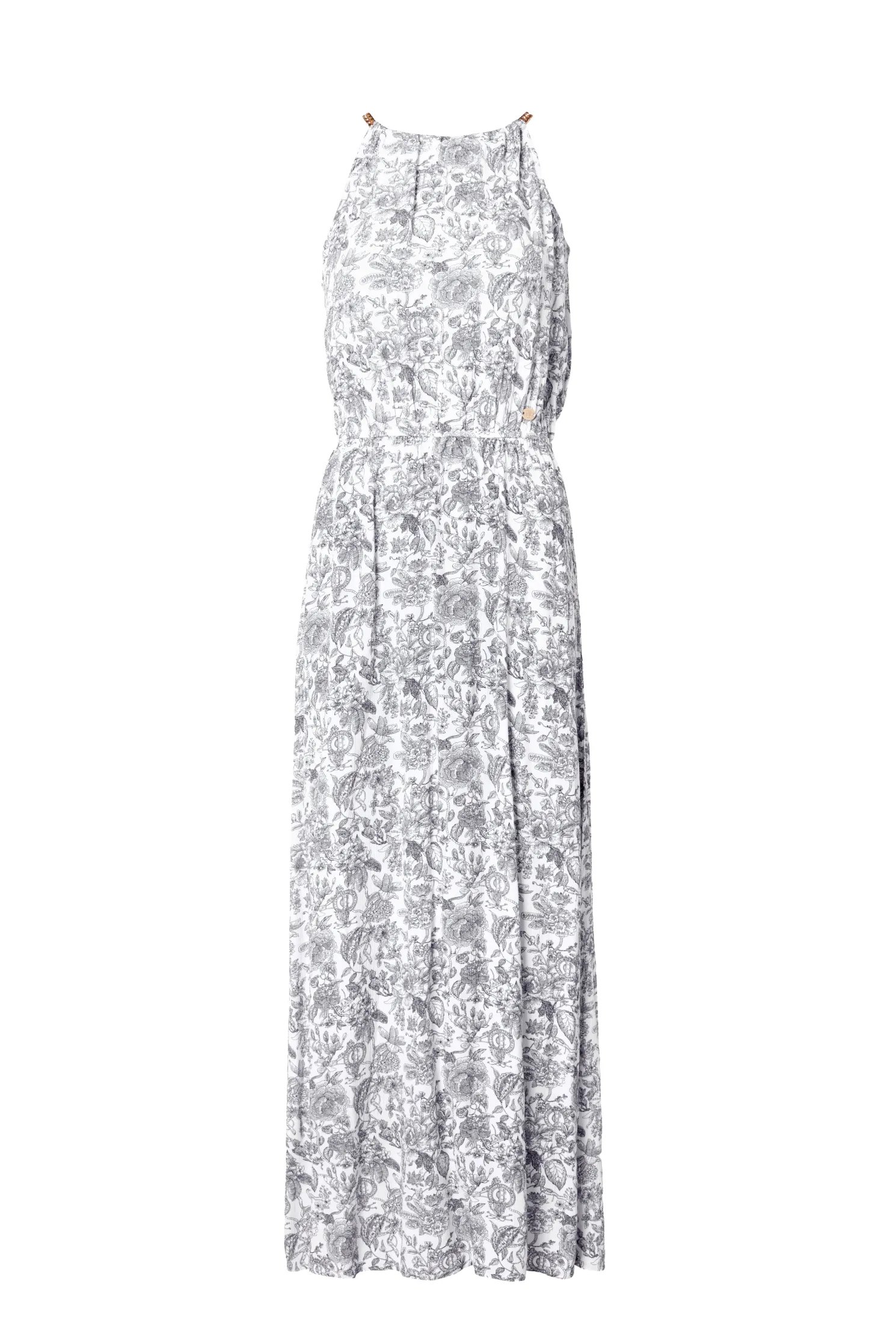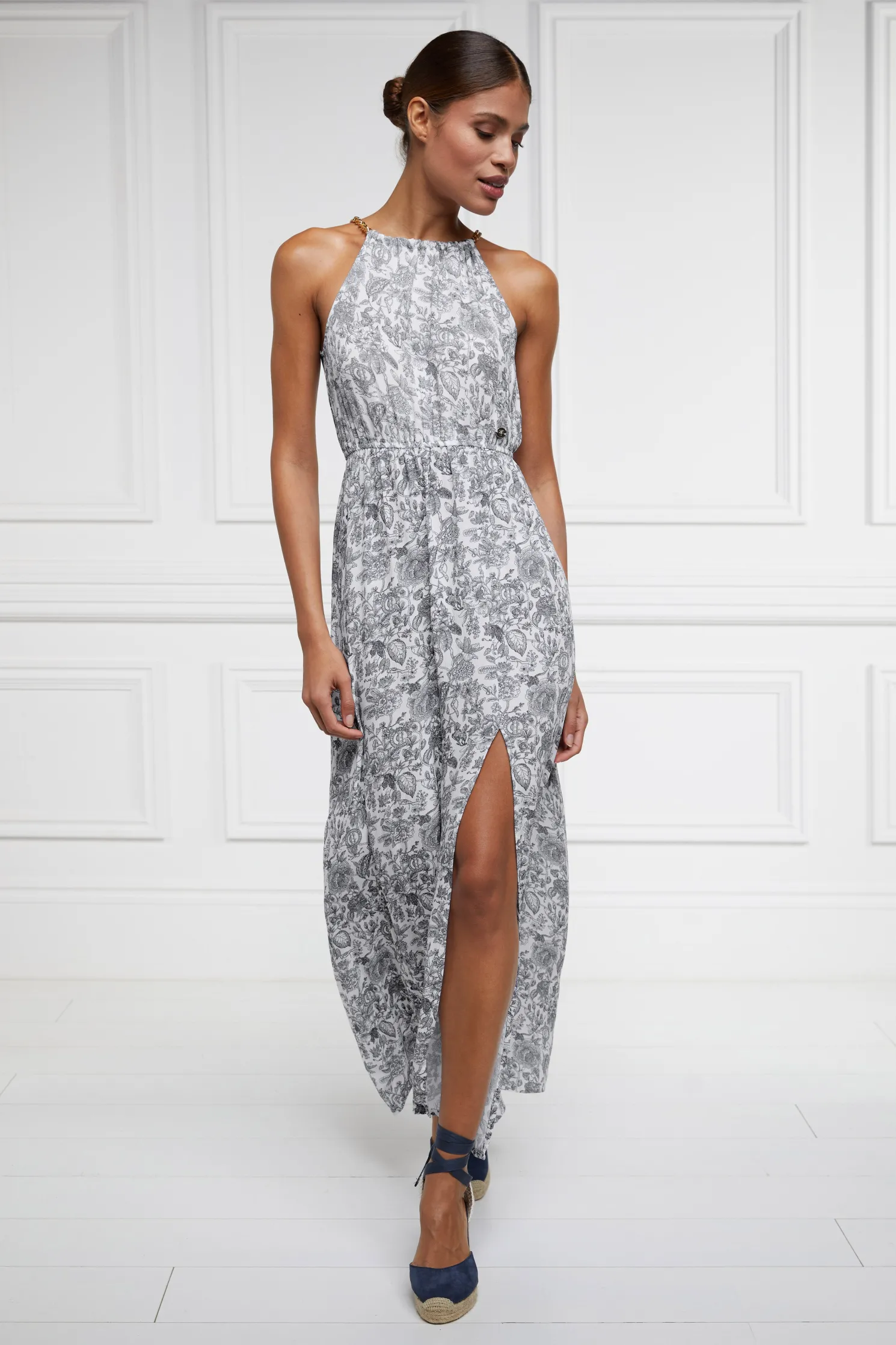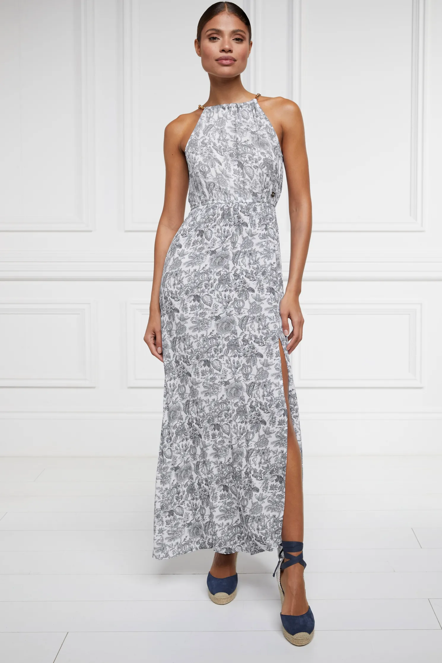 Designed with a halter neckline, this feminine dress has been created with a relaxed silhouette and floaty fit. With a cinched-in waist, the skirt bottom has a subtle side split detail.