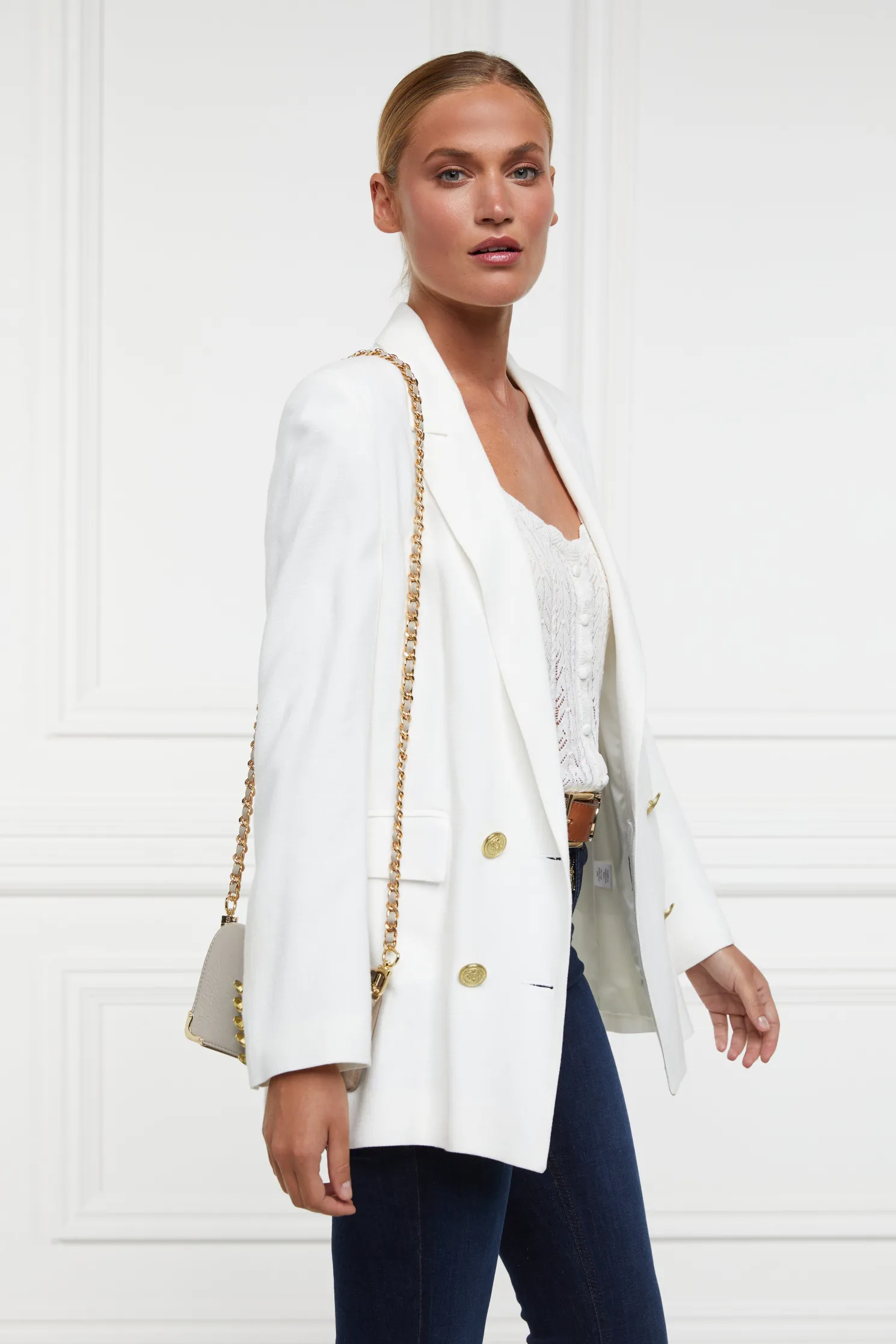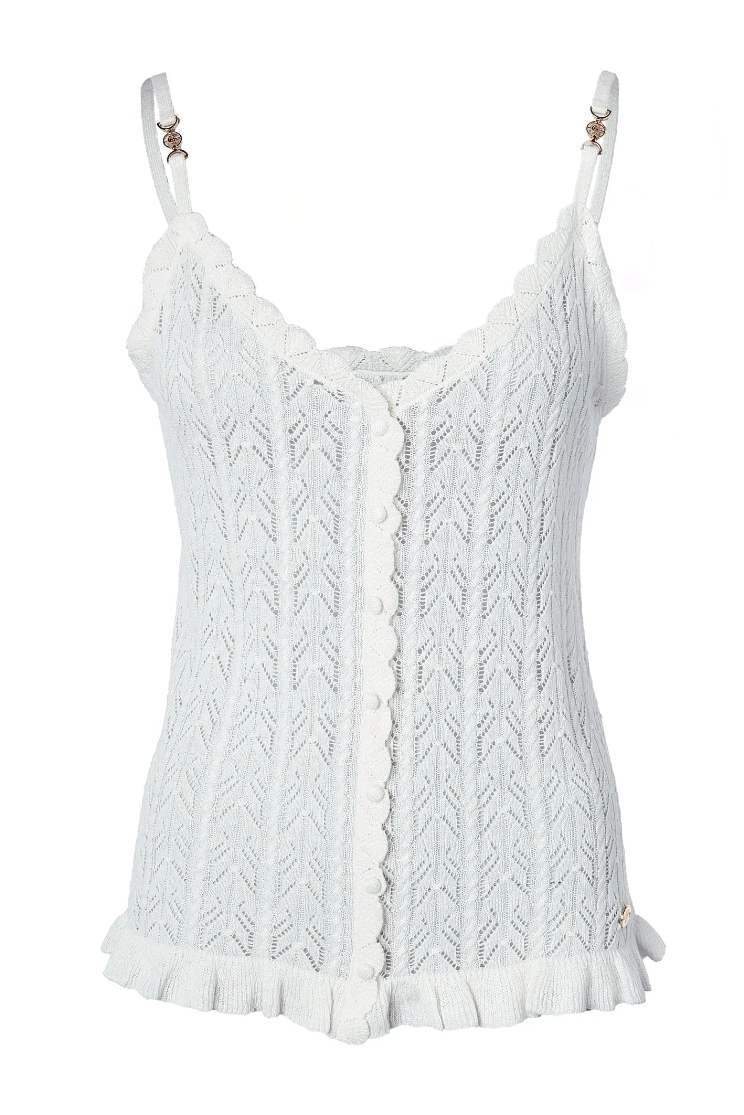 Designed for a relaxed fit, this vest top has been crafted from the softest cotton to ensure both comfort and an elegant drape. Enhanced by a deep v-neckline and a delicate pointelle stitch, the scalloped finishings and HC strap hardware add a subtle edge to this everyday piece. Detailed with fabric-covered buttons to the front.