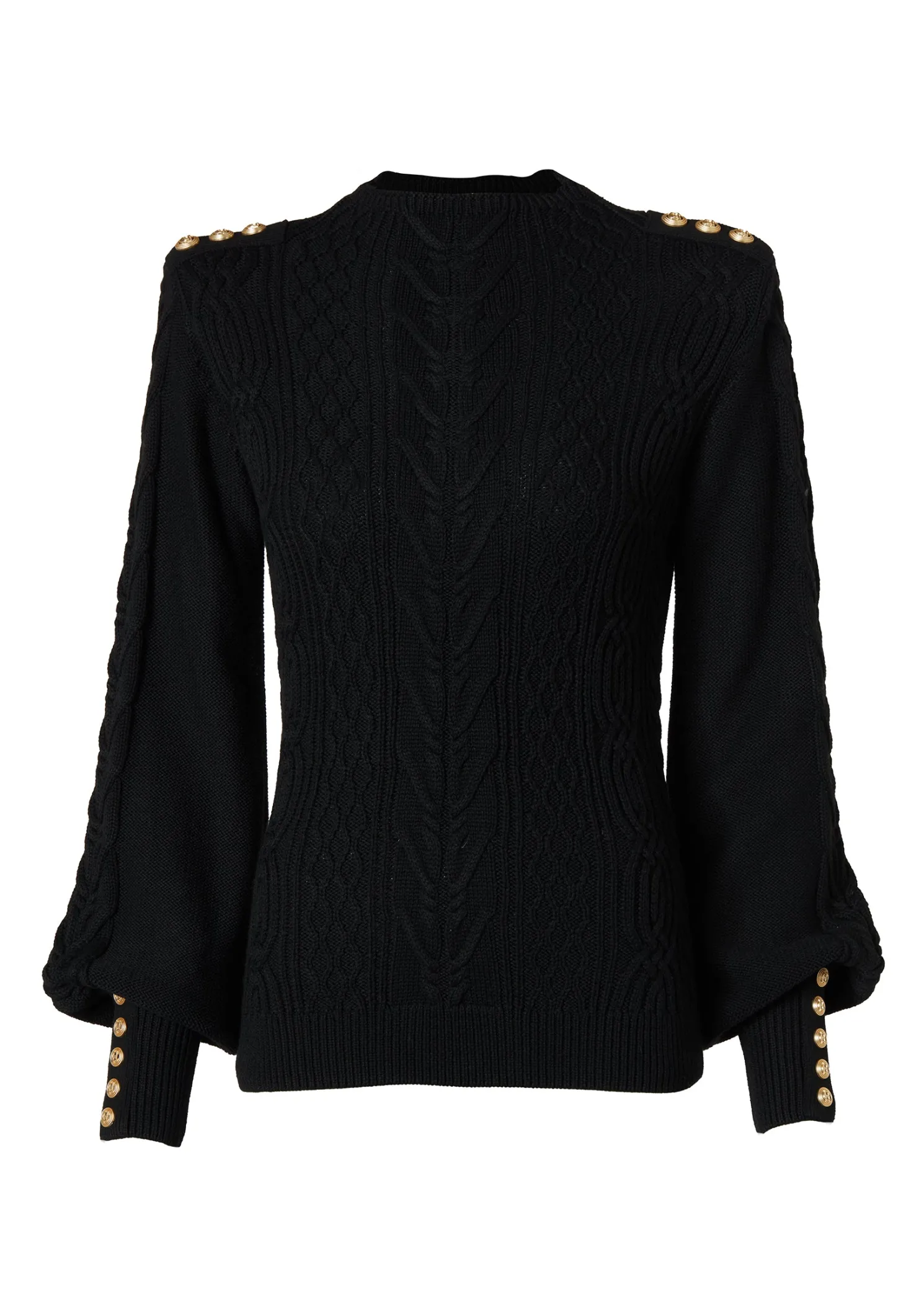 The Rachel Knit is a chic and versatile piece, featuring mixed cabling detail on the front for added texture and depth. With a slim fit throughout the body and full sleeves, this knit offers a flattering silhouette. Signature hardware on the shoulders and cuffs adds a touch of elegance, making it a perfect blend of style and sophistication for any occasion.