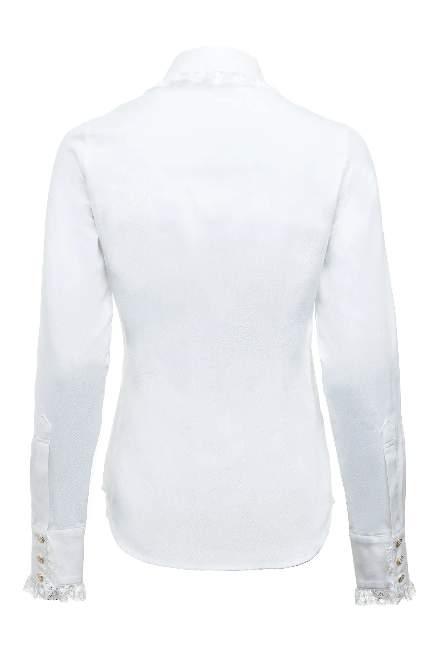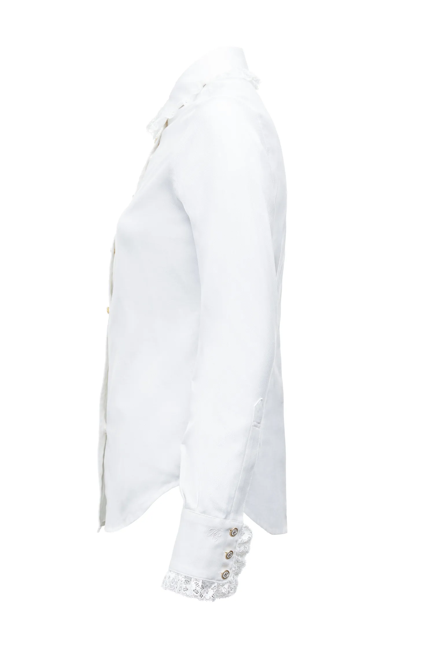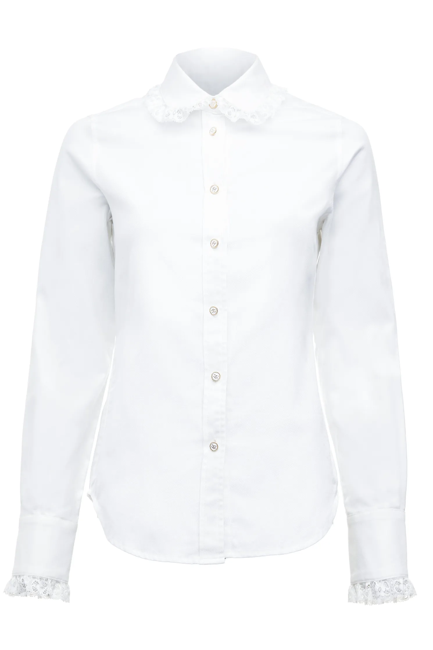 The Rose Shirt puts a romantic pin on a classic white shirt, and the results are the epitome of beauty and femininity. It’s made from sumptuously soft cotton and finished with delicate lace trim around the collar and cuffs.