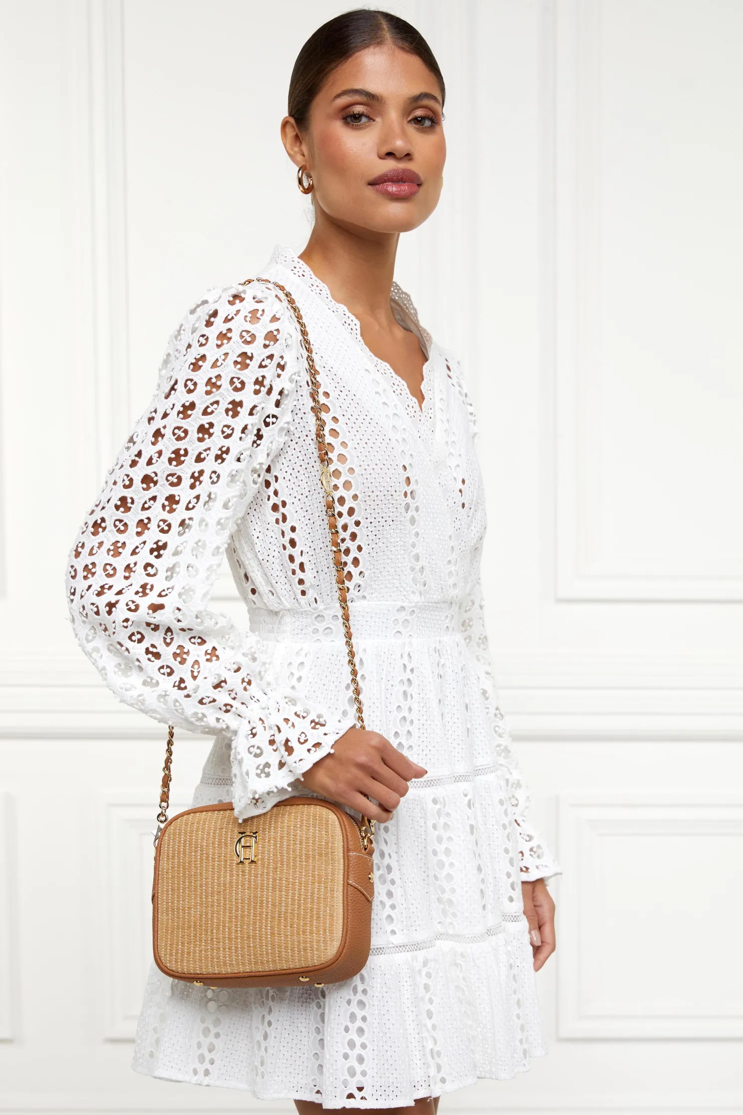 Designed with a classic camera bag shape with a woven jute composition and waterproof coating. Created with a sleek compact profile with internal zip pocket and card holder for ensuring your valuables are kept safe. With an elegant chain shoulder strap with HC trim & bold HC logo to the front.