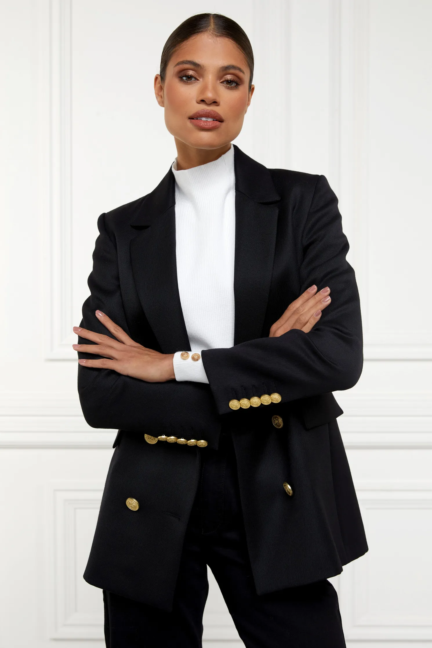 A classic and stylish addition to your wardrobe. This elegant knit features a high neckline and distinctive traveling ribs on the raglan sleeves, adding a unique texture and design. Horn rivets on the cuffs lend a touch of luxury, while the slim fit through the body creates a flattering silhouette. The Tara High Neck Knit is the perfect blend of chic design and refined details, making it an essential piece for any season.