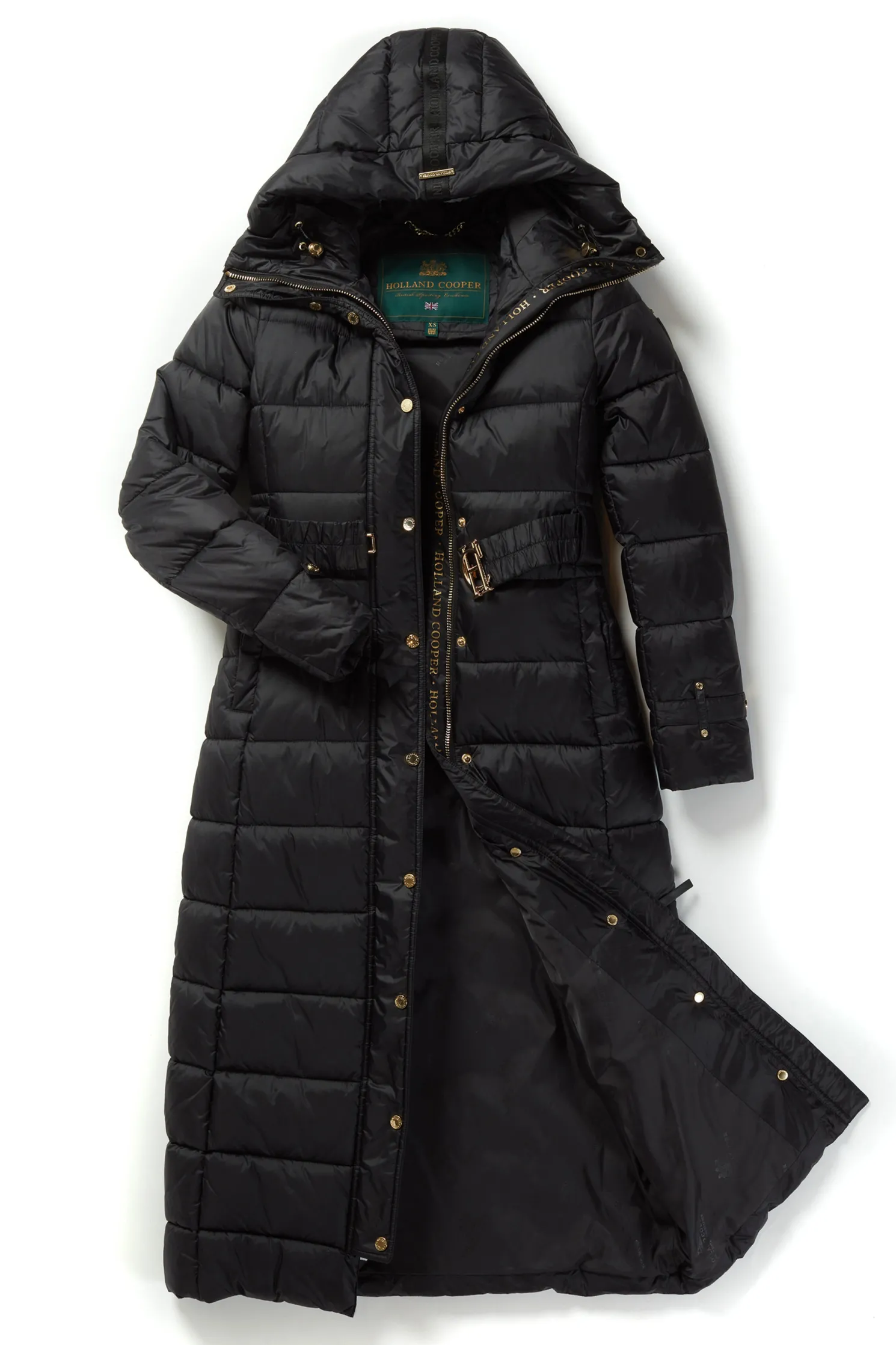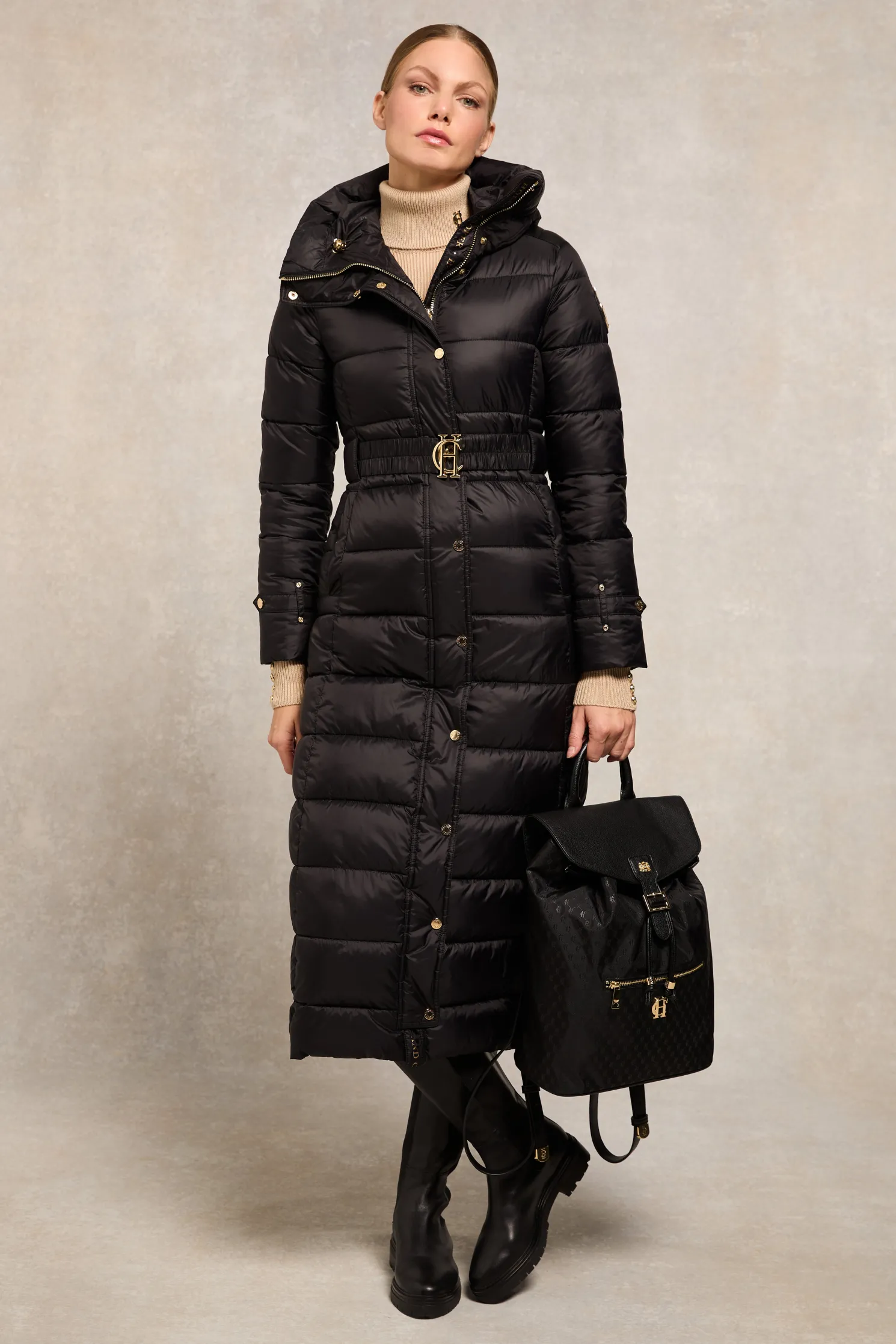 Providing a slimming silhouette with its integrated belt to cinch you in, this coat is an elegant and sophisticated alternative to your typical padded outerwear. Filled with a premium eco fill for ultimate warmth and decorated with gold metal hardware. Detailed with a jacquard branded belt with iconic HC gold buckle with a bold & oversized face-framing hood.