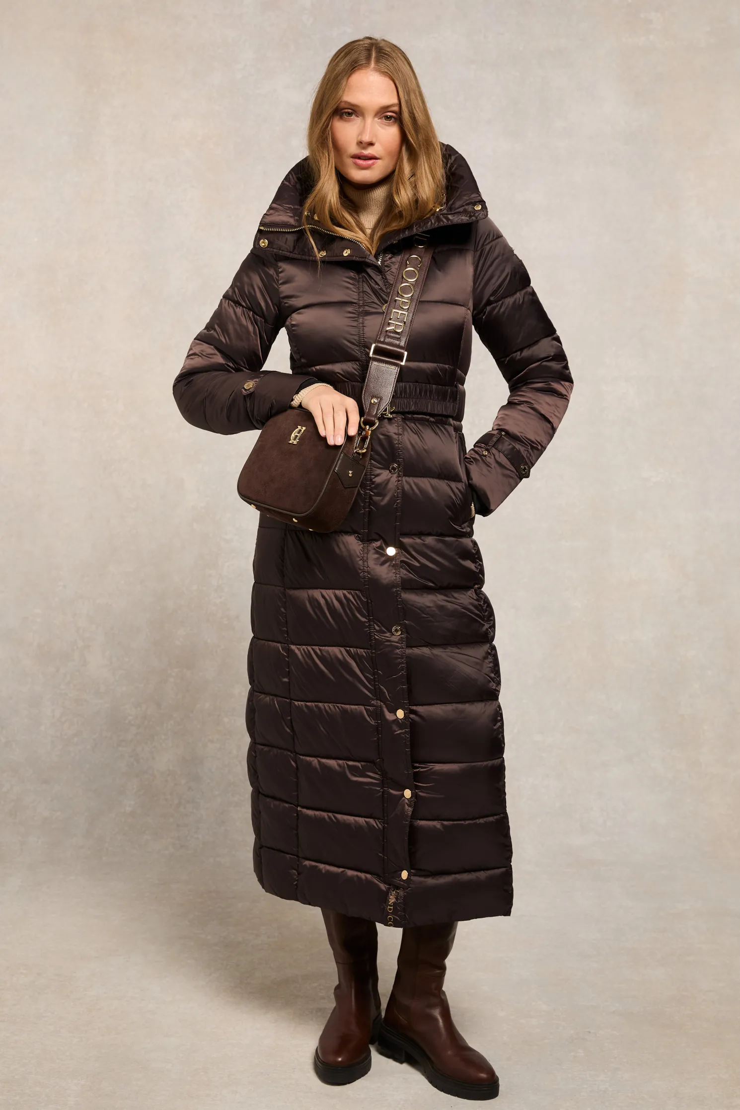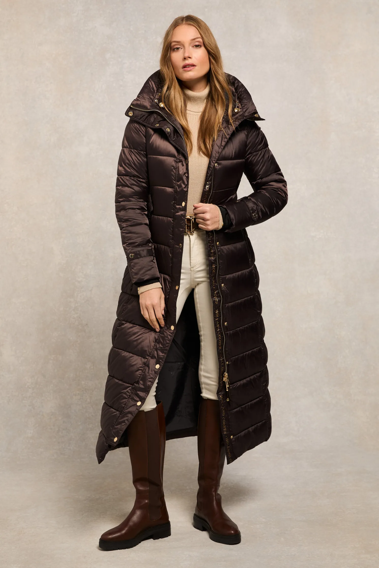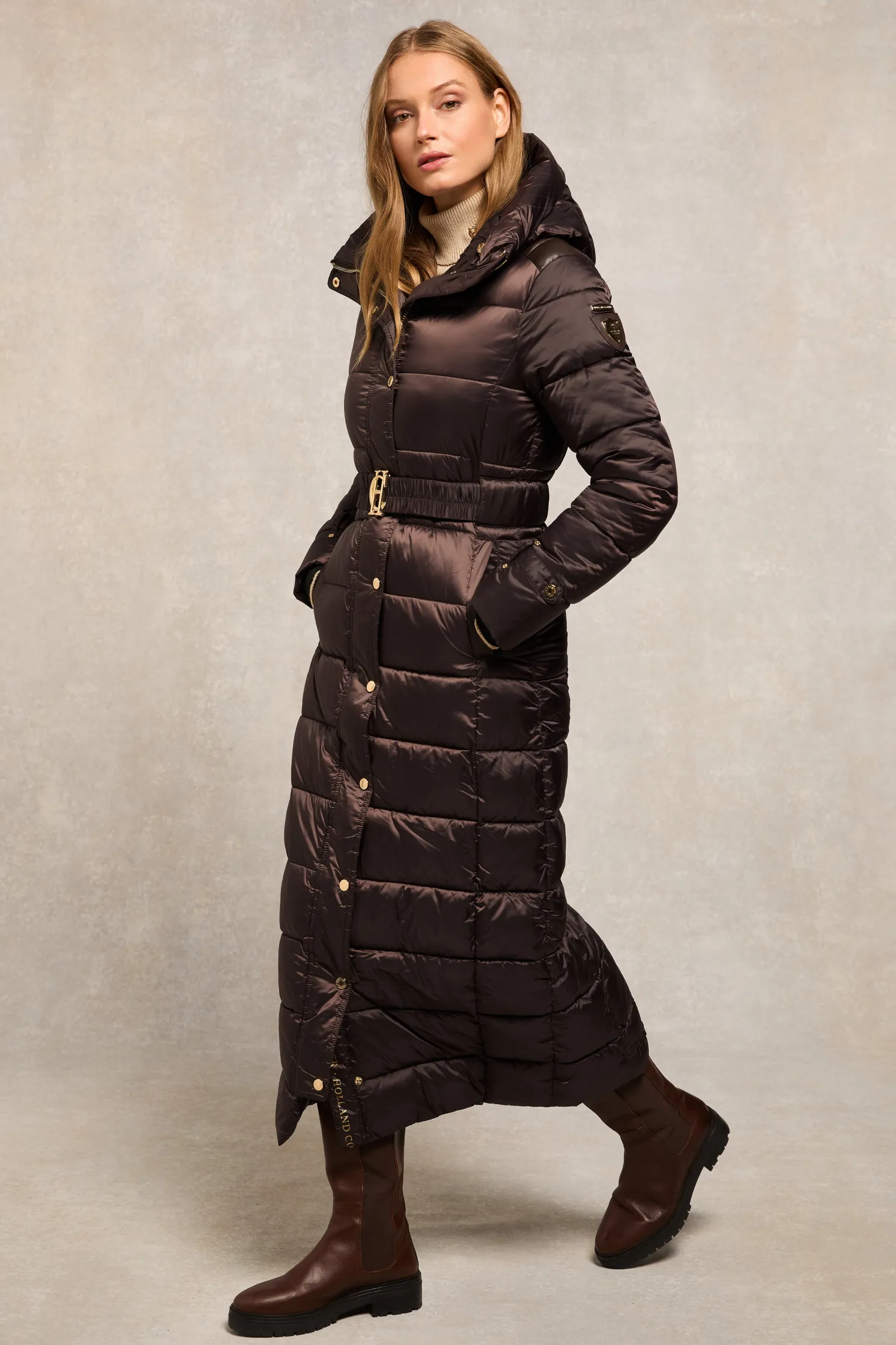 Providing a slimming silhouette with its integrated belt to cinch you in, this coat is an elegant and sophisticated alternative to your typical padded outerwear. Filled with a premium eco fill for ultimate warmth and decorated with gold metal hardware. Detailed with a jacquard branded belt with iconic HC gold buckle with a bold & oversized face-framing hood.