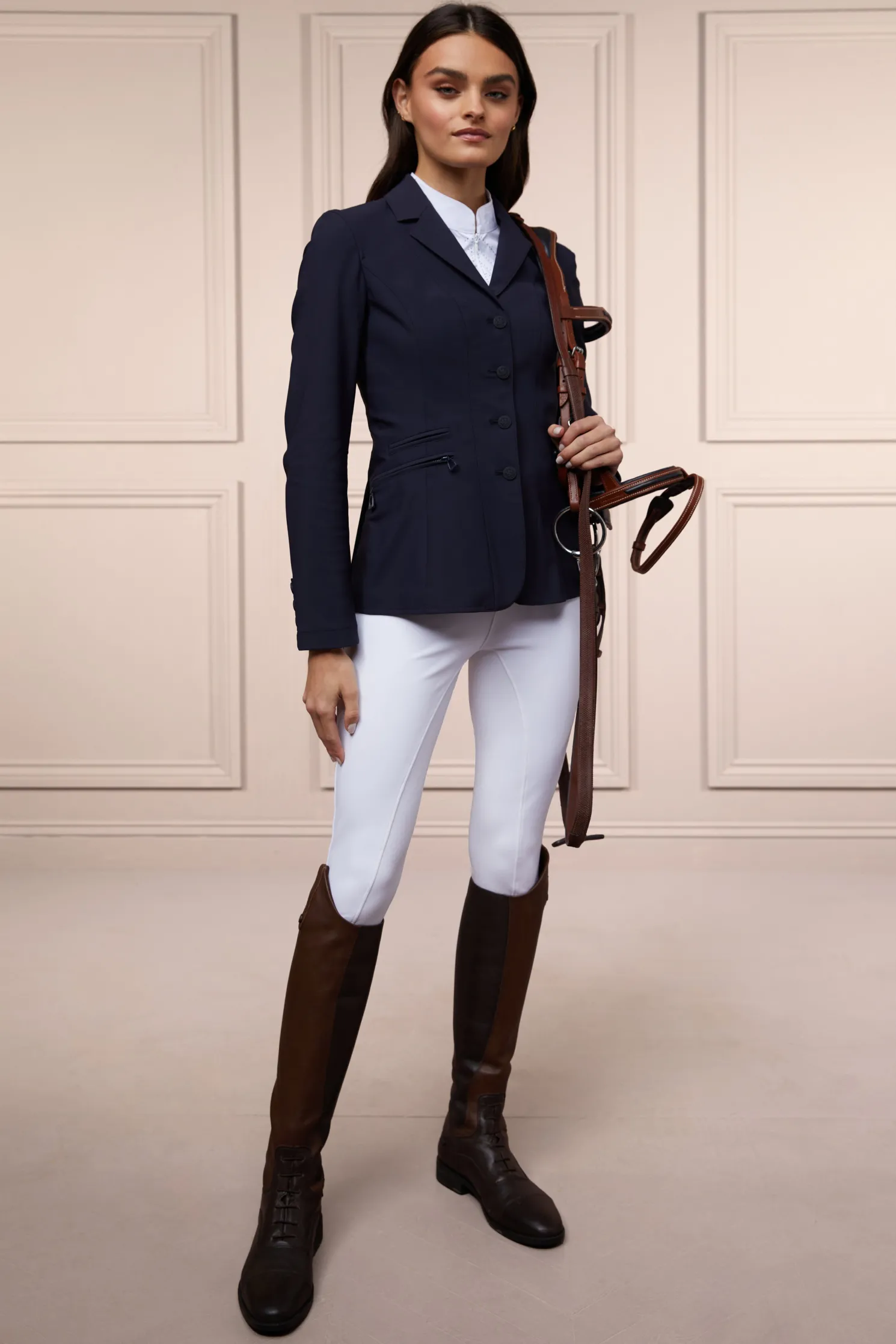 Meticulously tailored for a flattering slim fit, this competition jacket is a must-have for all competition riders. Constructed with a breathable mesh lining and showerproof outer shell, we’ve ensured extra stretch for comfort whilst in the saddle. Detailed with zip closure and faux button fastening to keep you secure whilst riding, finished with matte black hardware. This jacket adheres to GB competition regulations.