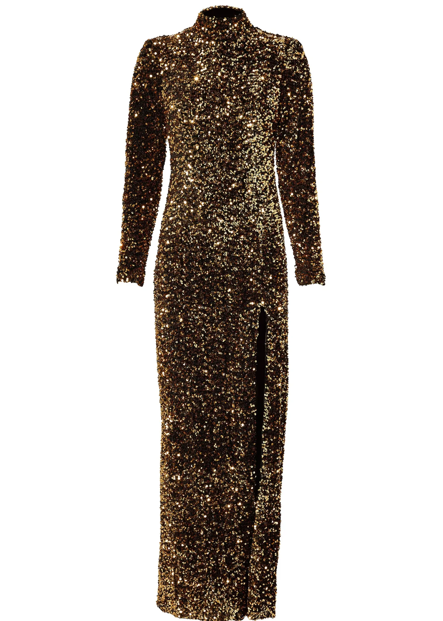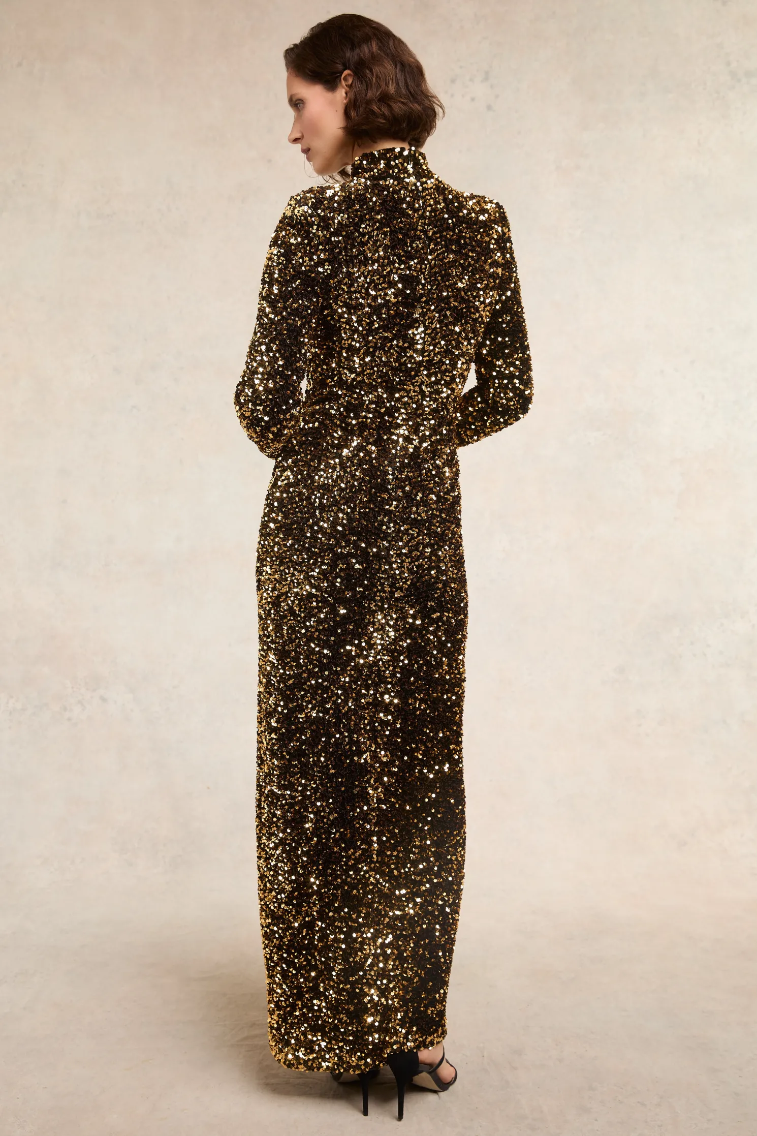 Elevate your evening look with the stunning Victoria Mini Sequin Dress. Designed to make a statement, this sleek piece features a powerful high neckline and long, super-slim sleeves that exude elegance. The exaggerated silhouette, enhanced by structured shoulder pads, creates a bold, fashion-forward presence. Crafted from a lustrous velvet-based sequin stretch fabric, this dress offers both comfort and shine. Signature gold metal hardware and a discreet zip opening at the centre back add luxurious finishing touches.