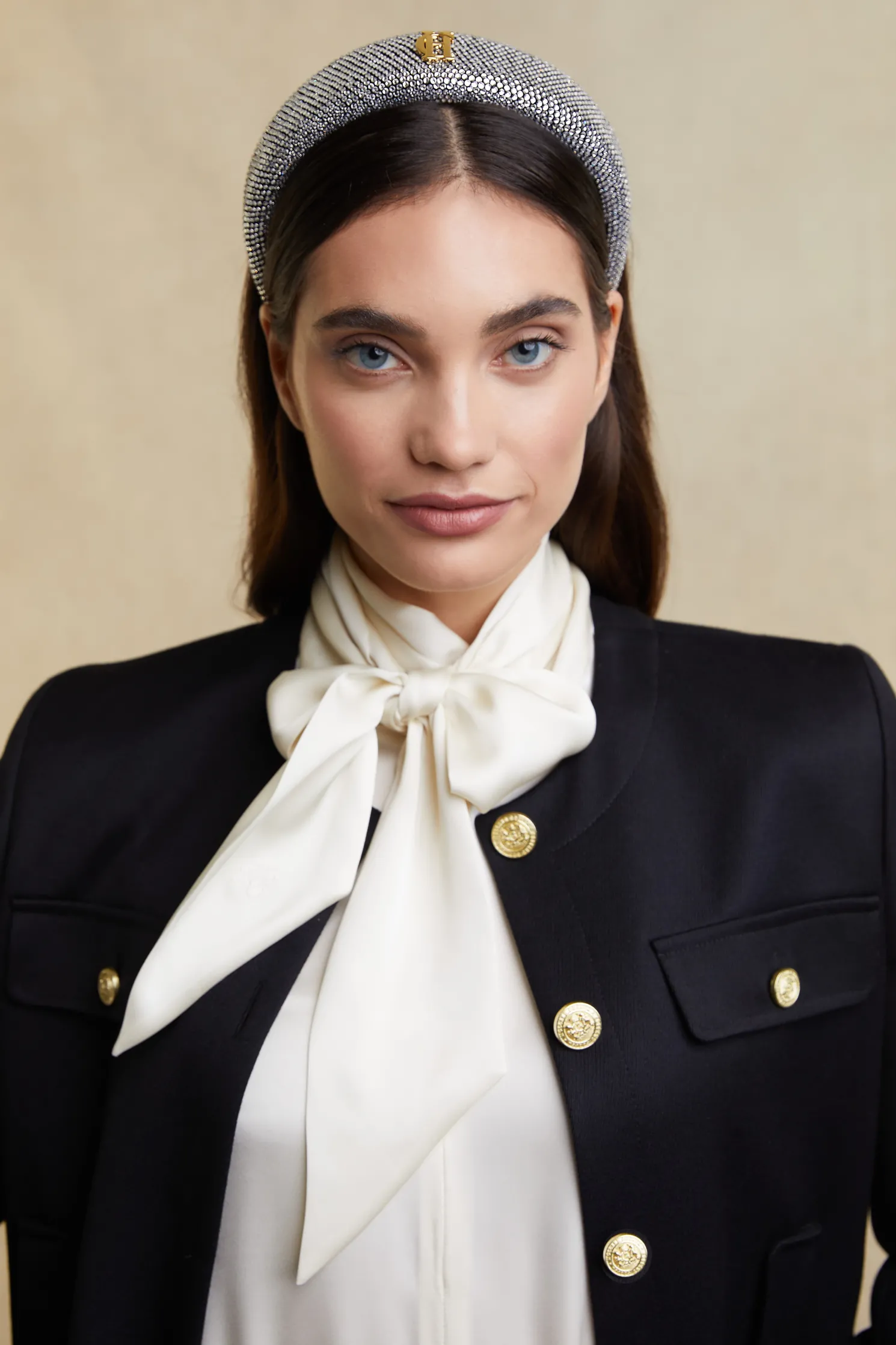 A luxurious accessory that adds a touch of sparkle to any outfit. Featuring our iconic branding with a dazzling crystal inlay, this headband shines with elegance. The wide band design offers both style and comfort, while the silver finish adds a sophisticated touch to complete your look. Perfect for elevating any outfit.
