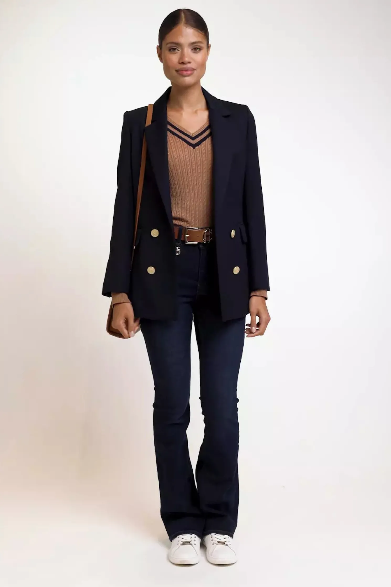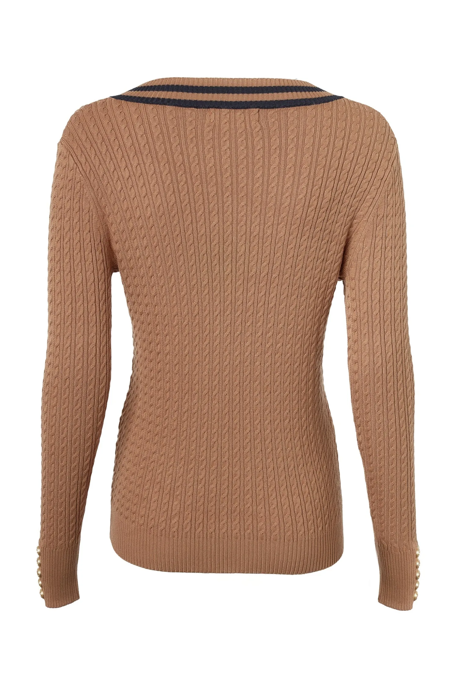 Crafted from a super soft yarn, this jumper has been designed with a slim silhouette with a deep v-neckline. With a distinctive cable knit design and contrasting stripe detail, this jumper is ideal for elevating your everyday style. Elevated with our iconic hardware on the cuffs.